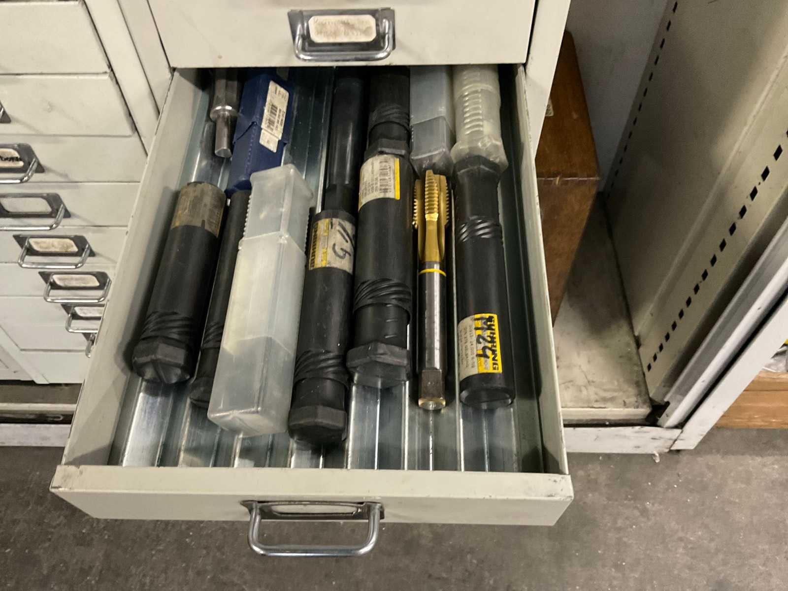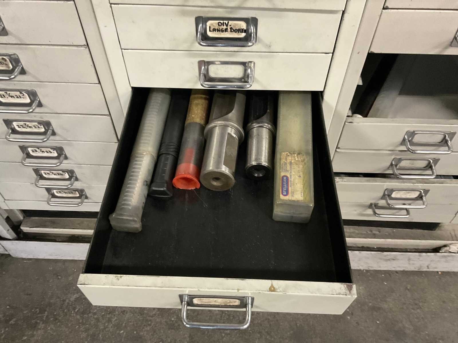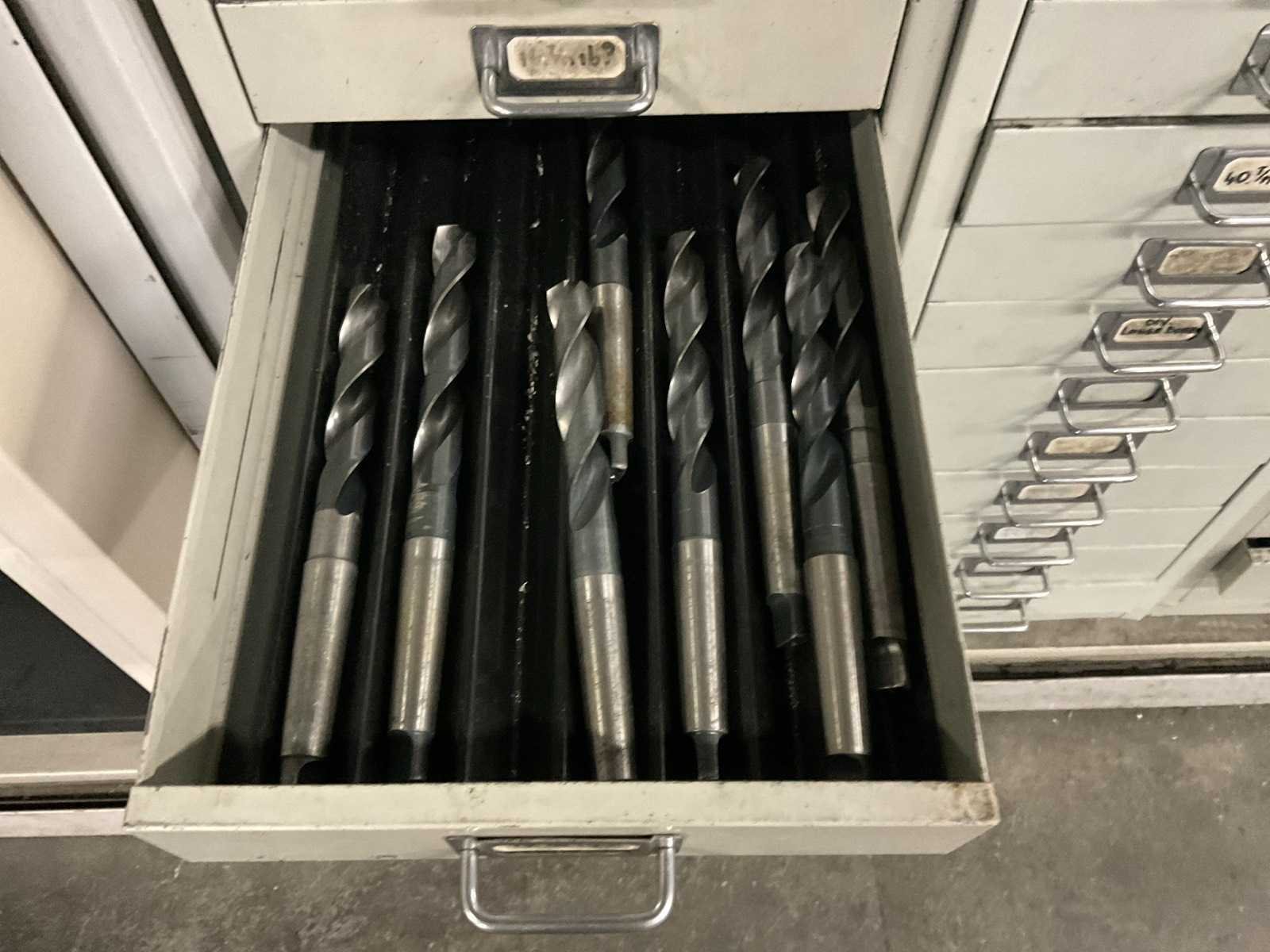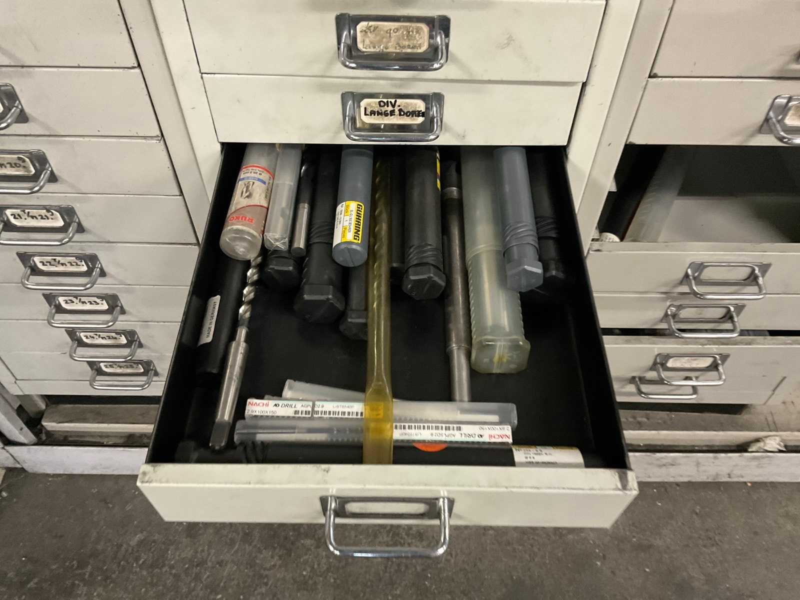 Waaronder: vaste ruimers, wisselsnijplaatjes, verzinkboren. incl. werkplaatskast; afm. ca. 120x47x195 c,m