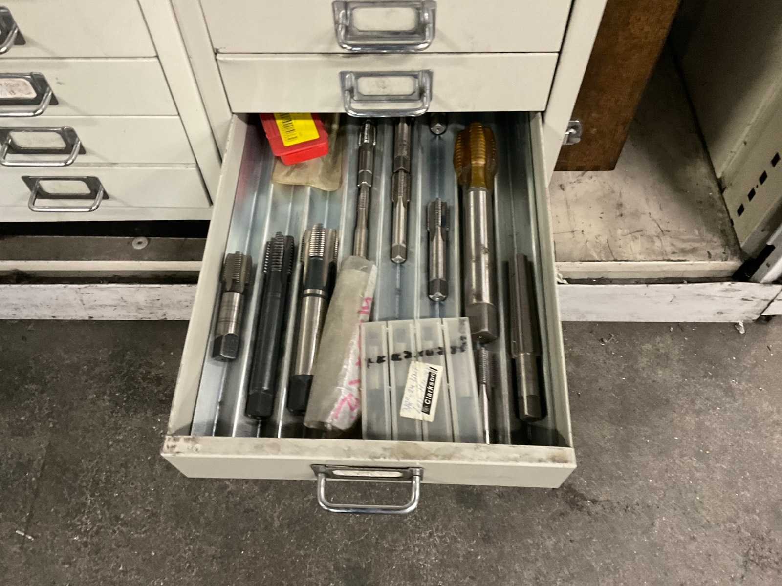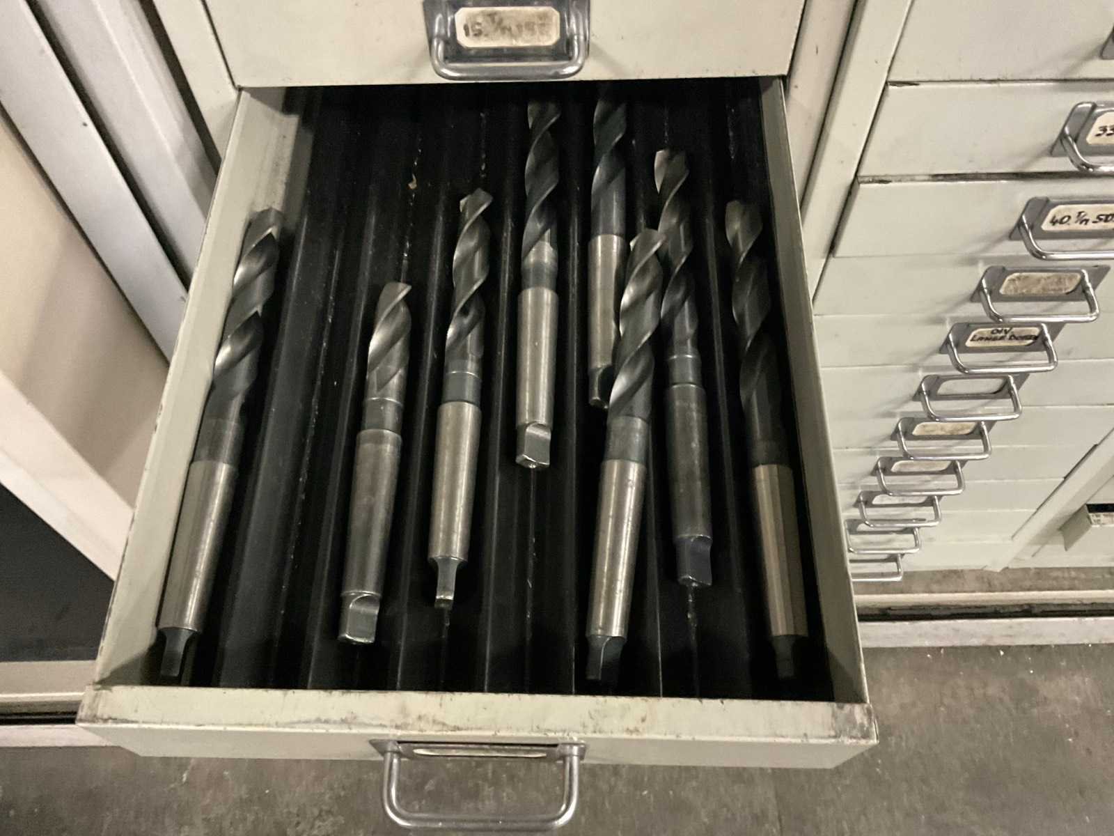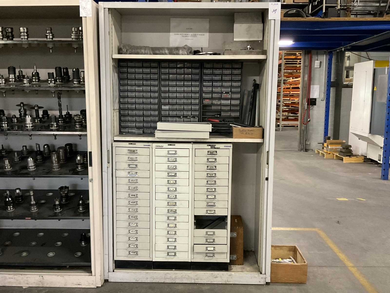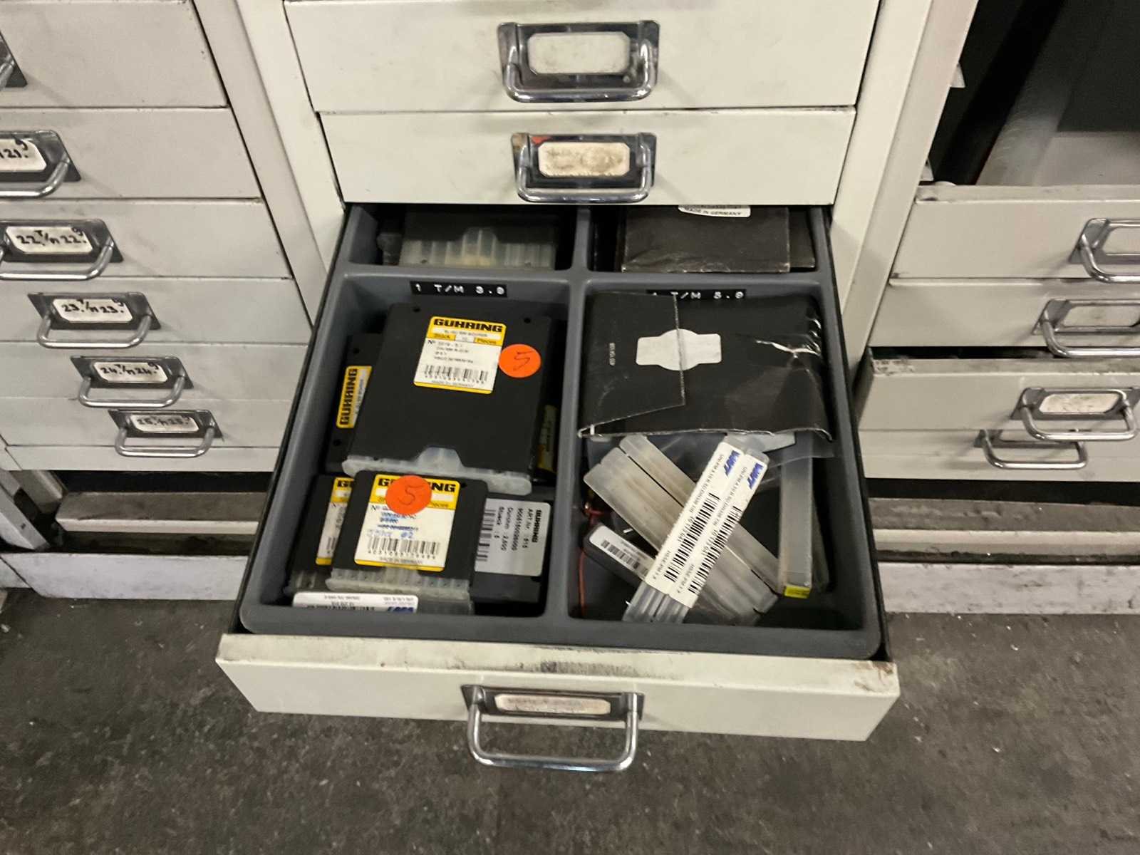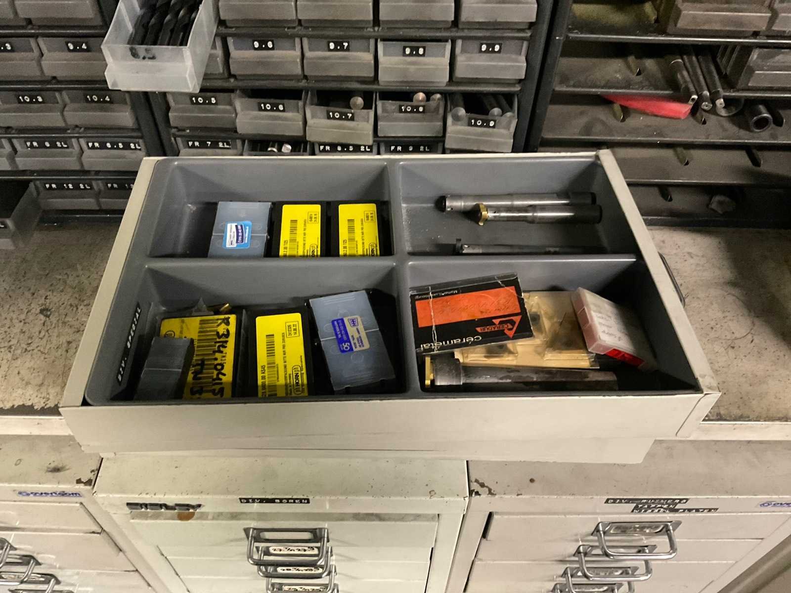 Waaronder: vaste ruimers, wisselsnijplaatjes, verzinkboren. incl. werkplaatskast; afm. ca. 120x47x195 c,m