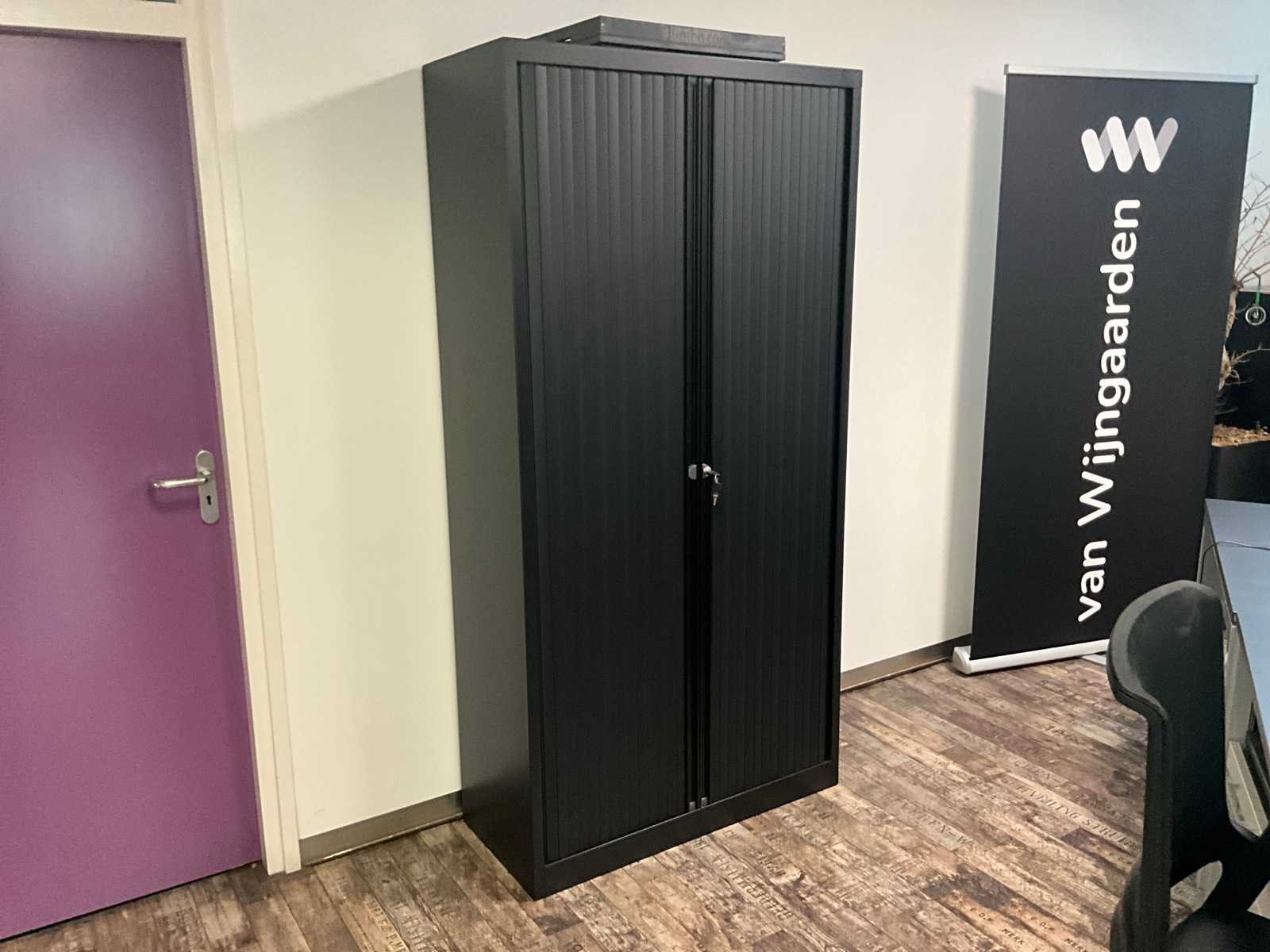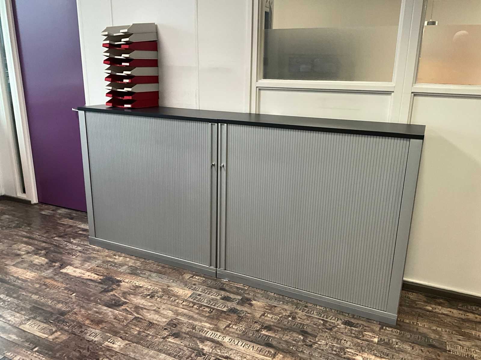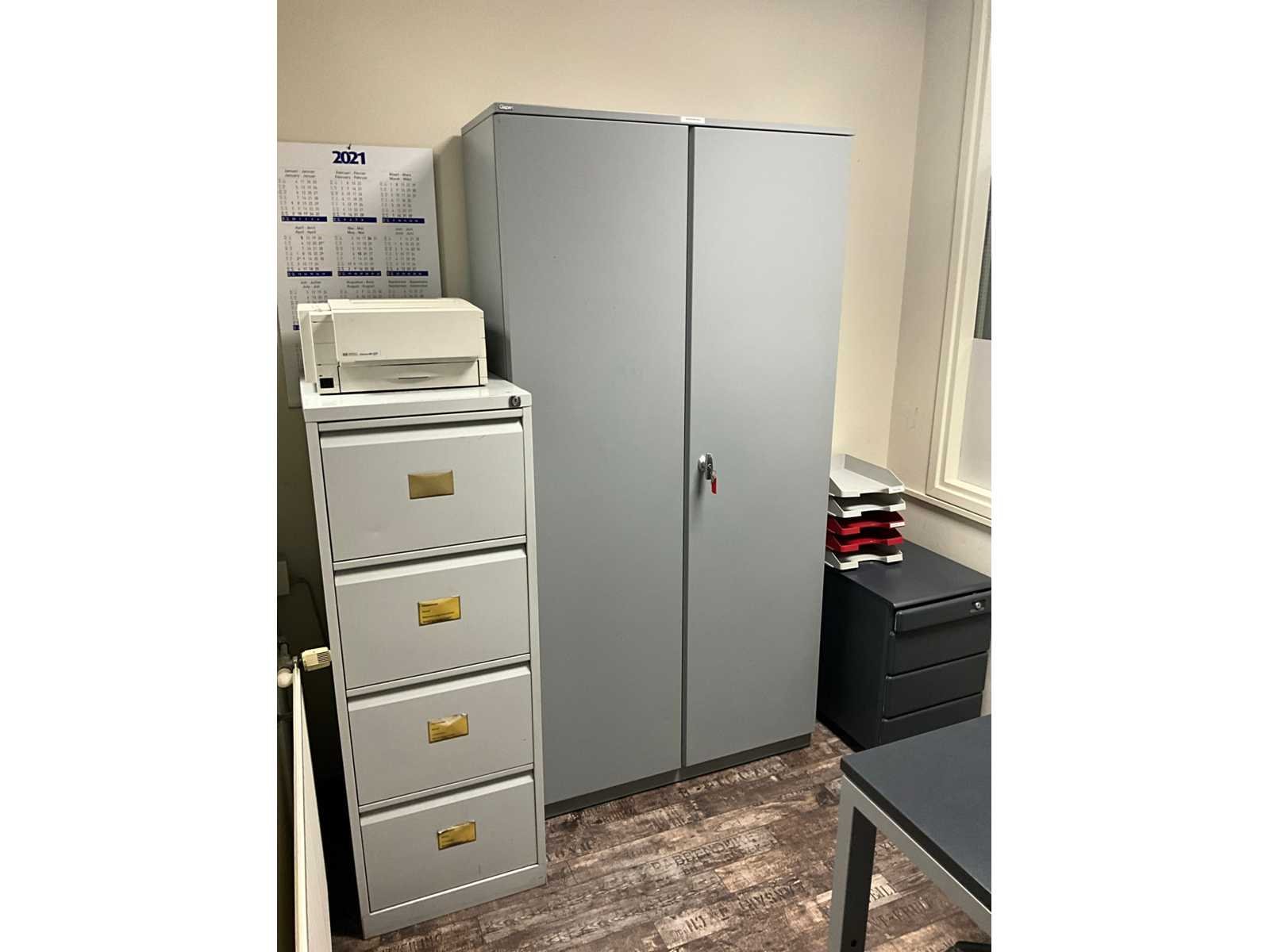 Bestaande uit 2 bureauopstellingen met stoelen en ladeblokken; 3 archiefkasten; 2-deurs kast en plantenbakken