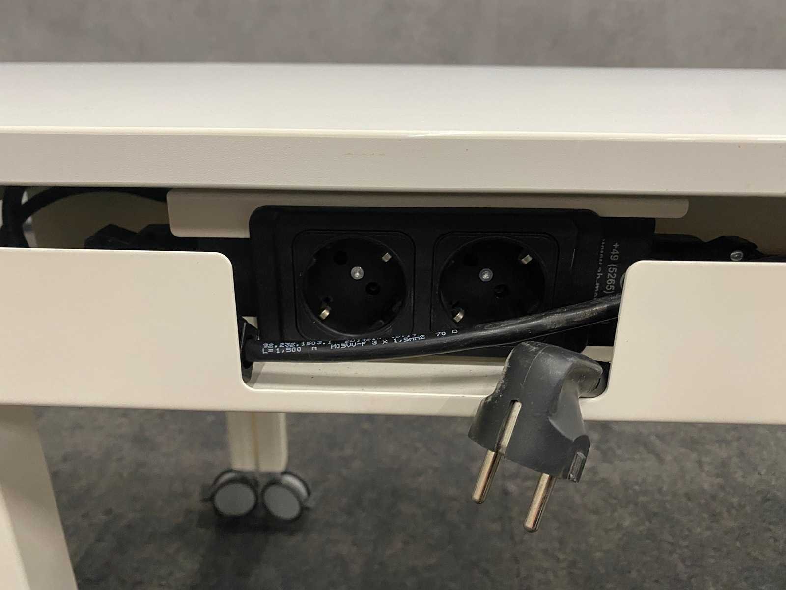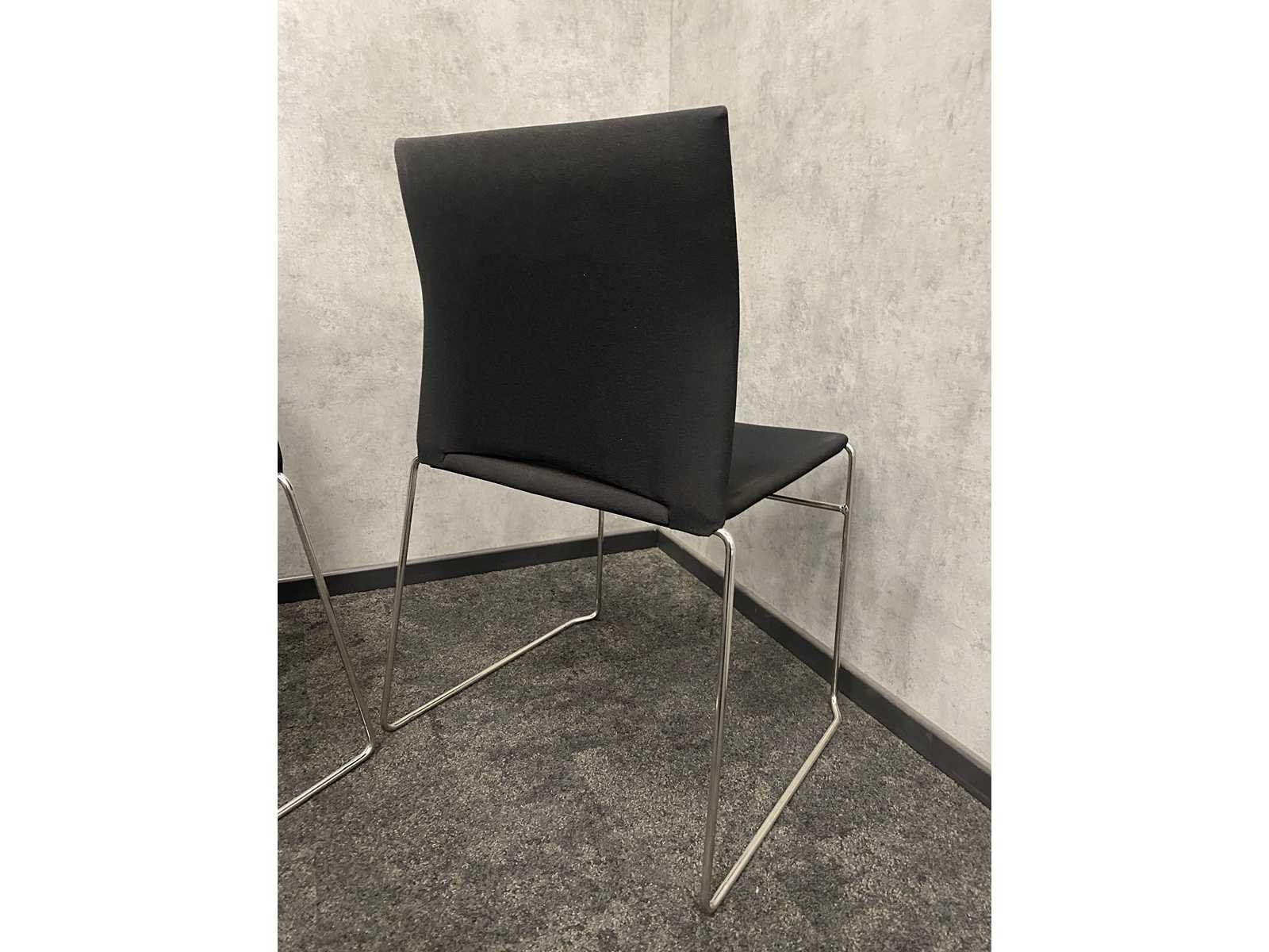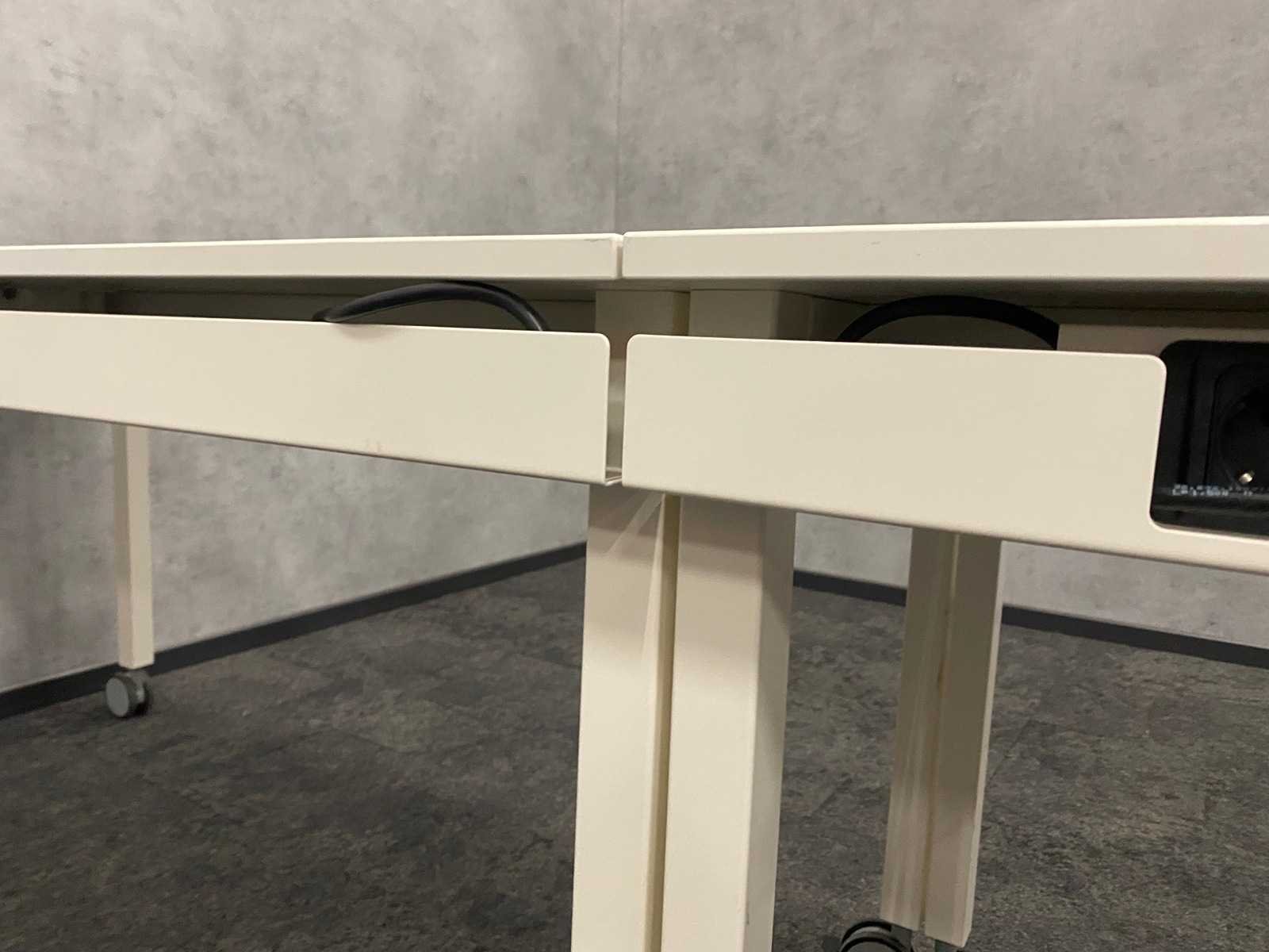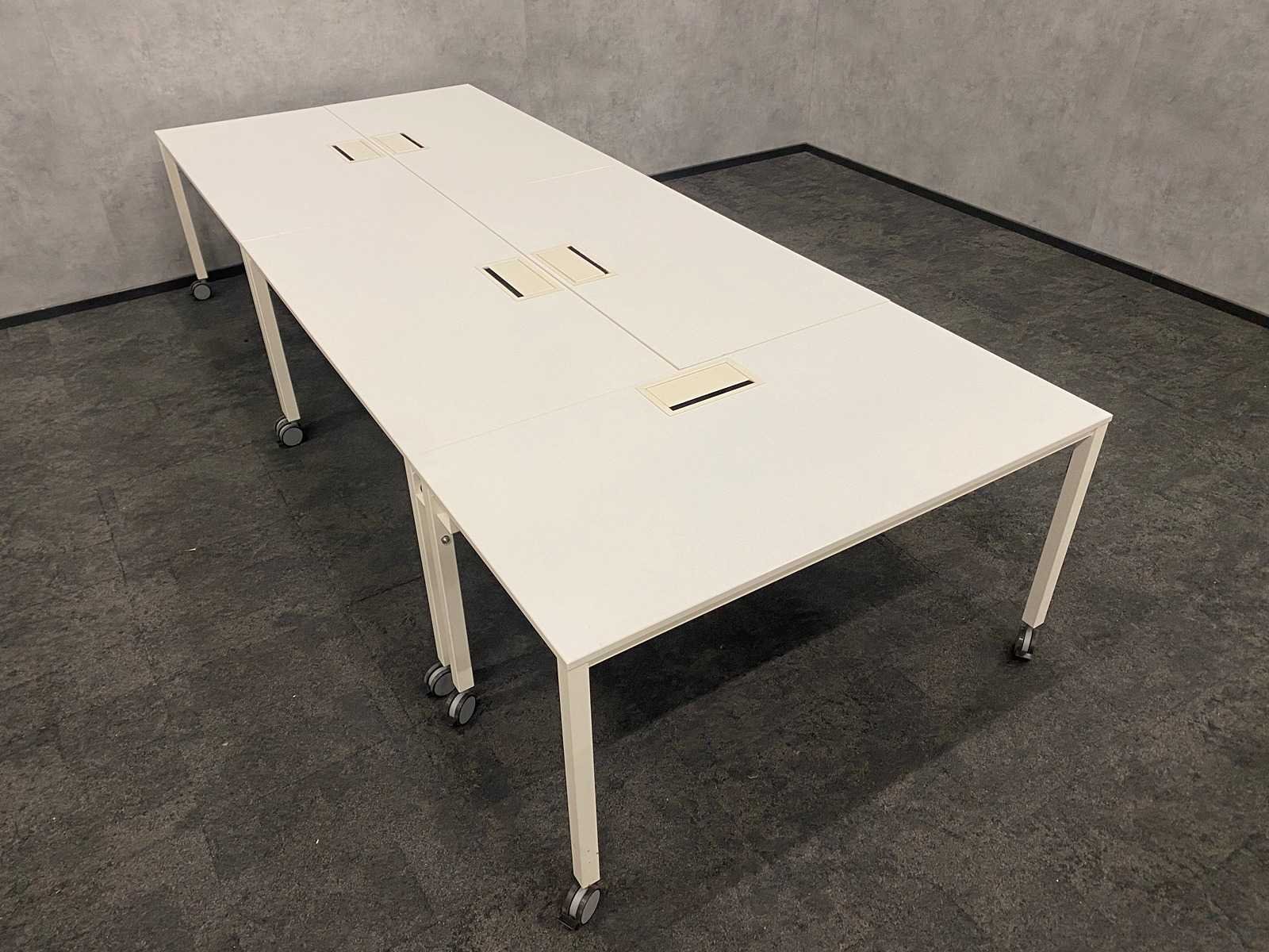 Kavel bestaande uit 5x Gispen mobiele conferentietafel v.v. inbouwmodule, draadgoot en wielen. ---- 10x Connection stapelbare conferentiestoel v.v. zwarte stoffering en chroom sledeframe. Merk: Gispen/ Connection Kleur: zwart, wit, chroom