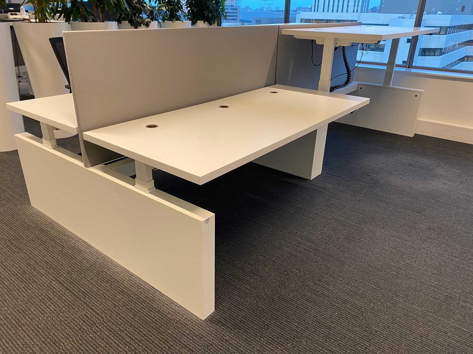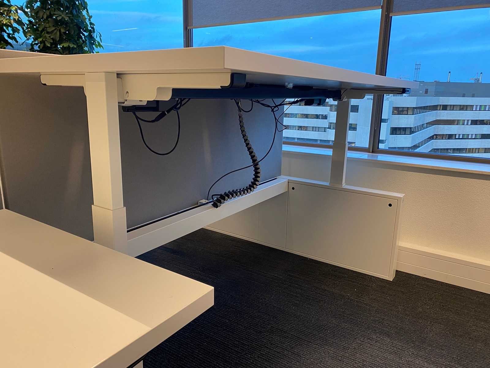 Kavel bestaande uit 1x Vepa 4p workbench en 4x WeWork bureaustoel. ----- Bureaustoel v.v. in hoogte instelbare armleggers, zithoogte instelbaar, kantelmechanisme rugleuning, netweave rugbekleding. ----- Workbench v.v. akoestische grijze scheidingswanden, kabeldoorvoer, draadgoot. Totale afmeting workbench ca. hoogte 65 tot 131 cm. - breed 360 cm. - diep 168 cm. ----- Workbench is reeds volledig professioneel gedemonteerd en onverpakt. ----- bladafmeting per bureau is ca. 180x80 cm. Merk: Vepa Zit-sta: true Elektrisch verstelbaar: true