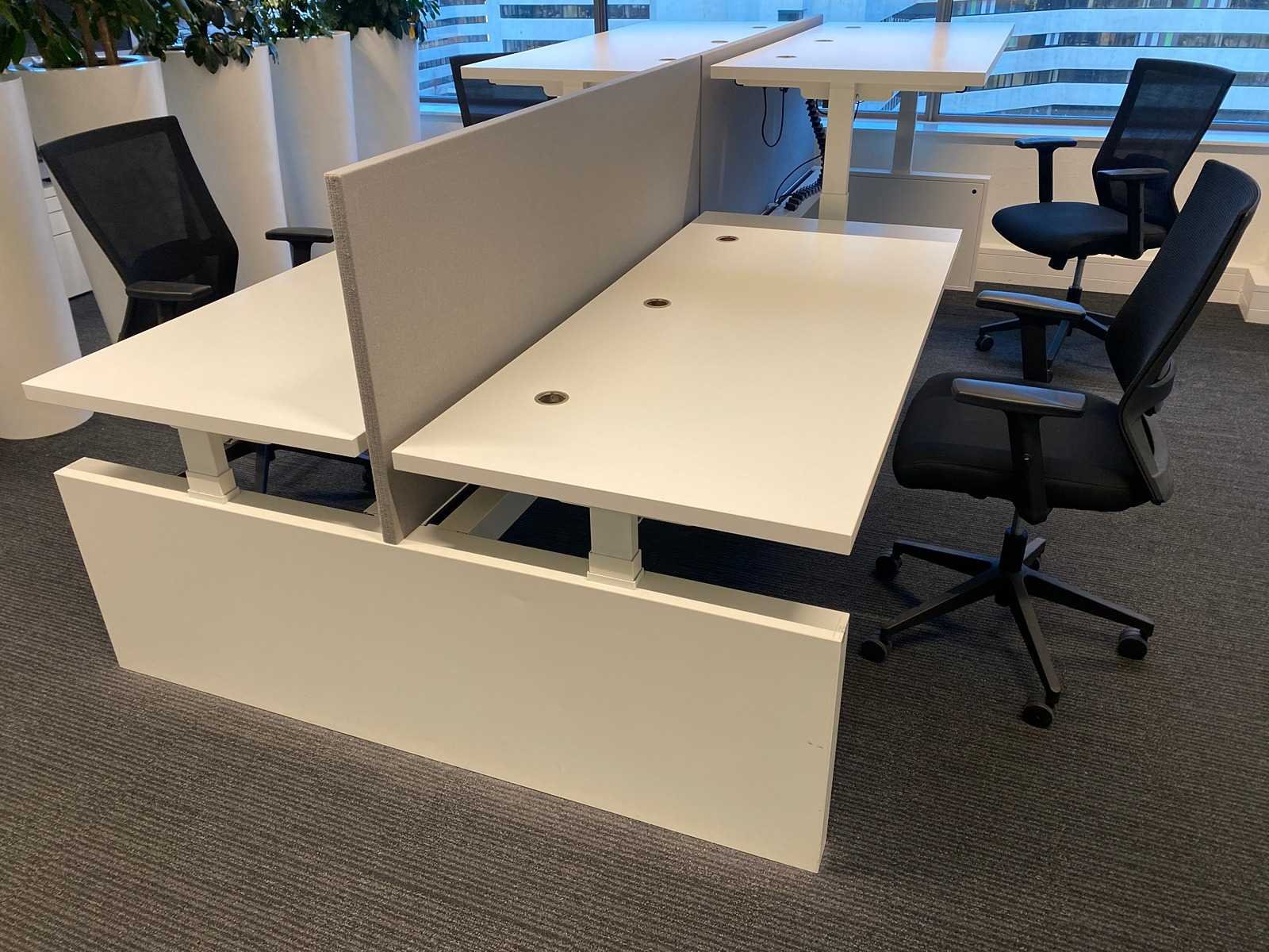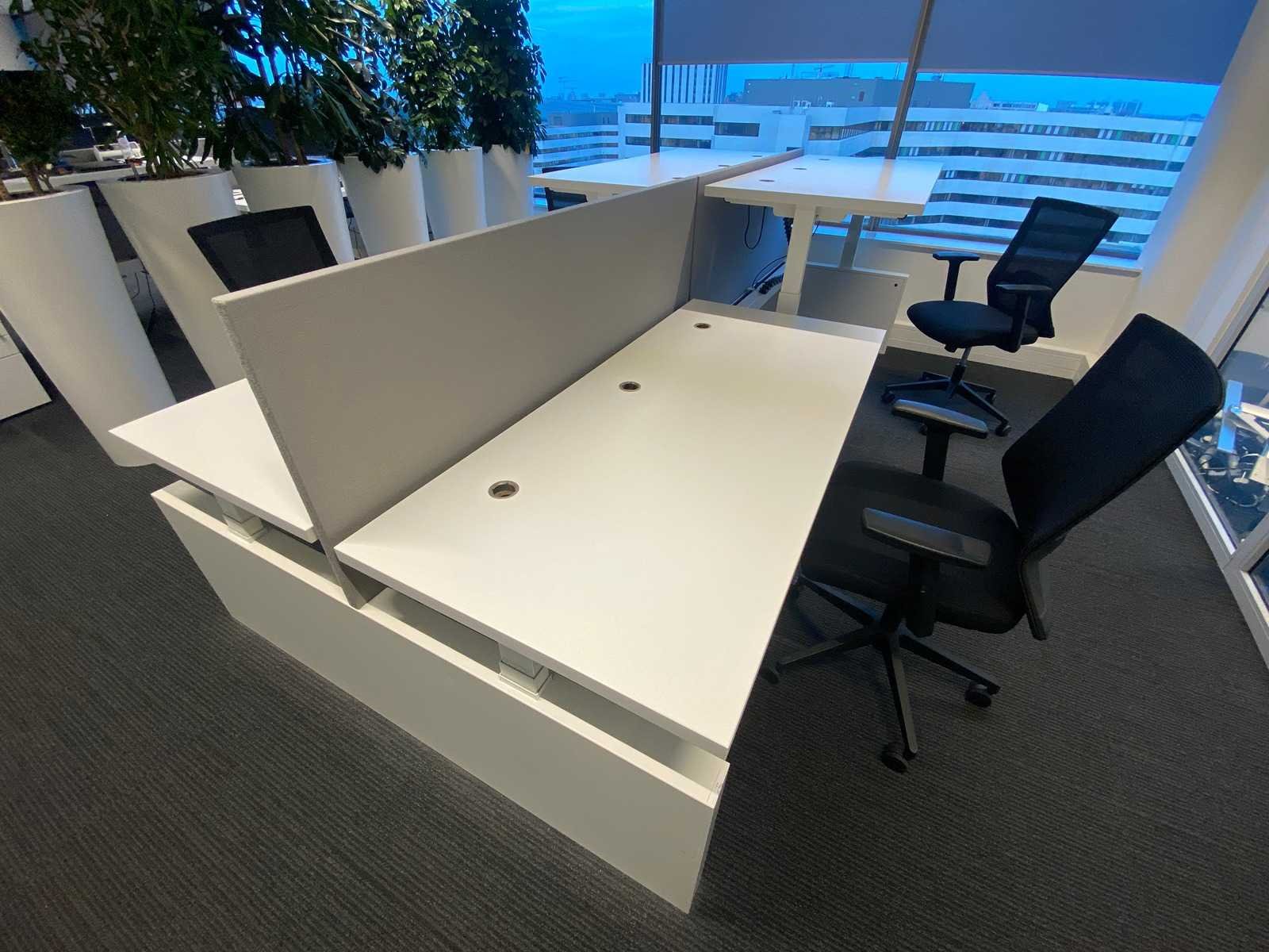 Kavel bestaande uit 1x Vepa 4p workbench en 4x WeWork bureaustoel. ----- Bureaustoel v.v. in hoogte instelbare armleggers, zithoogte instelbaar, kantelmechanisme rugleuning, netweave rugbekleding. ----- Workbench v.v. akoestische grijze scheidingswanden, kabeldoorvoer, draadgoot. Totale afmeting workbench ca. hoogte 65 tot 131 cm. - breed 360 cm. - diep 168 cm. ----- Workbench is reeds volledig professioneel gedemonteerd en onverpakt. ----- bladafmeting per bureau is ca. 180x80 cm. Merk: Vepa Zit-sta: true Elektrisch verstelbaar: true