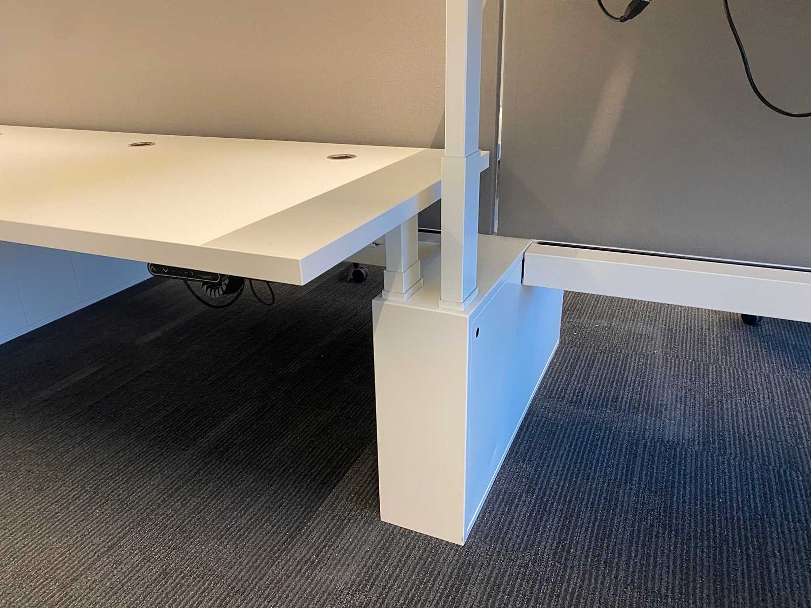 Kavel bestaande uit 1x Vepa 4p workbench en 4x WeWork bureaustoel. ----- Bureaustoel v.v. in hoogte instelbare armleggers, zithoogte instelbaar, kantelmechanisme rugleuning, netweave rugbekleding. ----- Workbench v.v. akoestische grijze scheidingswanden, kabeldoorvoer, draadgoot. Totale afmeting workbench ca. hoogte 65 tot 131 cm. - breed 360 cm. - diep 168 cm. ----- Workbench is reeds volledig professioneel gedemonteerd en onverpakt. ----- bladafmeting per bureau is ca. 180x80 cm. Merk: Vepa Zit-sta: true Elektrisch verstelbaar: true