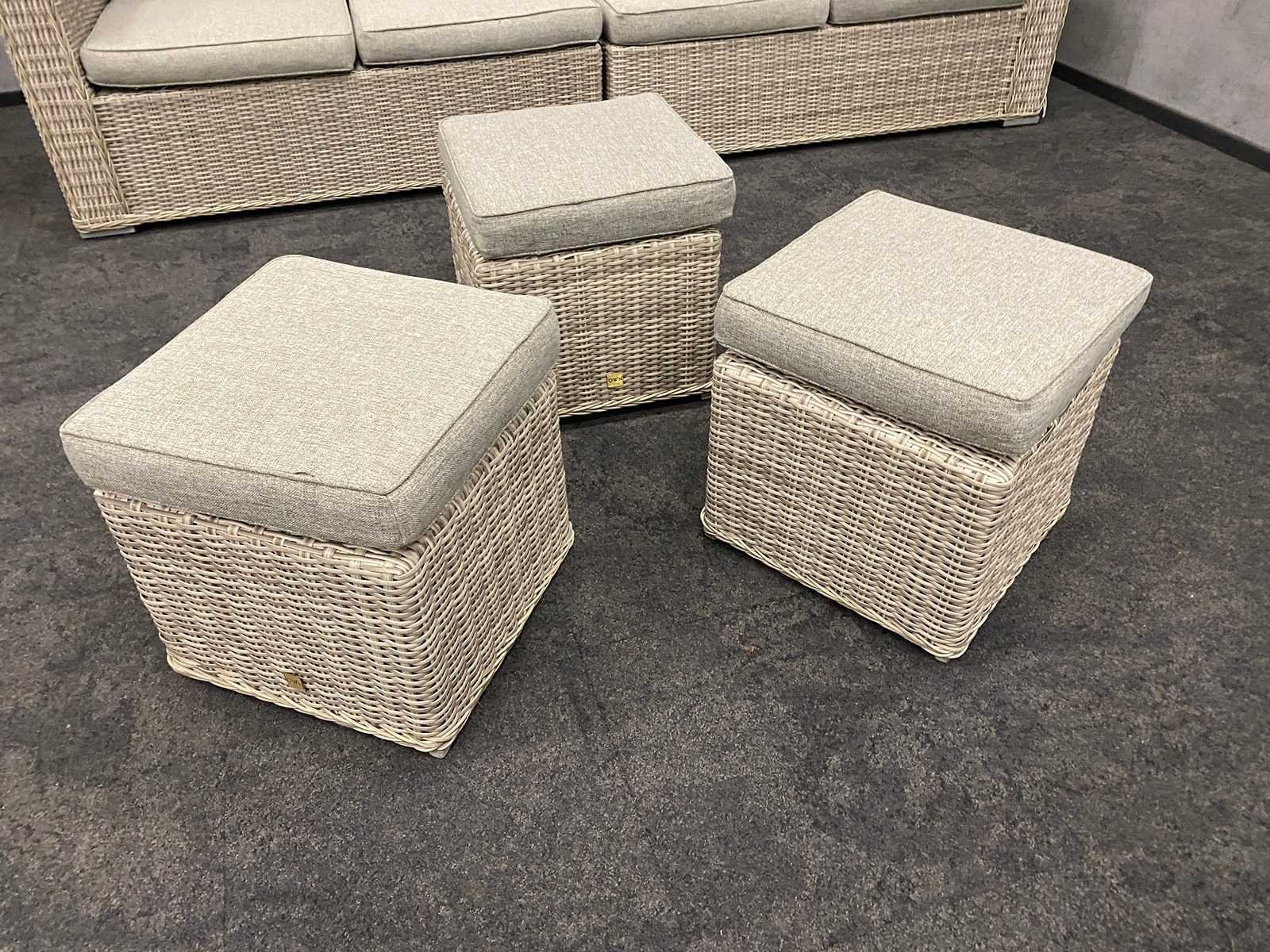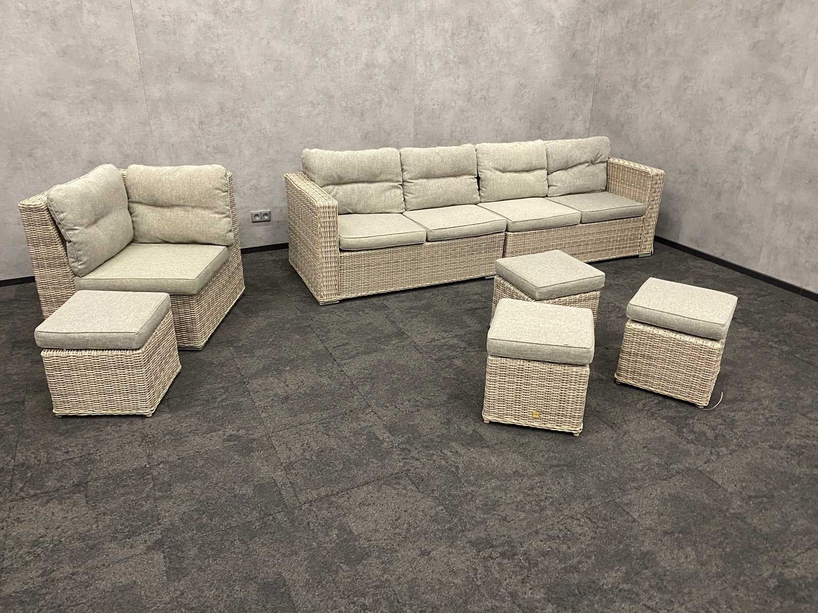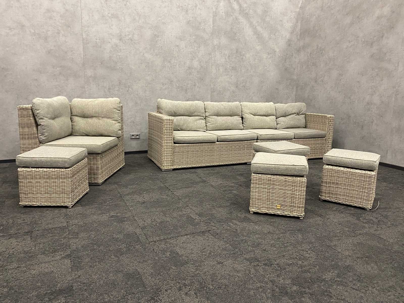 Afm. sofa ca. hxbxd 85x285x87 cm. -- Afm. stoel ca. hxbxd 85x88x86 cm. -- Afm. hockers ca. hxbxd 46x46x46 cm. Merk: Your Own Living Kussens: true Zithoogte: 47