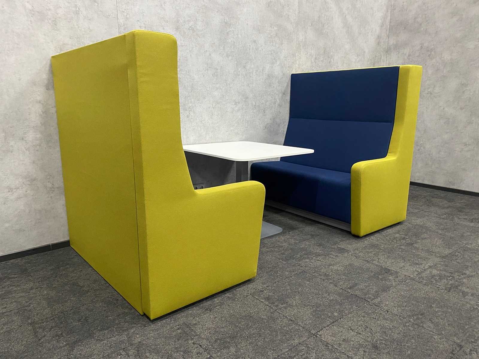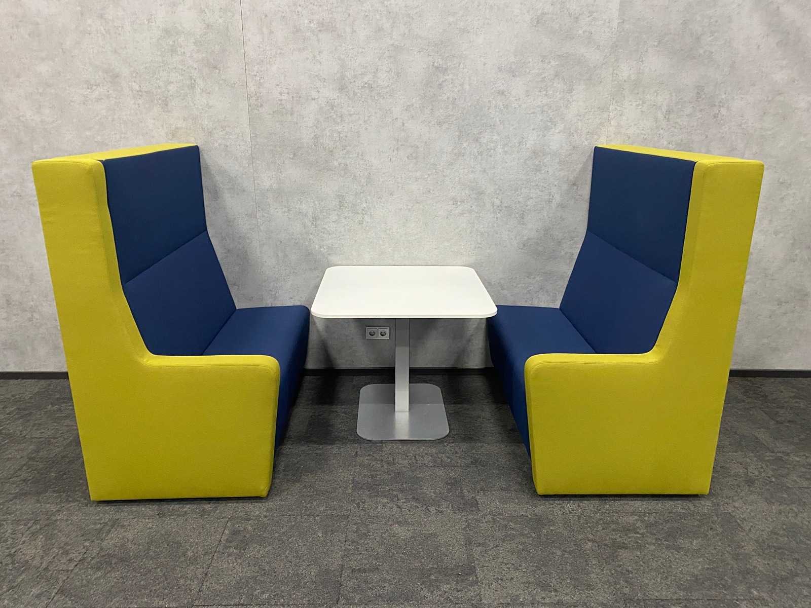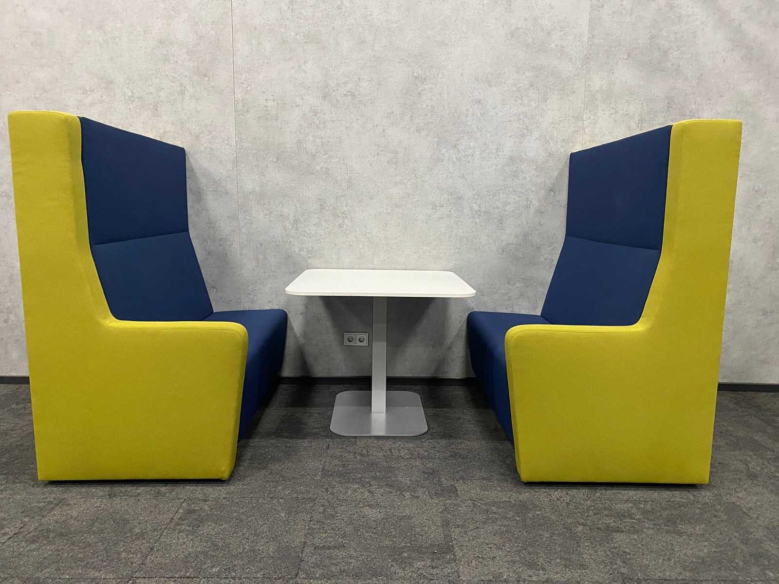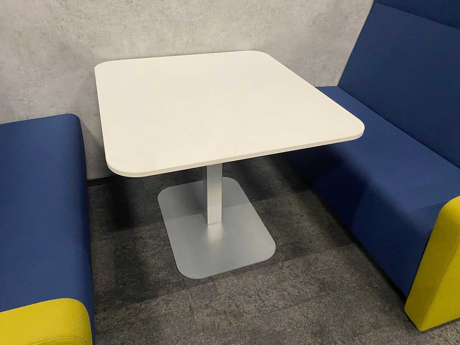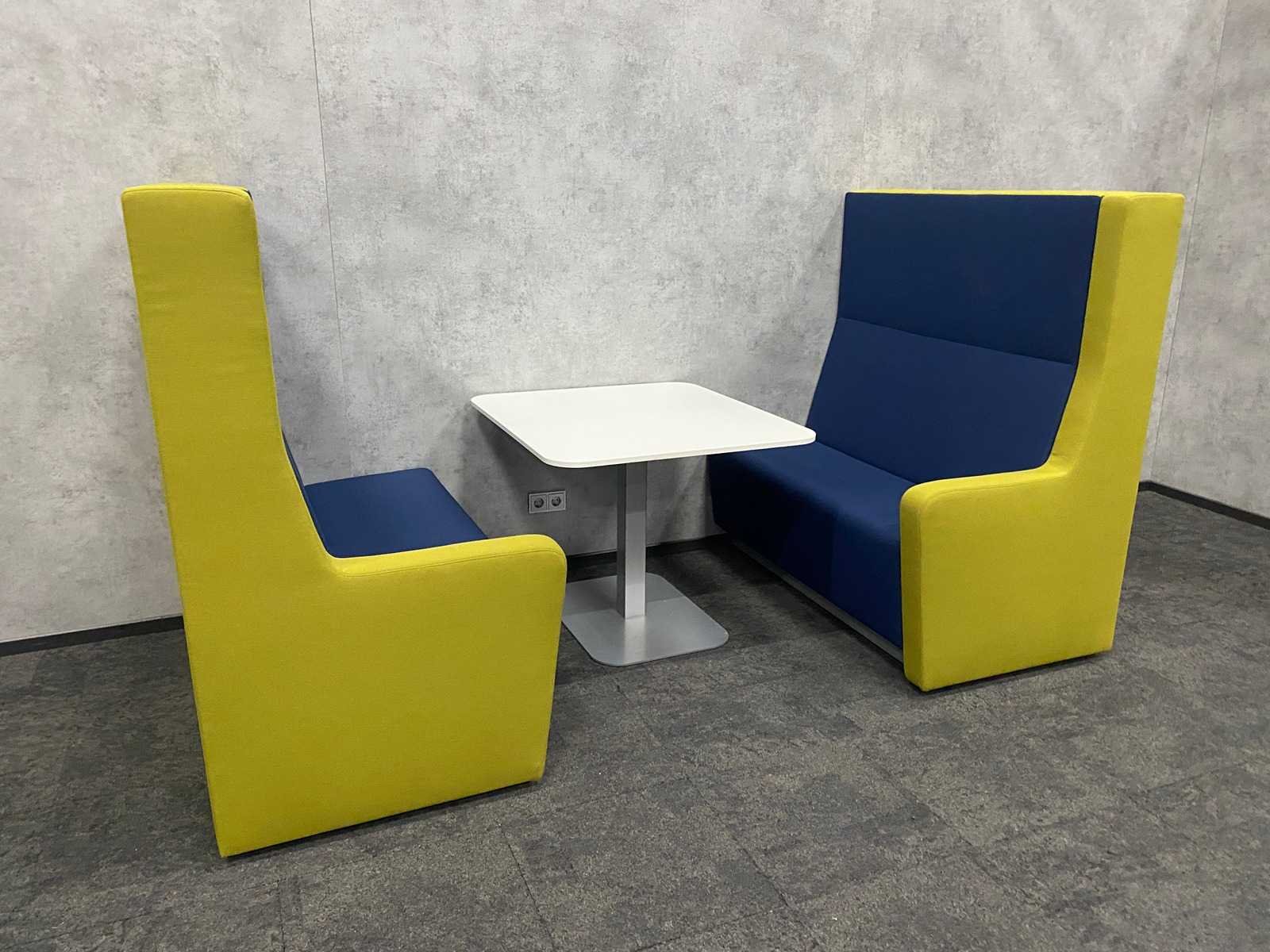 Afm. sofa ca. hxbxd 146x140x80 cm. zithoogte ca. 49 cm. ----- Afm. tafel ca. hxbxd 74.5x90x100 cm. Kleur: blauw groen, wit