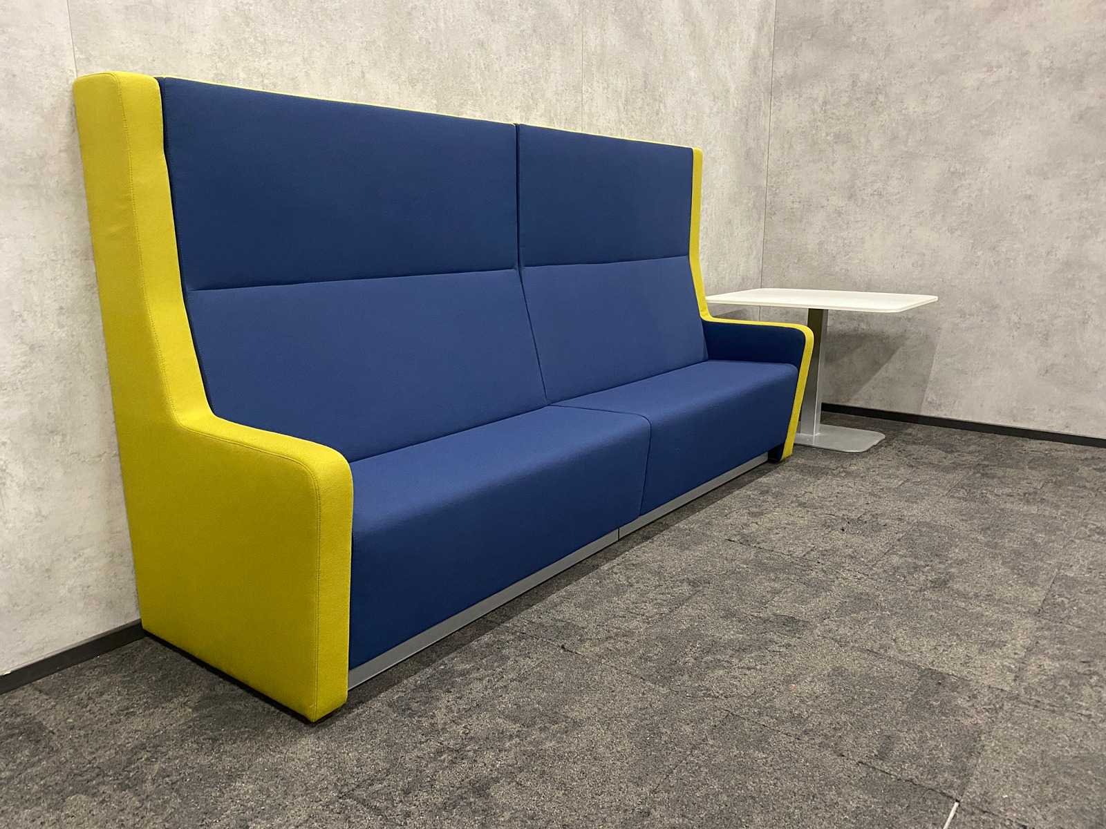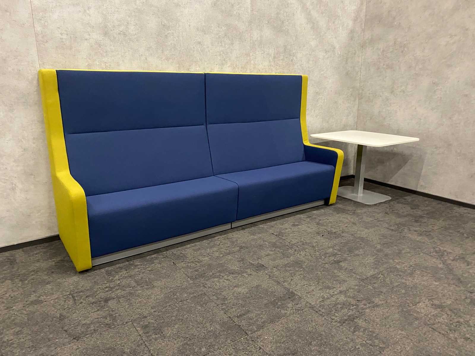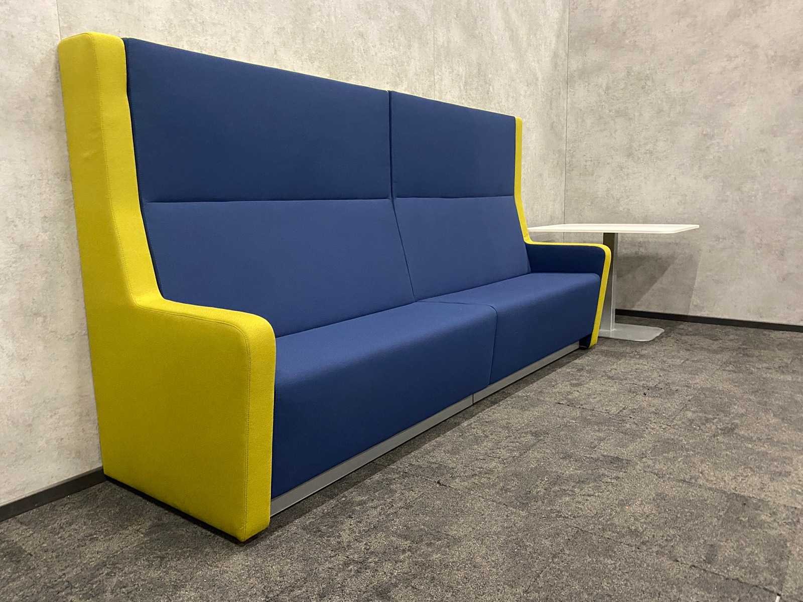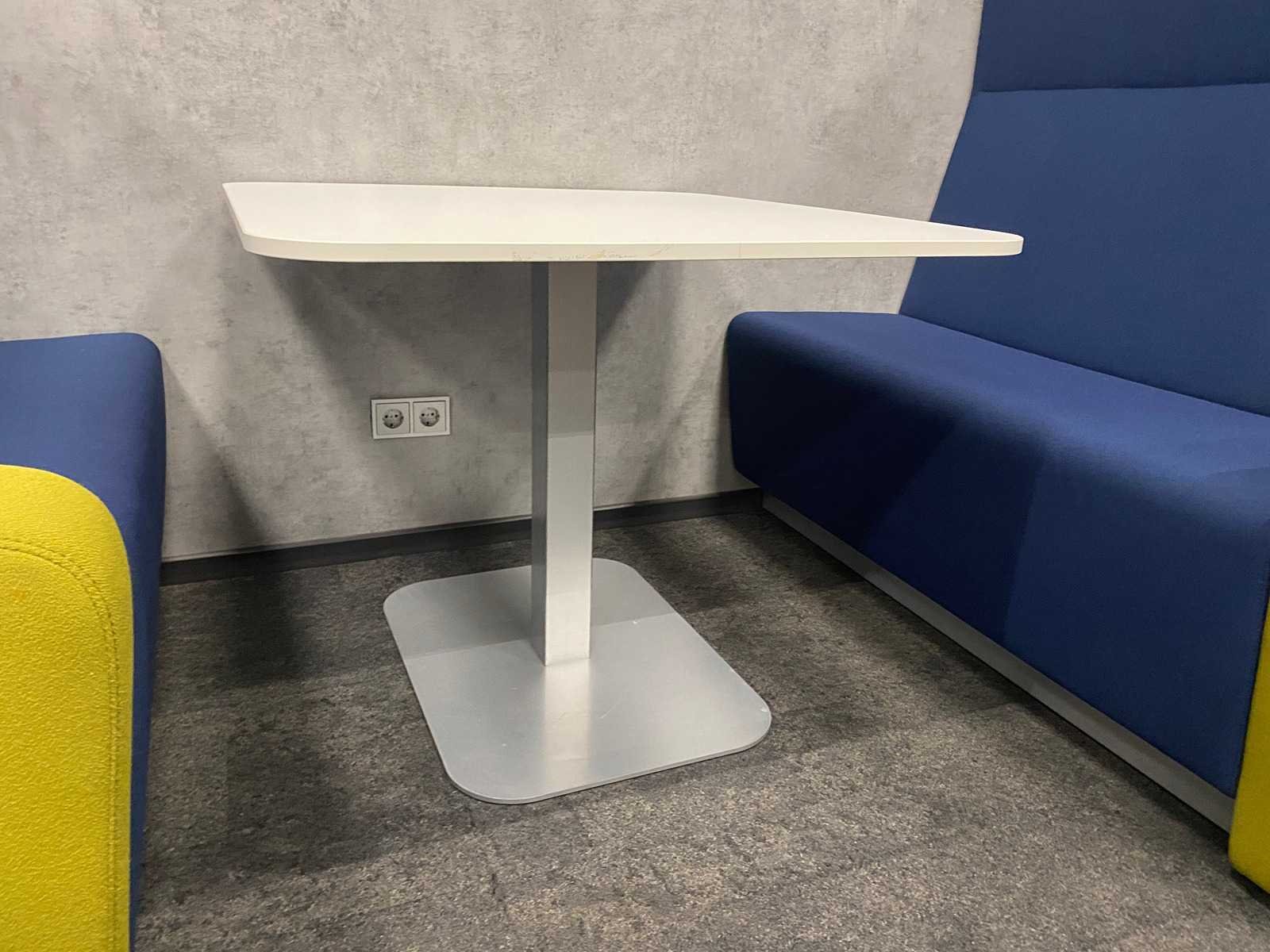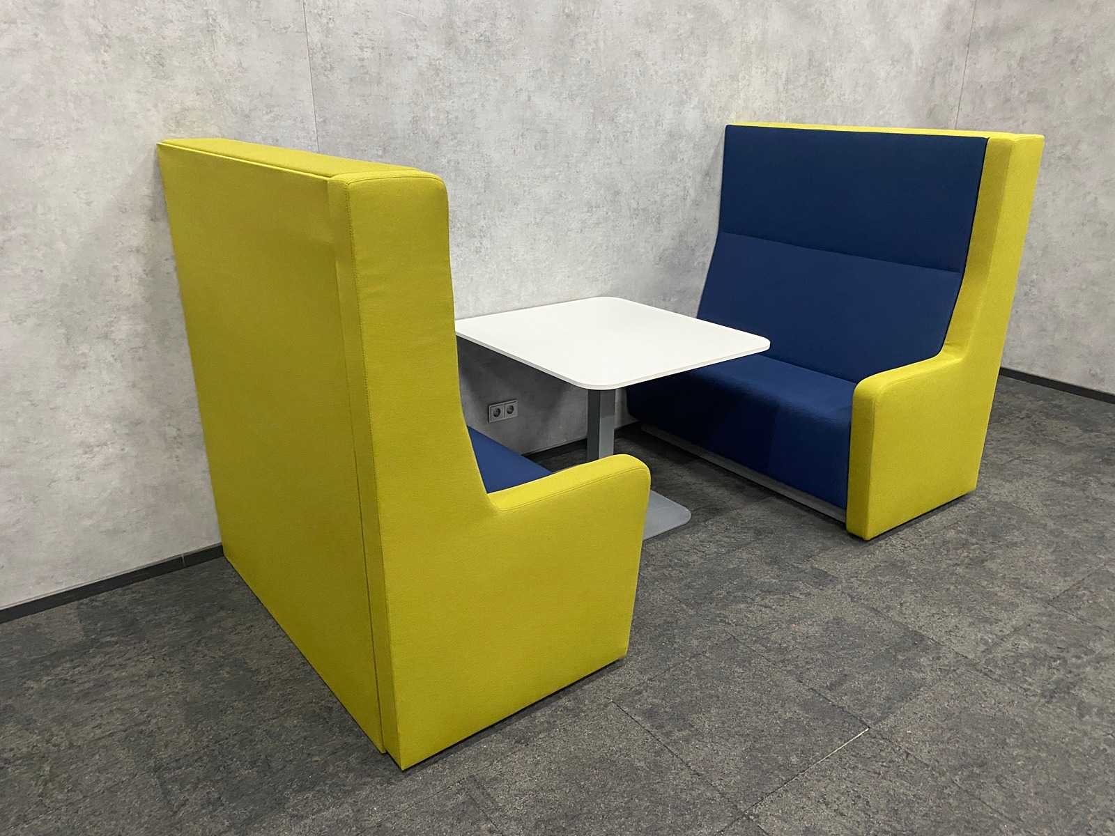 Afm. sofa ca. hxbxd 146x140x80 cm. zithoogte ca. 49 cm. ----- Afm. tafel ca. hxbxd 74.5x90x100 cm. Kleur: blauw groen, wit
