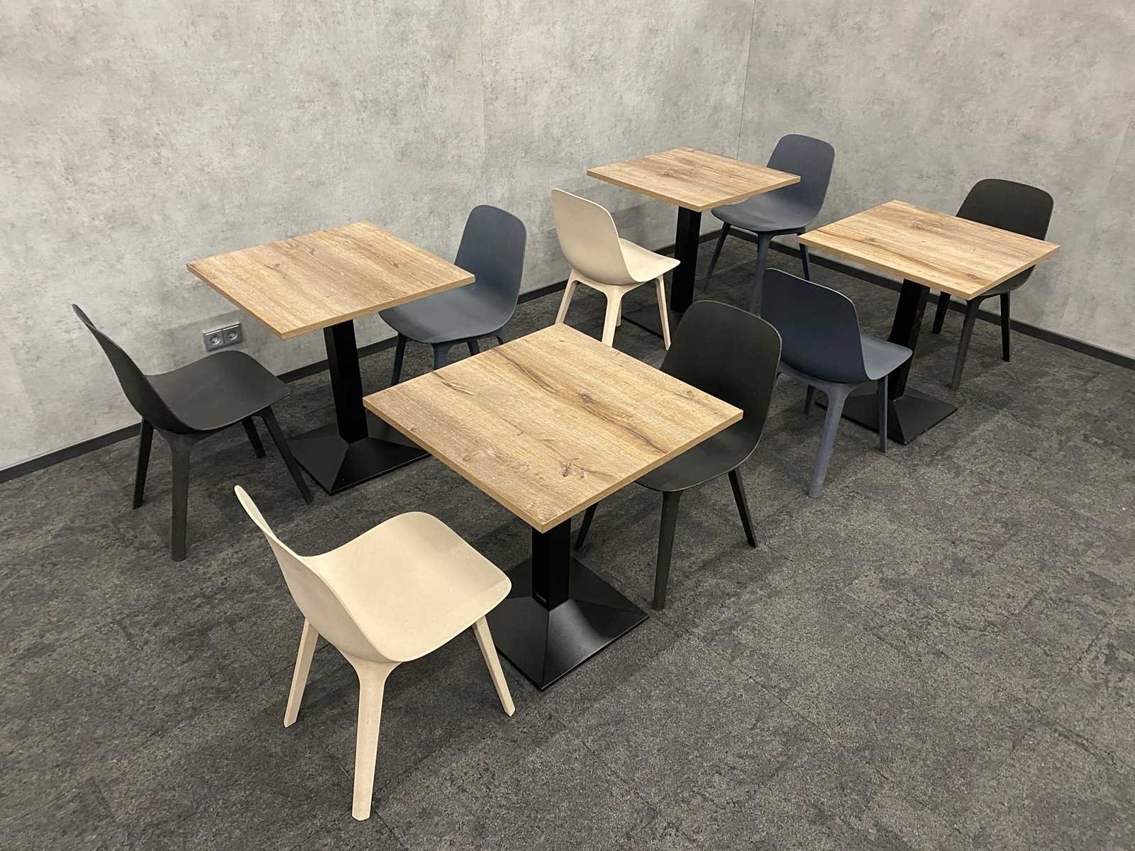 Kavel bestaande uit 4x De Arend tafel. Afm. ca. hxbxd 75x70x70 cm. -- 8x Ikea kunststof assorti stoel Merk: De Arend/ Ikea