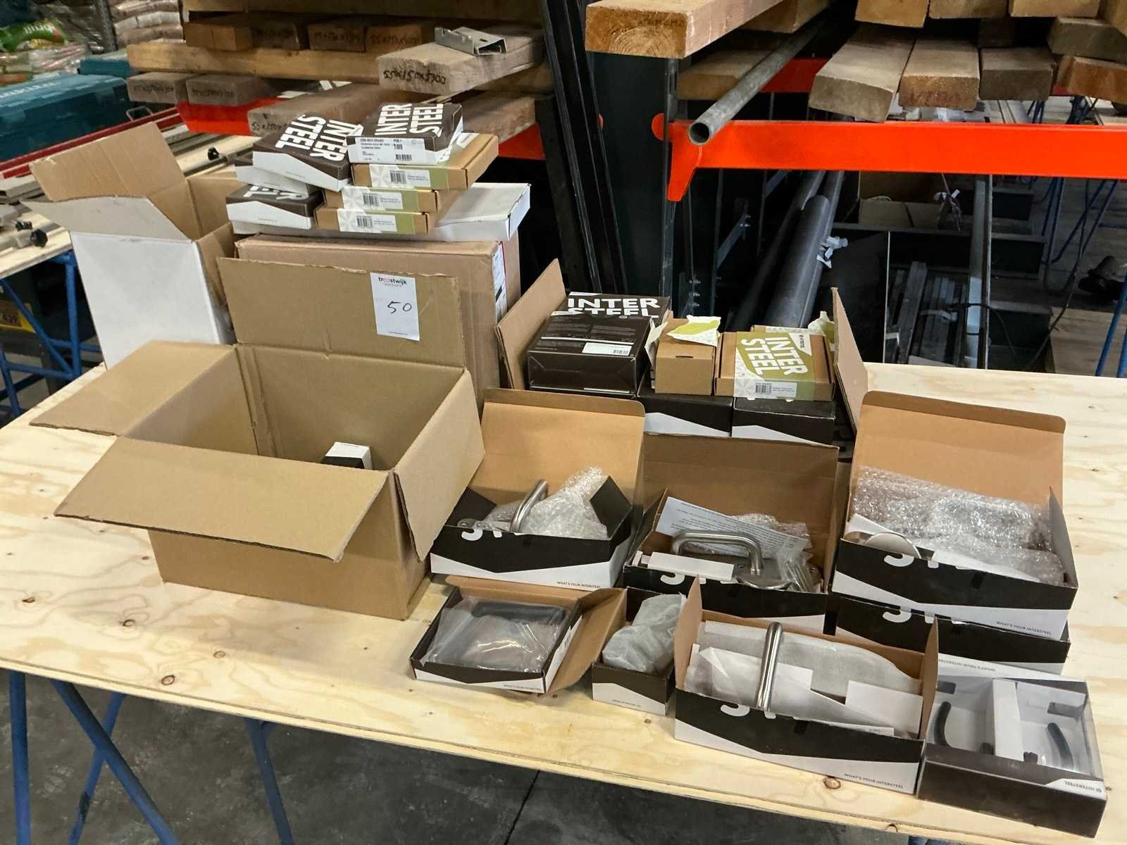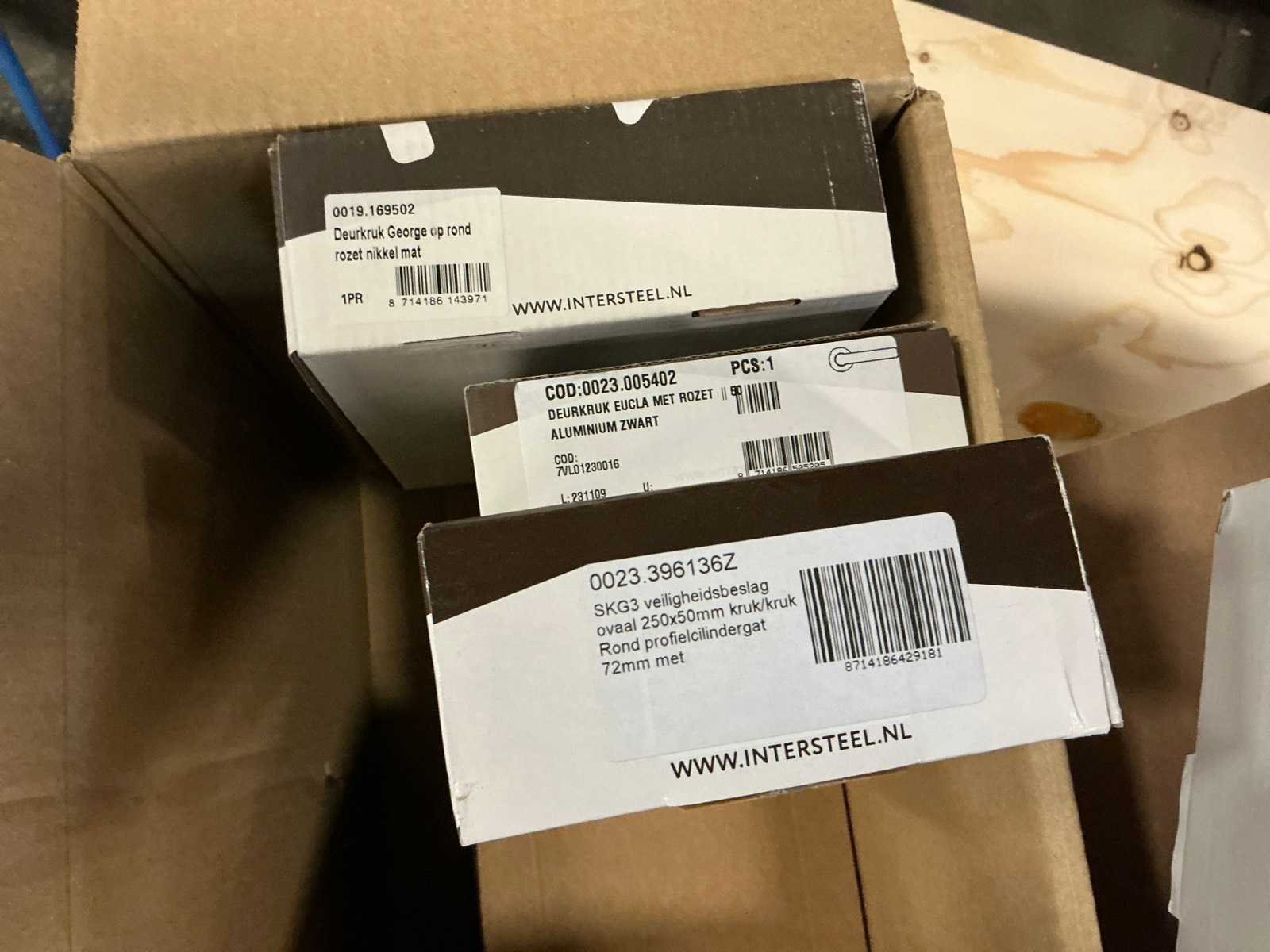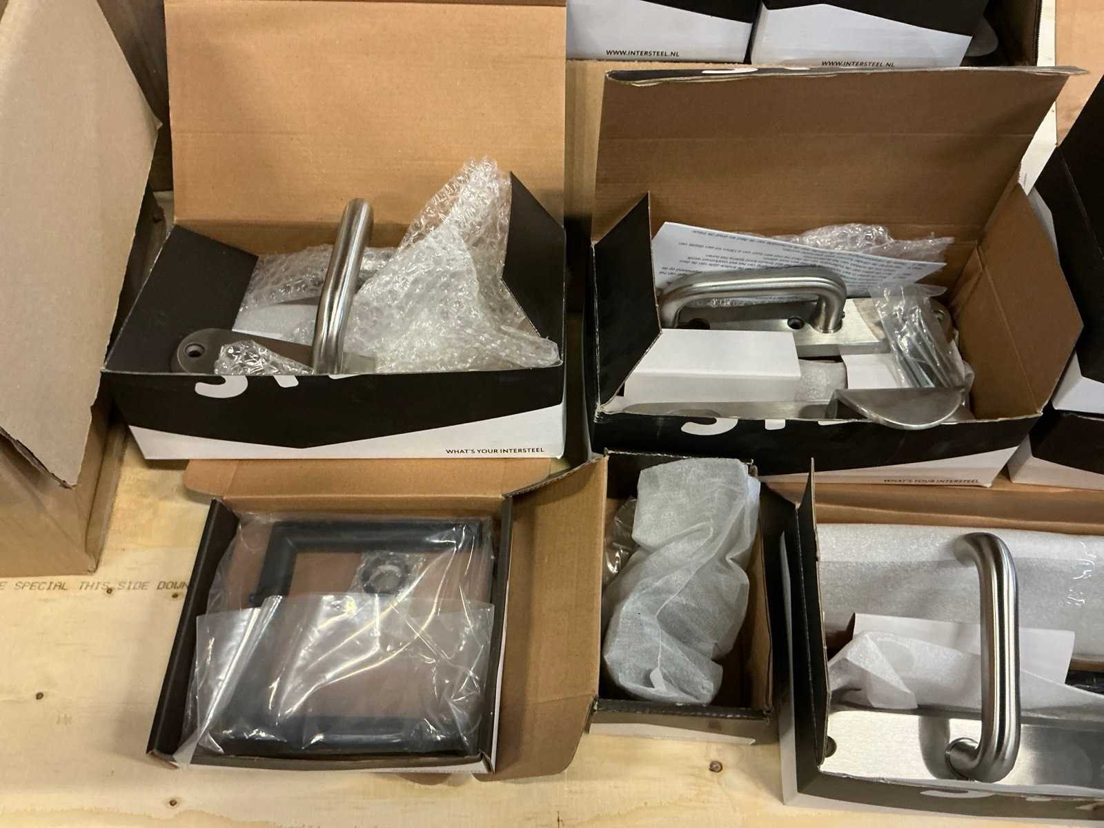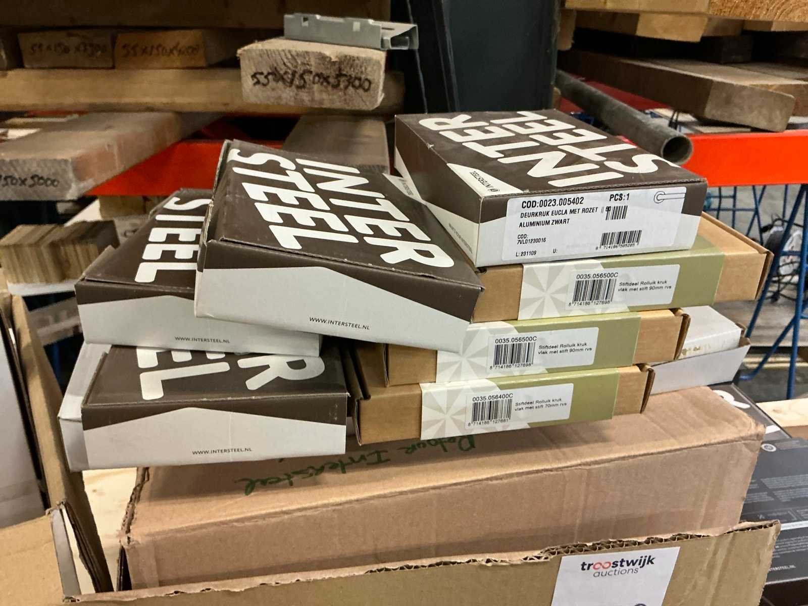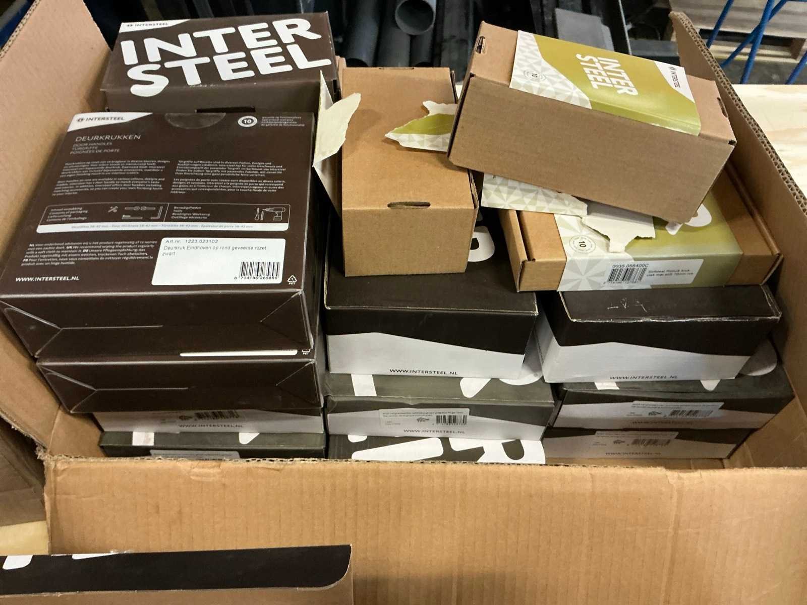 Bestaande uit diverse deurklinken, sleutelplaatjes, stiftdelen voor rolluiken, deurkrukken en dergelijke van Intersteel. Merk: Intersteel