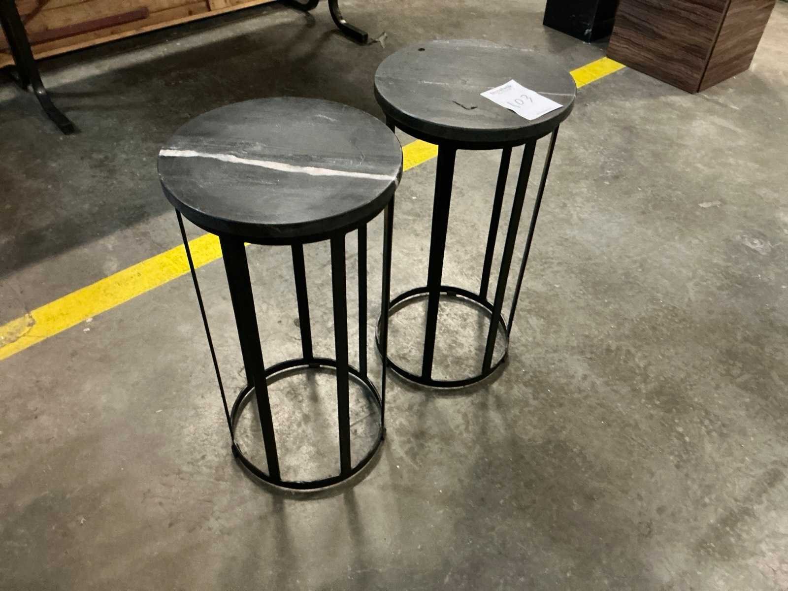 Stenen tafelblad, metalen onderstel. Lengte: 32cm Breedte: 32cm Hoogte: 61cm