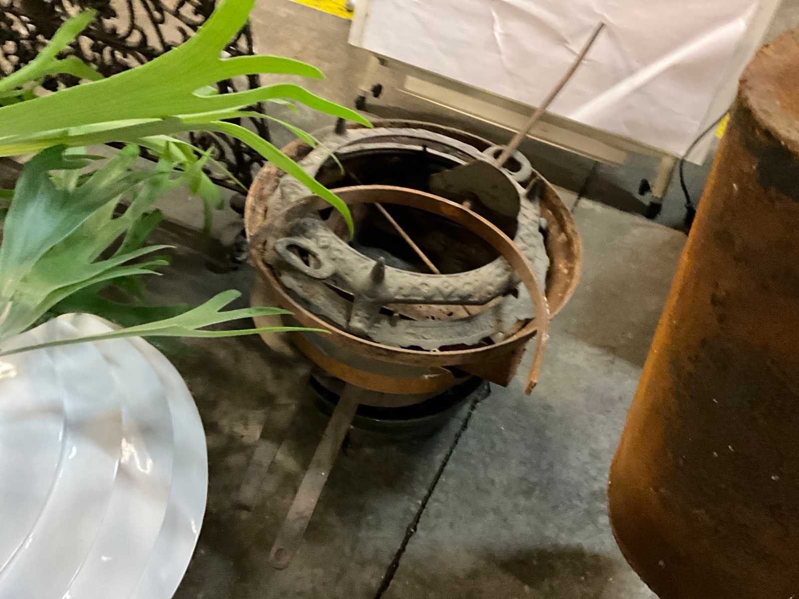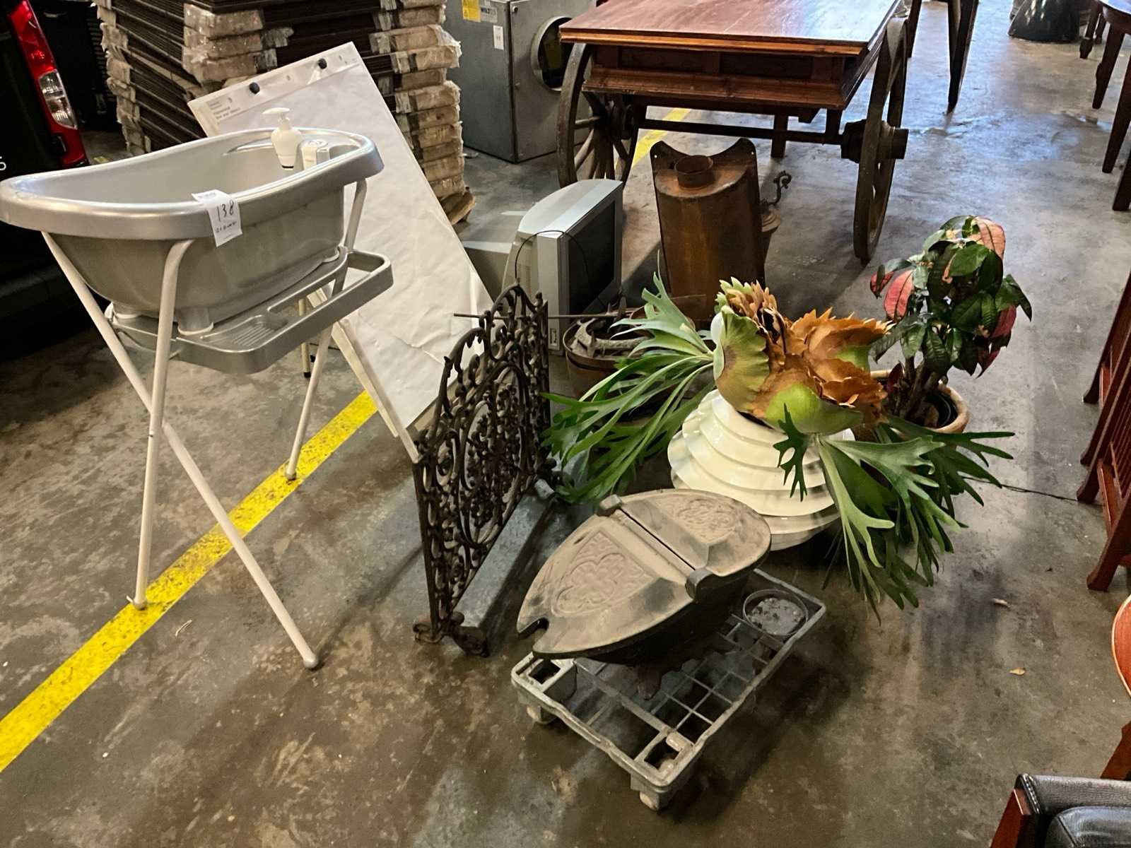 2x plant in pot, 2x tafellamp, samsung tv, kachel, open haard rek, 2x metalen pot, Bebejou baby bad, flip-over