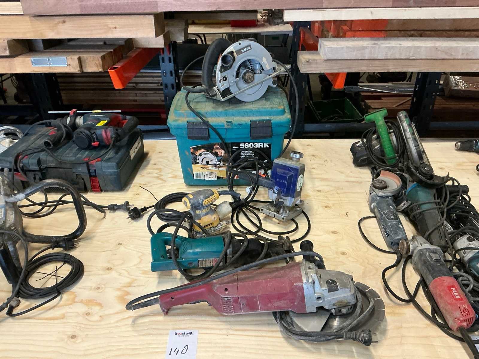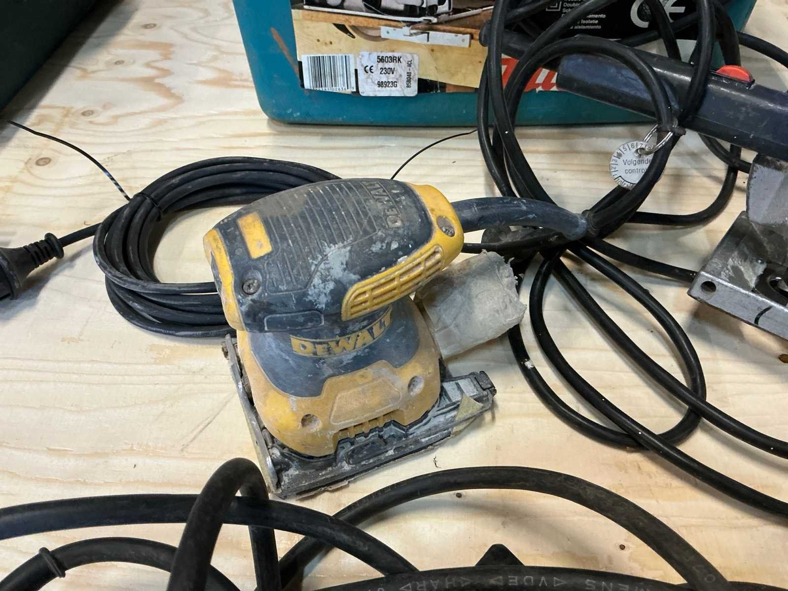 Bestaande uit een Makita reciprozaag, Makita afkortzaag, DeWalt schuurmachine, Elu bovenfrees en Haakse slijpmachine. Merk: Makita / DeWalt / Elu