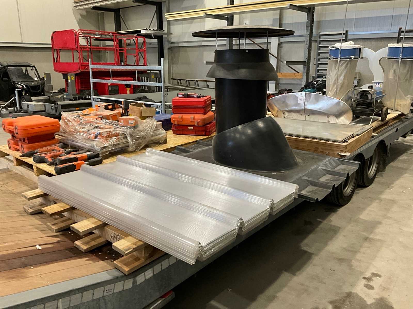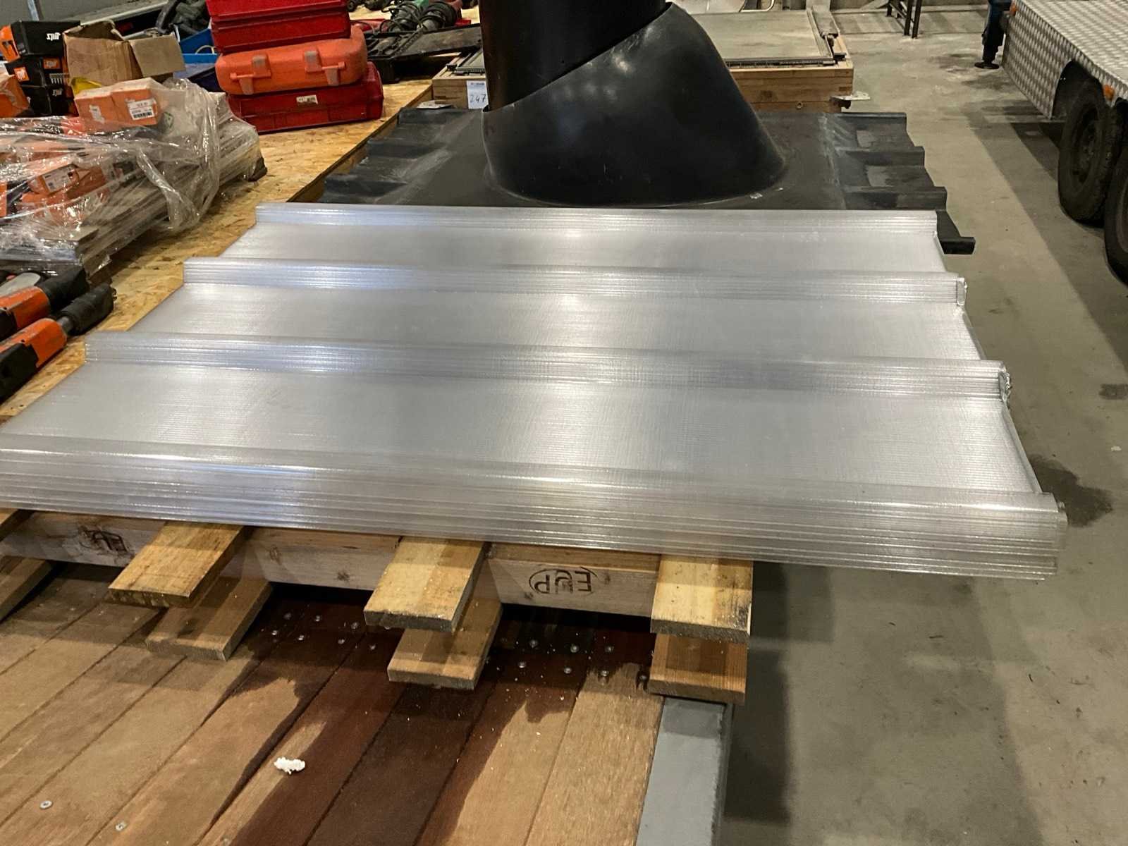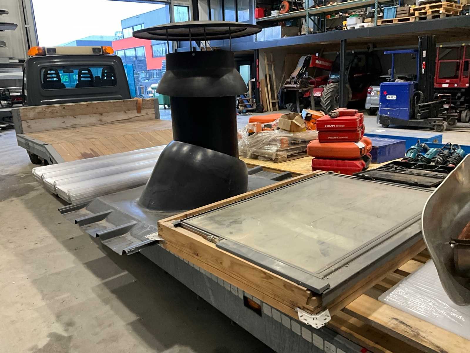 Bestaande uit: kantelbaar dakraam, schoorsteen met kraag, 6x Akralux Greca 4 1050x1500mm lichtdoorlatend dakplaat