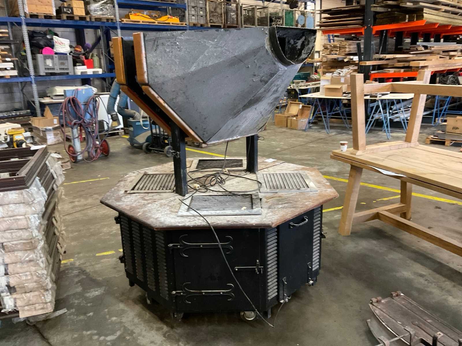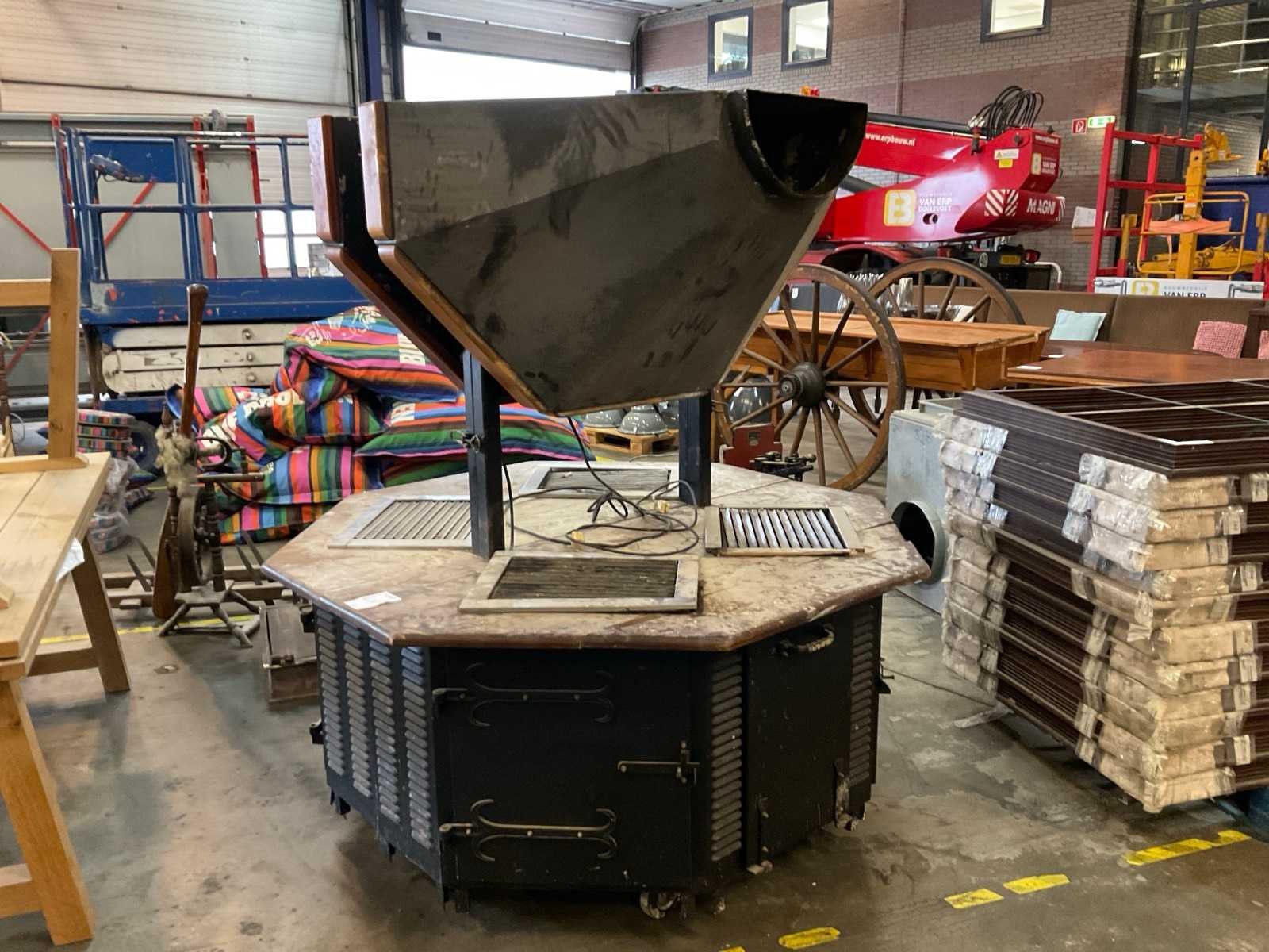 Bestaande uit: 4 barbecues in een onderstel, met afzuiging en lampen. Afmetingen in cm. Lengte: 180 Breedte: 180 Hoogte: 190