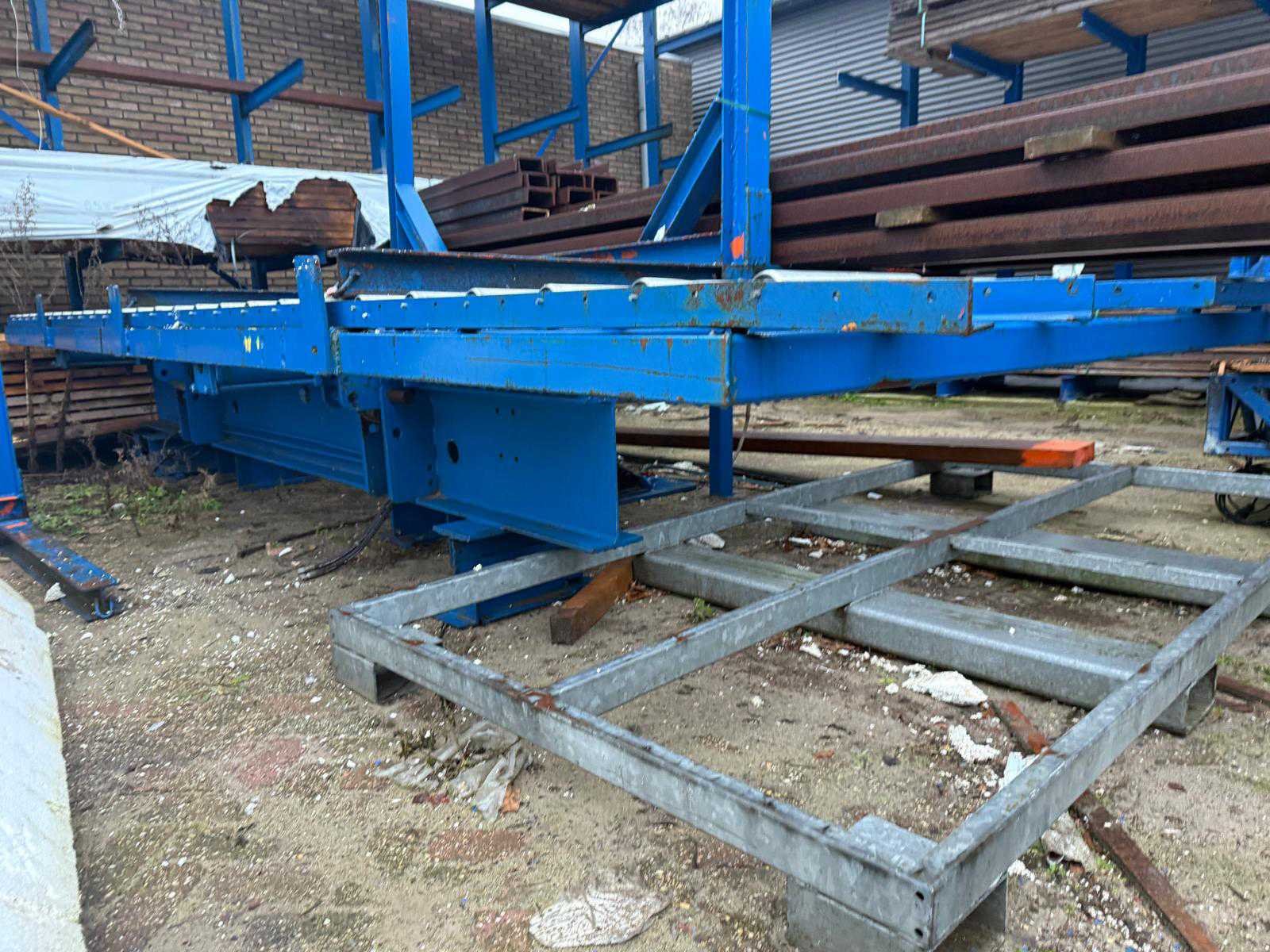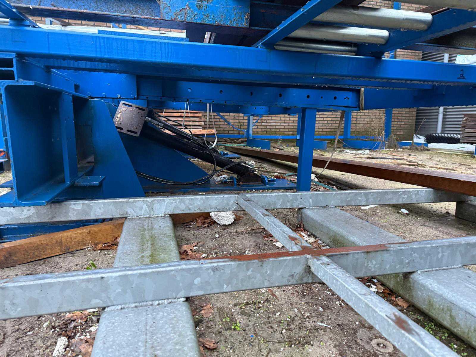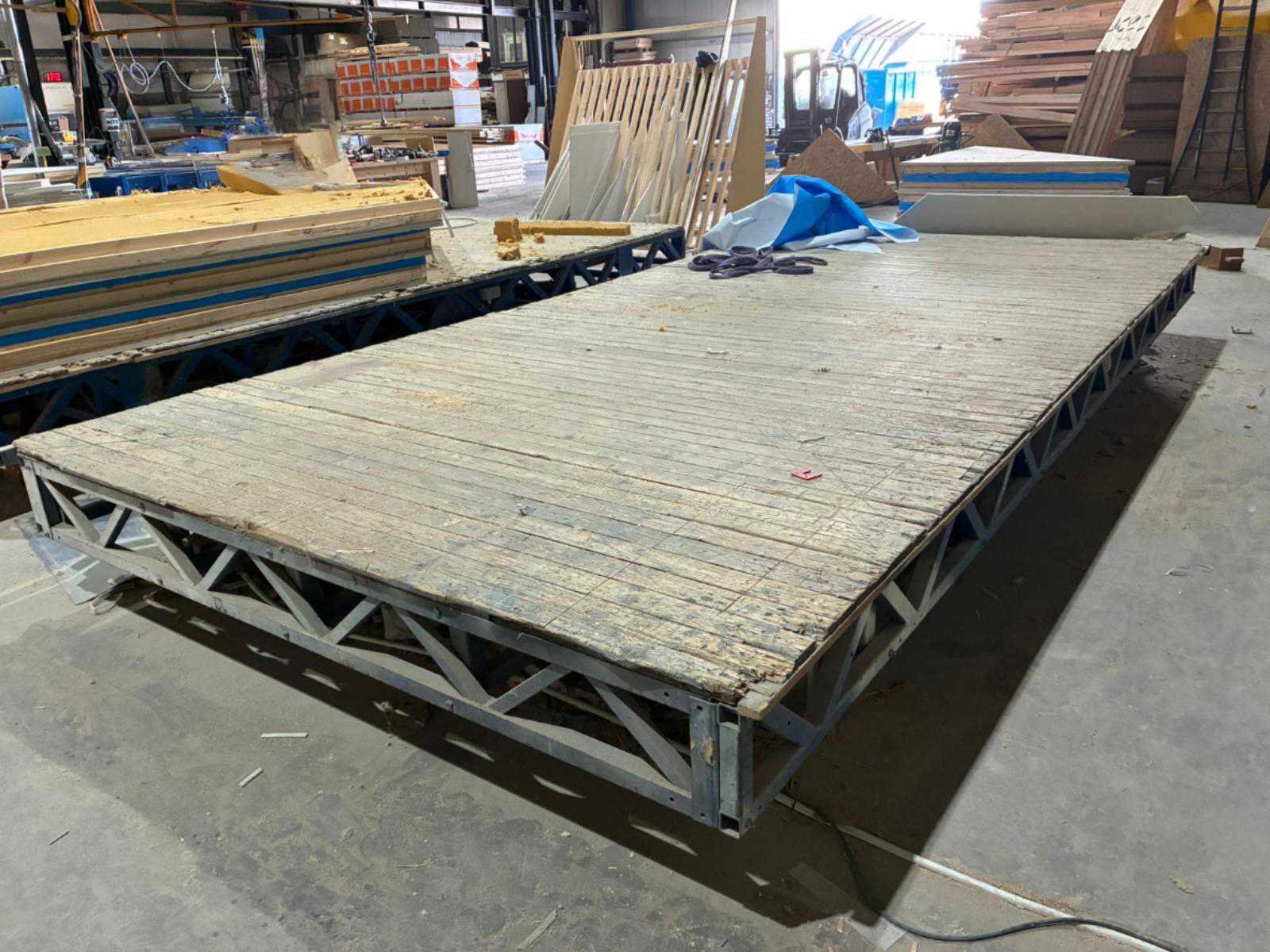 Met werktafels en klaptafel, 2x Werktafel Afmeting 3000mm breed en 5850mm lang en ca. 630mm hoog, 1 tafel is voorzien van een aanslag, Stevig stalen frame, Houten bovenzijde, Gedemonteerde klaptafel is gedeeltelijk voorzien van rollenbanen, Inclusief cilinders, Inclusief montagestaal om de klaptafel rijdend te maken, Afmeting: 2600mm breed en 5500mm diep, Exclusief stalen bokken en blank staal wat op en onder de klaptafel staat. Type: Houtenskeletbouw
