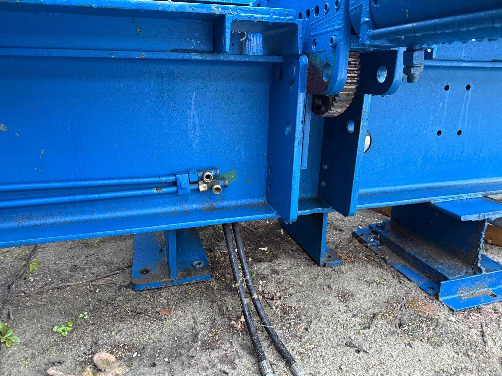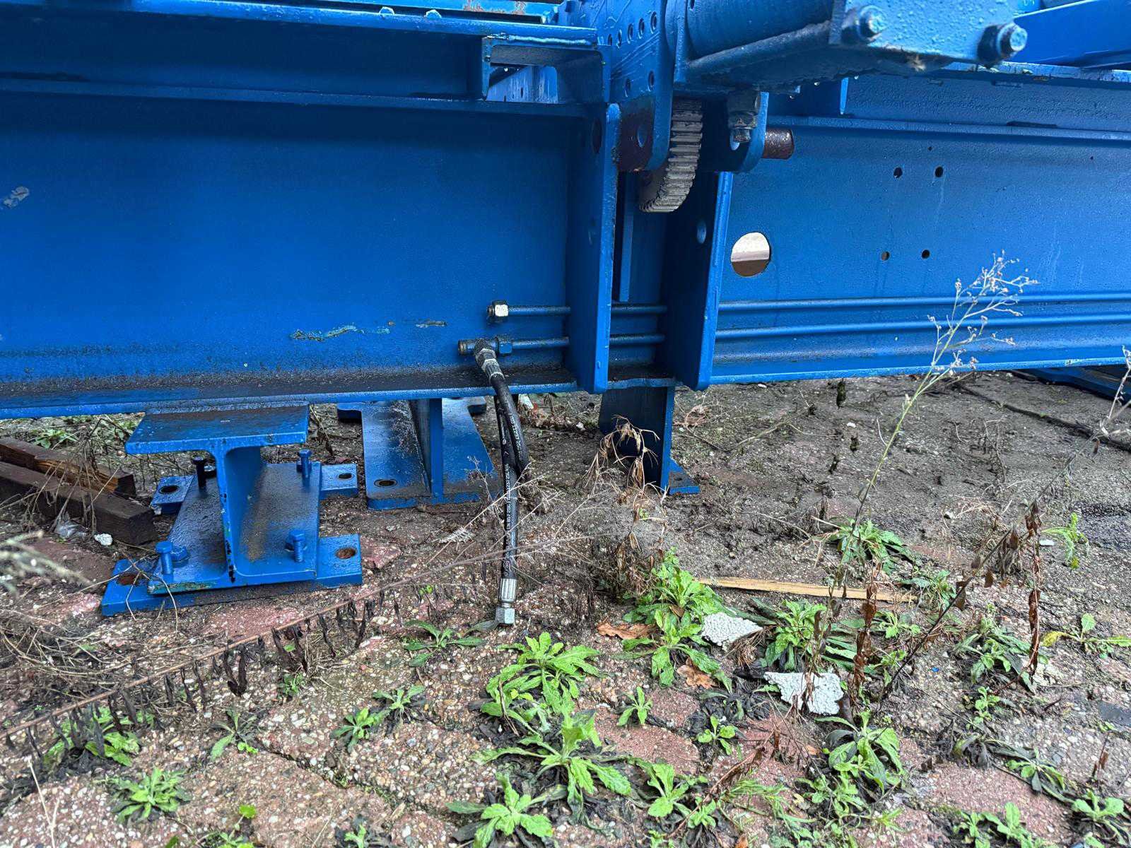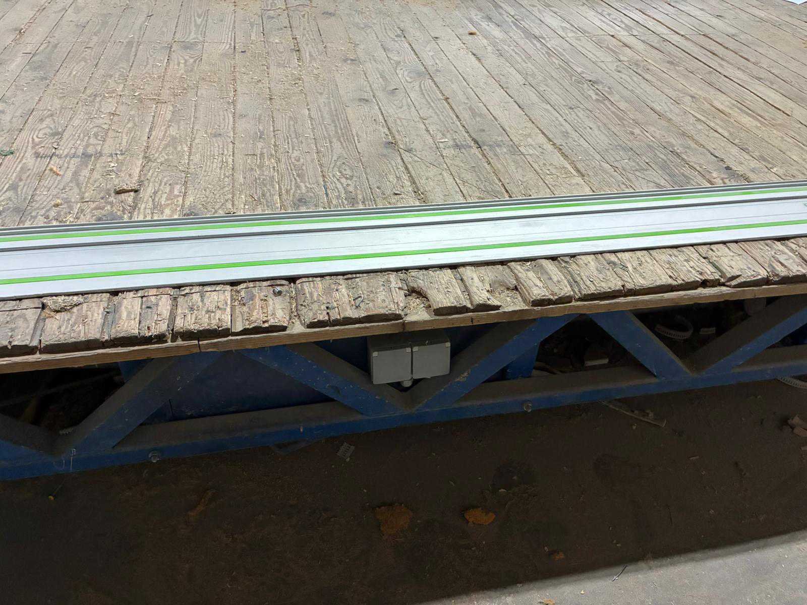 Met werktafels en klaptafel, 2x Werktafel Afmeting 3000mm breed en 5850mm lang en ca. 630mm hoog, 1 tafel is voorzien van een aanslag, Stevig stalen frame, Houten bovenzijde, Gedemonteerde klaptafel is gedeeltelijk voorzien van rollenbanen, Inclusief cilinders, Inclusief montagestaal om de klaptafel rijdend te maken, Afmeting: 2600mm breed en 5500mm diep, Exclusief stalen bokken en blank staal wat op en onder de klaptafel staat. Type: Houtenskeletbouw