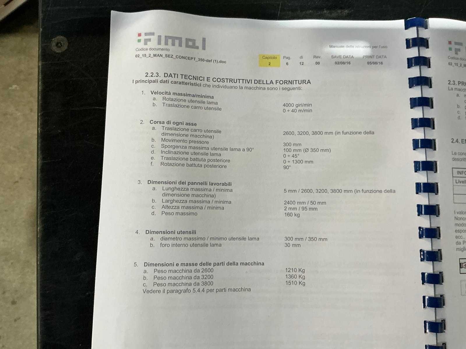 Documentatie aanwezig CE markering aanwezig Max. zaaglengte: 3800mm Max. zaaghoogte: 95mm Merk: Fimal Type: Concept 350 Bouwjaar: 2018 Serienummer: 1408 Zaagblad Ø: 350mm Schuinstelbereik max.: 45° Snelheid tot n =: 4000rpm Aansluiting: 400V Machinegewicht: 1450kg Afmeting l: 5000mm Afmeting b: 1500mm Afmeting h: 1650mm