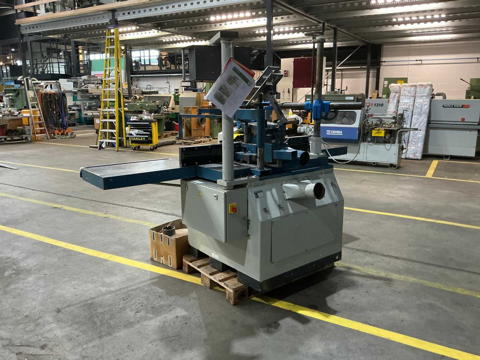 16A Aigner geleiding Aanvoerapparaat Merk: Hofmann Type: TFS 1200 Bouwjaar: 2001 Serienummer: 127-01204 Tafel afmeting l: 2680mm Tafel afmeting b: 450mm Spil Ø: 40mm Schuinstelbereik: 45° Snelheid van n =: 3000rpm Motorvermogen (kW): 7.8kW Aansluiting: 400V Machinegewicht: 950kg Afmeting l: 2680mm Afmeting b: 1200mm Afmeting h: 2200mm