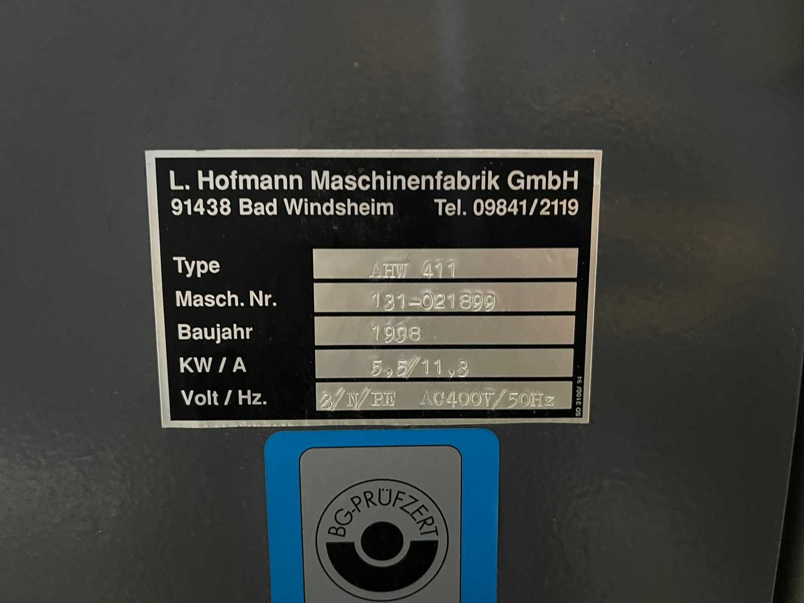Max schaafbreedte: 410mm Lengte invoertafel: 1500mm Lengte uitvoertafel: 150mm Totale lengte tafels: 3070mm 4 messen Vermogen hoofdmotor: 5,5kW Merk: Hofmann Type: AHW 411 Bouwjaar: 1998 Serienummer: 131-021899 Afmeting l: 3070mm Afmeting b: 1050mm Afmeting h: 1400mm