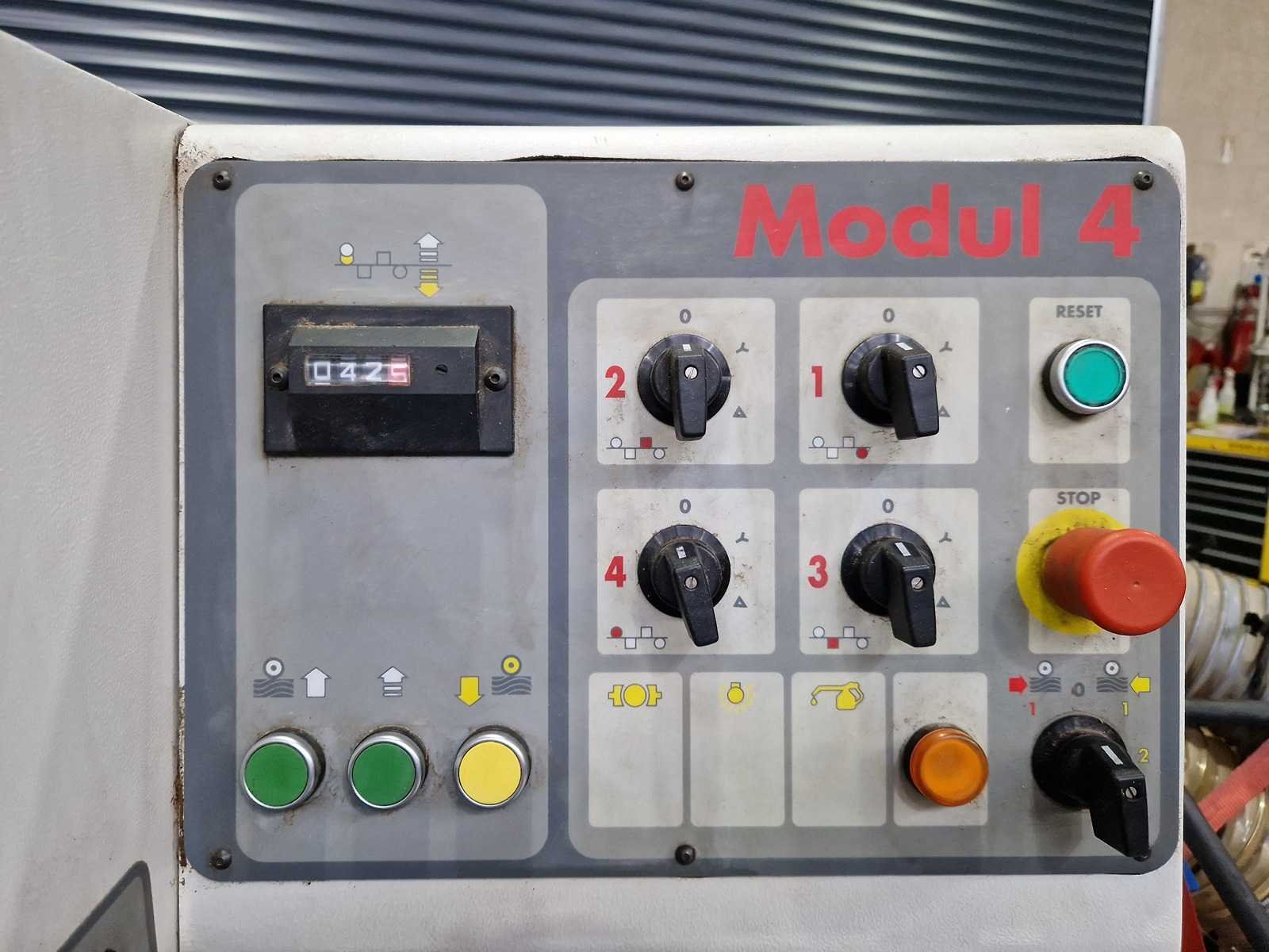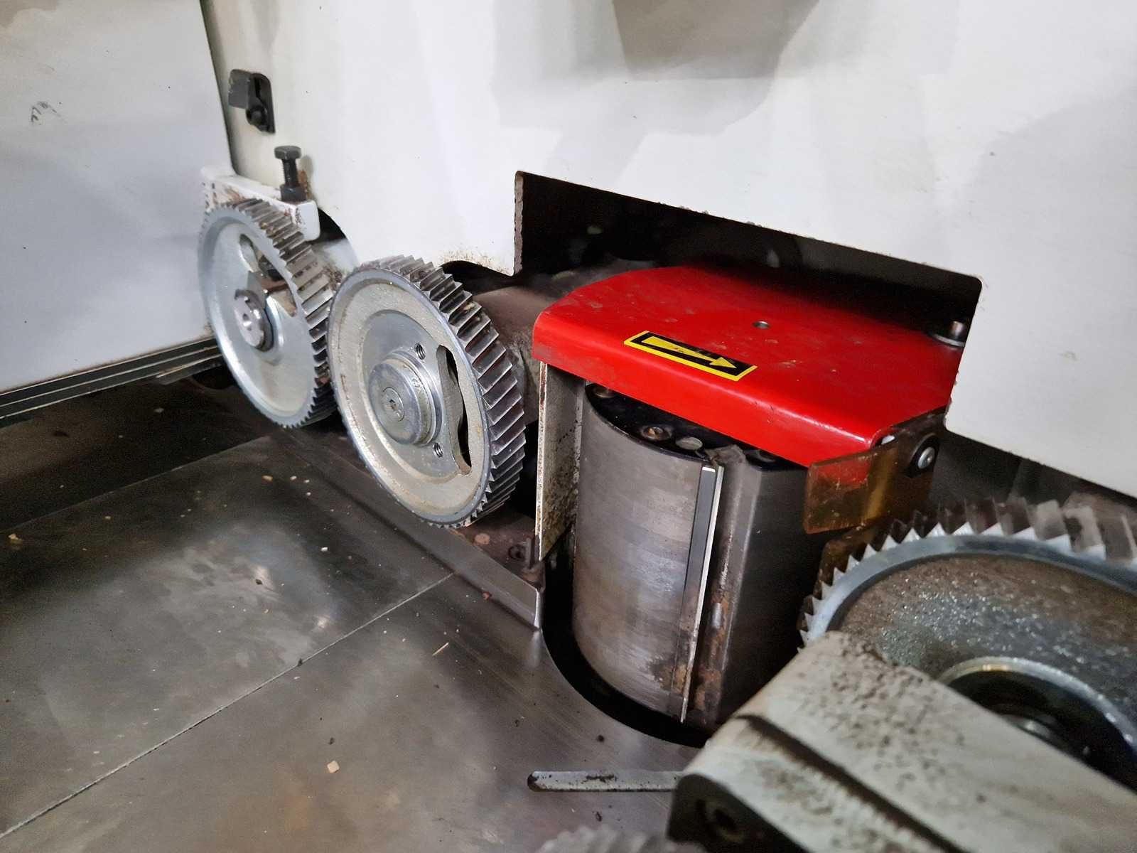 1e spindel onder 5,5PK 2e spindel, rechts 4PK 3e spindel, links 4PK 4e spindel, boven 5,5PK Tersa schaafkoppen Merk: Futura Type: Modul 4 - 220 S Bouwjaar: 2000 Schaafbreedte: 220mm Schaafhoogte: 120mm Spil Ø: 40mm Lengte aanvoerrollenbaan: 2250mm Aansluiting: 380V Machinegewicht: 1500kg Afmeting l: 3400mm Afmeting b: 1100mm Afmeting h: 1600mm