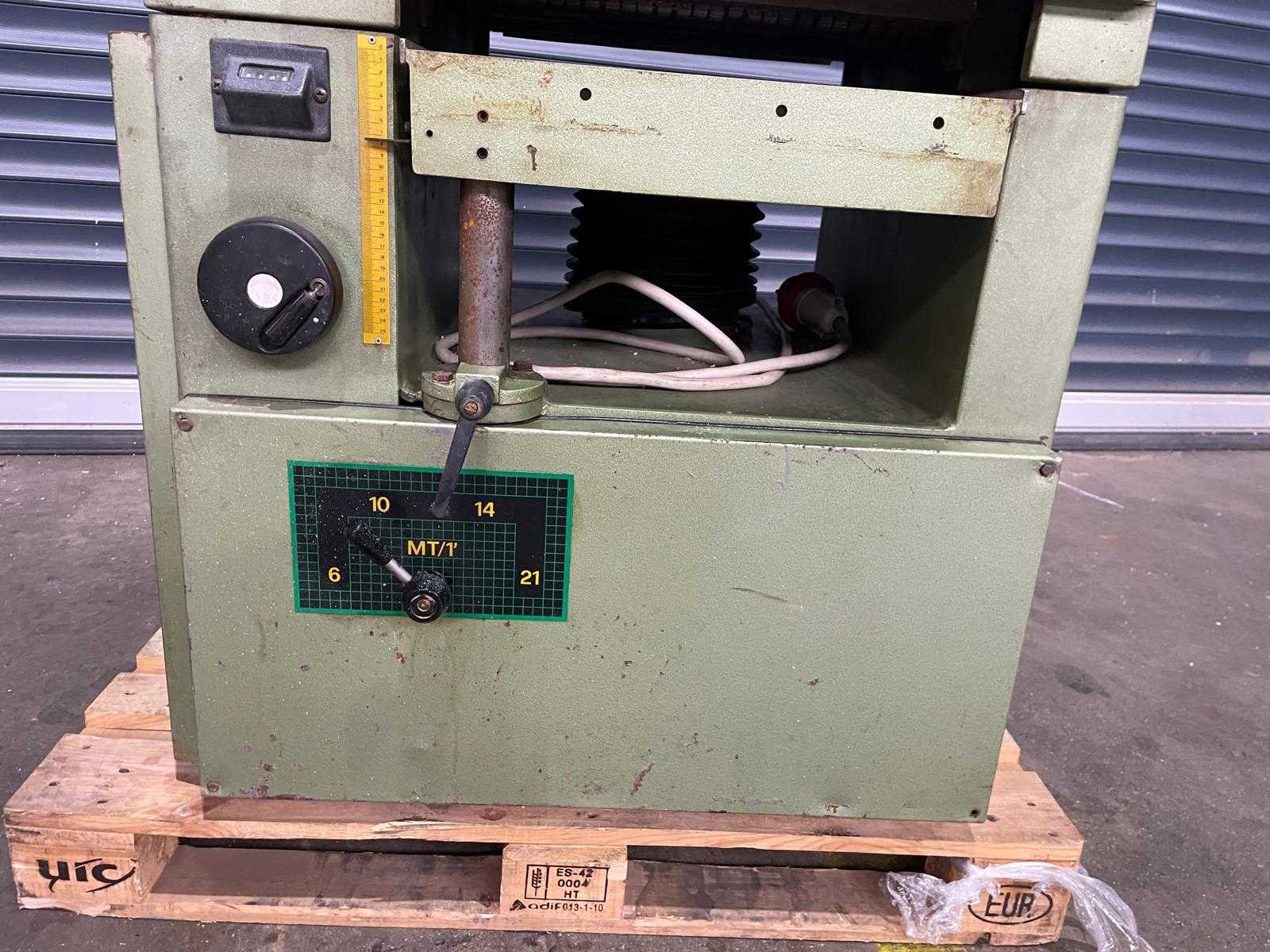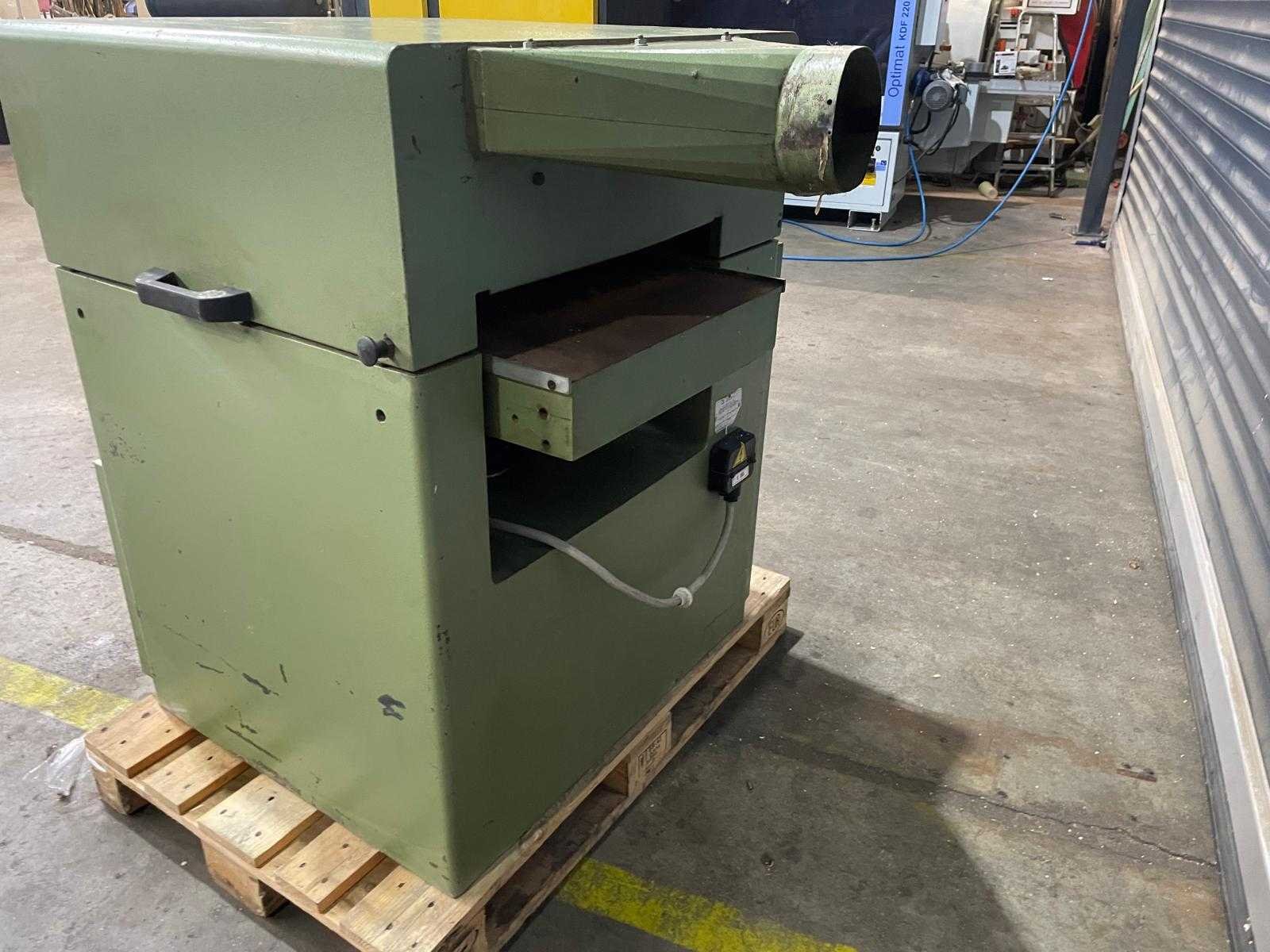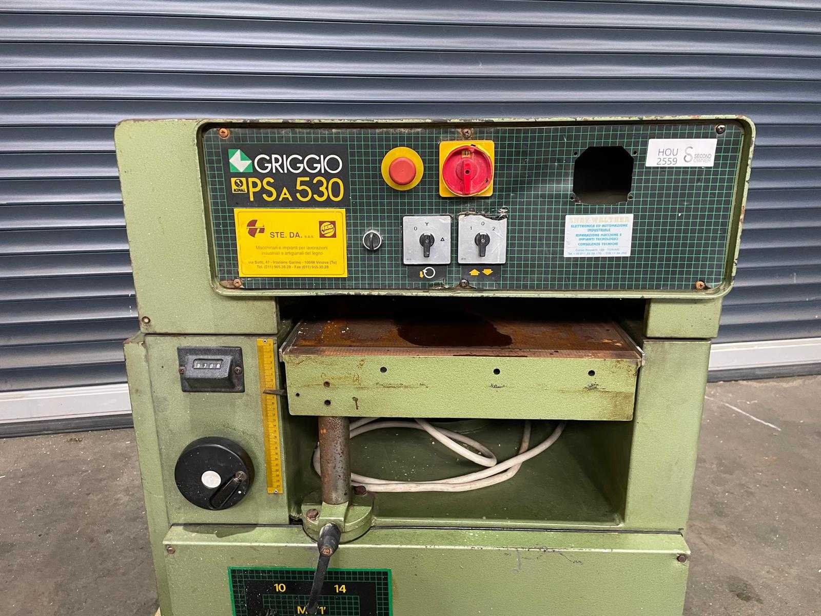 Max spaanafname 8mm Diameter schaafblok 120mm Rotorsnelheid 5000Rpm Doorvoersnelheden 5-10-14-21 m/min Merk: Griggio Type: PSA 530 Werkbreedte: 530mm Werkhoogte: 250mm Machinegewicht: 670kg Afmeting l: 980mm Afmeting b: 1140mm Afmeting h: 1170mm