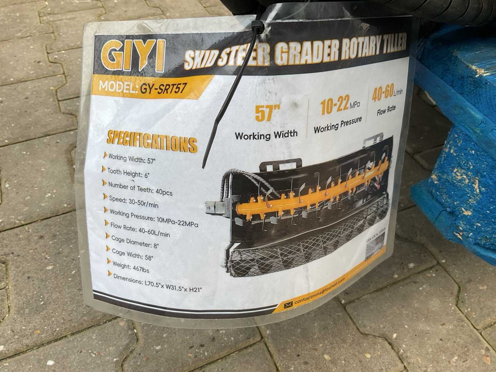 Voorzien van werkbreedte: 1447,8 mm; tandhoogte: 152,4 mm; Aantal tanden: 40 stuks; Rotatiesnelheid: 30–50 omw./min; Werkdruk: 10–22 MPa; Benodigde olieflow: 40–60 L/min; Cage/kooi diameter: 203,2mm; Cage/kooi breedte: 1473,2 mm; gewicht: 211,8 kg; Afmetingen (L×B×H): 1790,7 × 800,1 × 533,4 mm; ongebruikt Merk: Giyi Type: GY-SRT57 skid steer grader rotary tiller