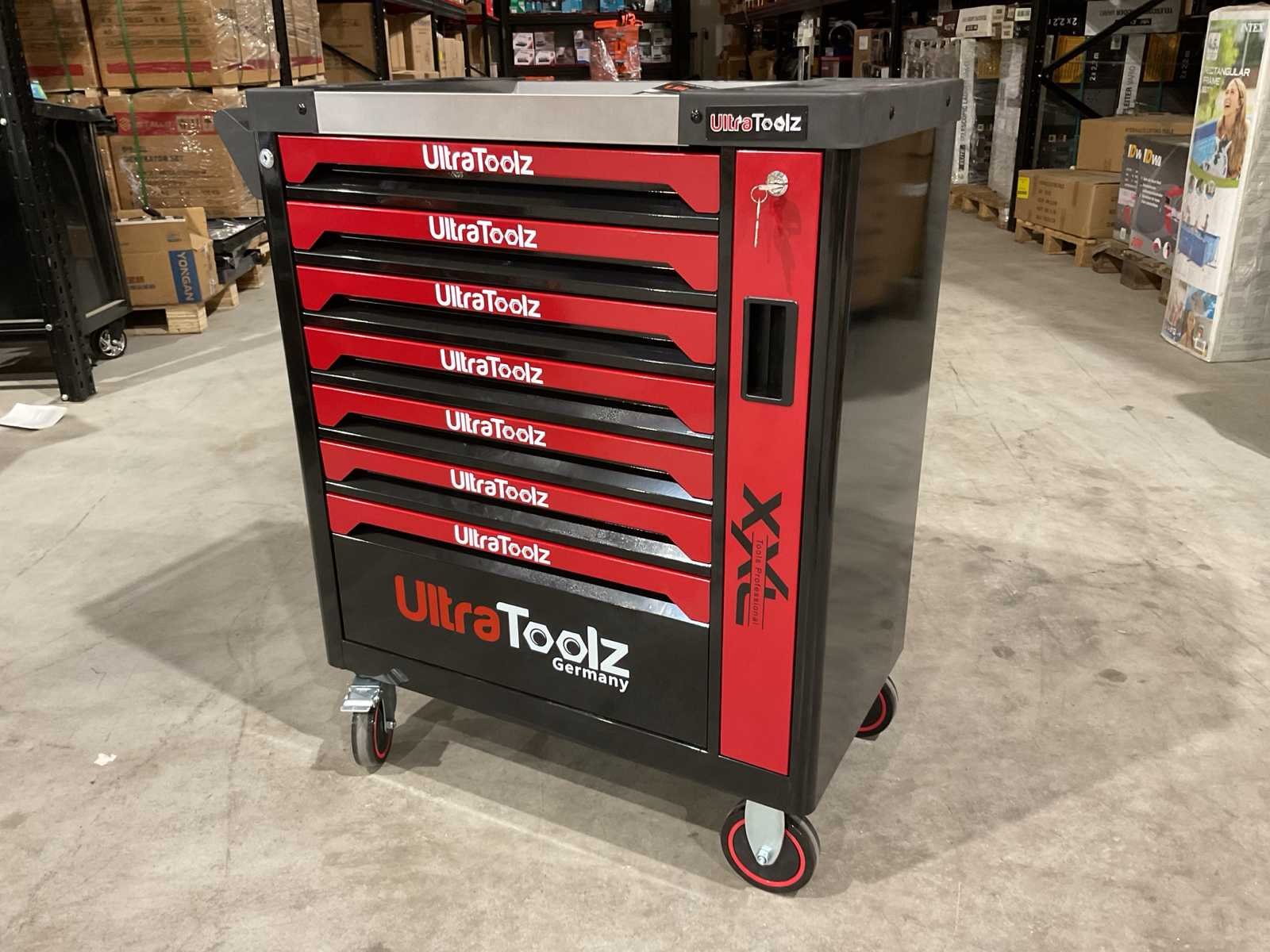 Voorzien van 7 lades waarvan 7 gevuld met gereedschap; zij lade; professioneel chroom-vanadium gereedschap; heavy duty gereedschapswagen; stevig werkblad; 4 wielen; stevig handvat; ongebruikt in doos (transport afmetingen 80x50x85 cm) Merk: UltraToolz Type: Germany 7/7 pro Bouwjaar: 2025 Aantal laden: 7 Met inhoud: true Eigen gewicht: 80kg Totale afmeting L: 800mm Totale afmeting Breedte: 500mm Totale afmeting Hoogte: 850mm