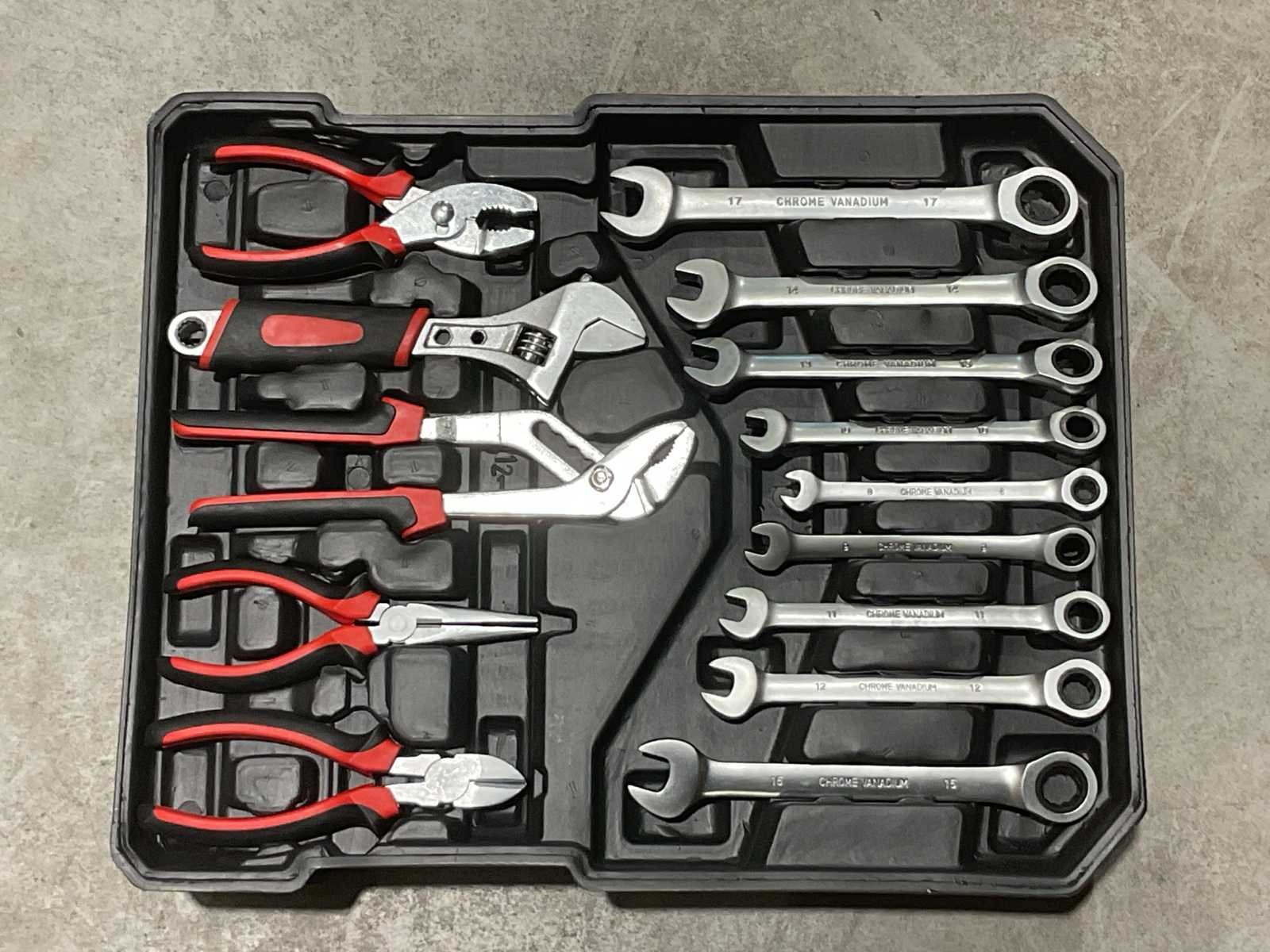 Voorzien van Schroevendraaierset; Zaag; Waterpas; Hamer; Bitset; Inbussleutels; Spanningsmeter; Handgereedschap; Spijkers; pluggen; Kunsstof Koffer; Telescoop handgreep; wielen; ongebruikt in doos Merk: UltraToolz Type: 399PCS Met inhoud: true Afmeting l: 38.5mm Afmeting b: 20.5mm Afmeting h: 52mm Eigen gewicht: 13kg