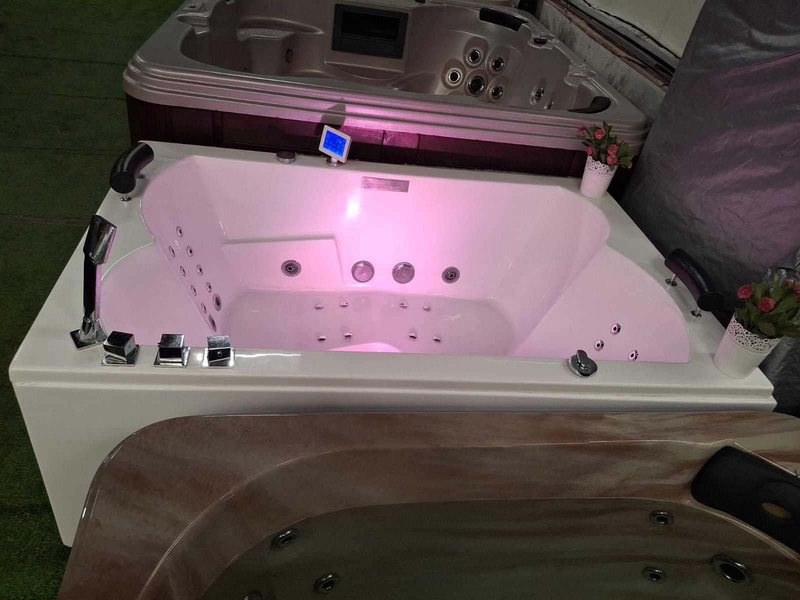 Voorzien van hoofdkussens; verlichting; douche kop; waterval; niet getest op functioneren (Marge, geen BTW) Merk: Varono Model: 2 persoons Verlichting: Ja Jets: 28 Aantal personen: 2 Lengte: 180cm Breedte: 120cm Hoogte: 74cm