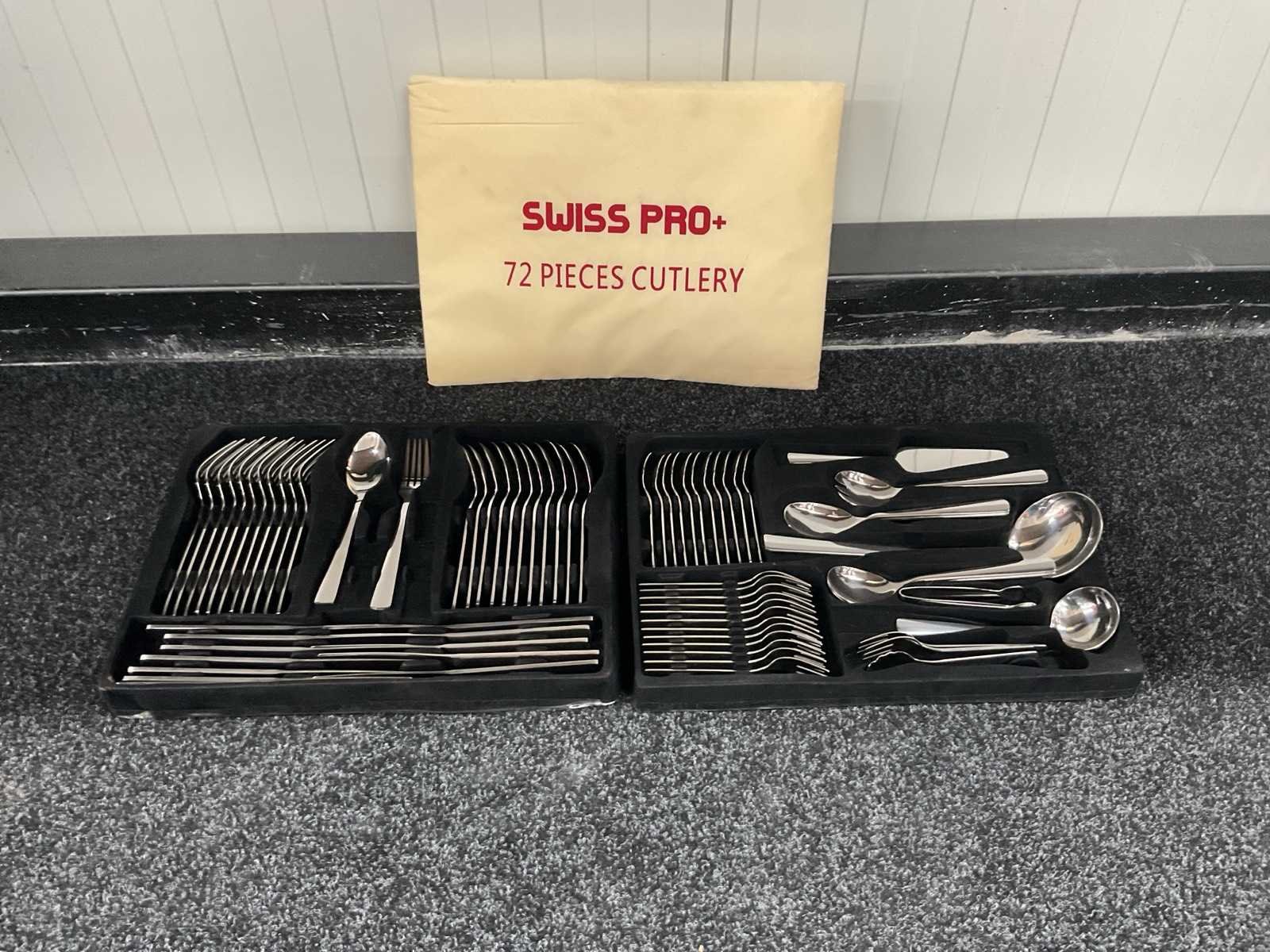 Voorzien van roestvrij staal; harde opbergkoffer met cijferslot; 12× tafelmes; 12× tafellepel; 12× tafelvork; 12× theelepel; 12× gebaksvorkje; 2× opscheplepel; 2× vleesvork; 1× saladelepel; 1× saladevork; 1× soeplepel; 1× suikerlepel; 1× taartschep; 1× juslepel; 1× extra opscheplepel; 1× suikertang; geschikt voor vaatwasser; ongebruikt in koffer Merk: Swiss Pro+ Type: Koffer Totale afmeting L: 445mm Totale afmeting Breedte: 350mm Totale afmeting Hoogte: 105mm Eigen gewicht: 4.9kg