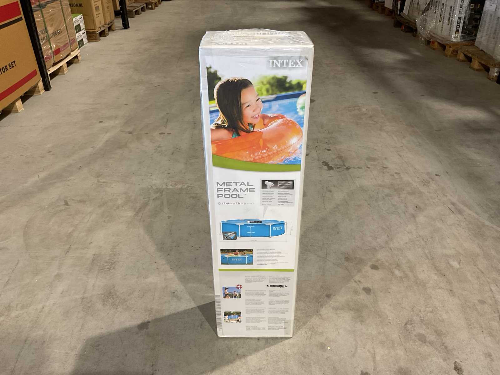 Voorzien van Opzetzwembad; 3-laags PVC met gerasterde polyester tussenlaag; Frame gepoedercoat staal; Vorm: Rond; Inhoud 1828 liter; Aanbevolen waterdiepte (cm) 38; Pompaansluiting (mm) 32; Buitenafmeting Diameter x Hoogte (cm) 244 x 51; Dikte liner wand (mm) 0,50; Dikte liner bodem (mm) 0,265; Reparatieset; Ongebruikt in doos Merk: INTEX Model: 28205NP Product type: 2,4m Kleur: Blauw Gewicht: 9.25kg Lengte: 25.4cm Breedte: 17.5cm Hoogte: 94.6cm Materiaal: Dubbelwandig PVC folie met gerasterde binnenlaag