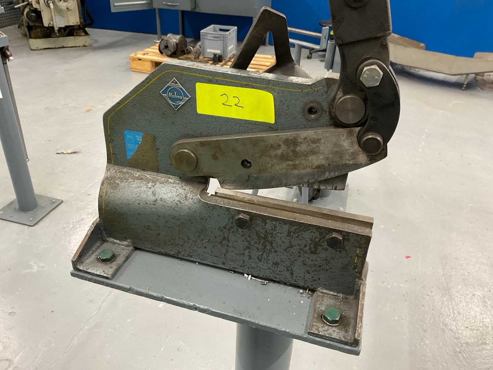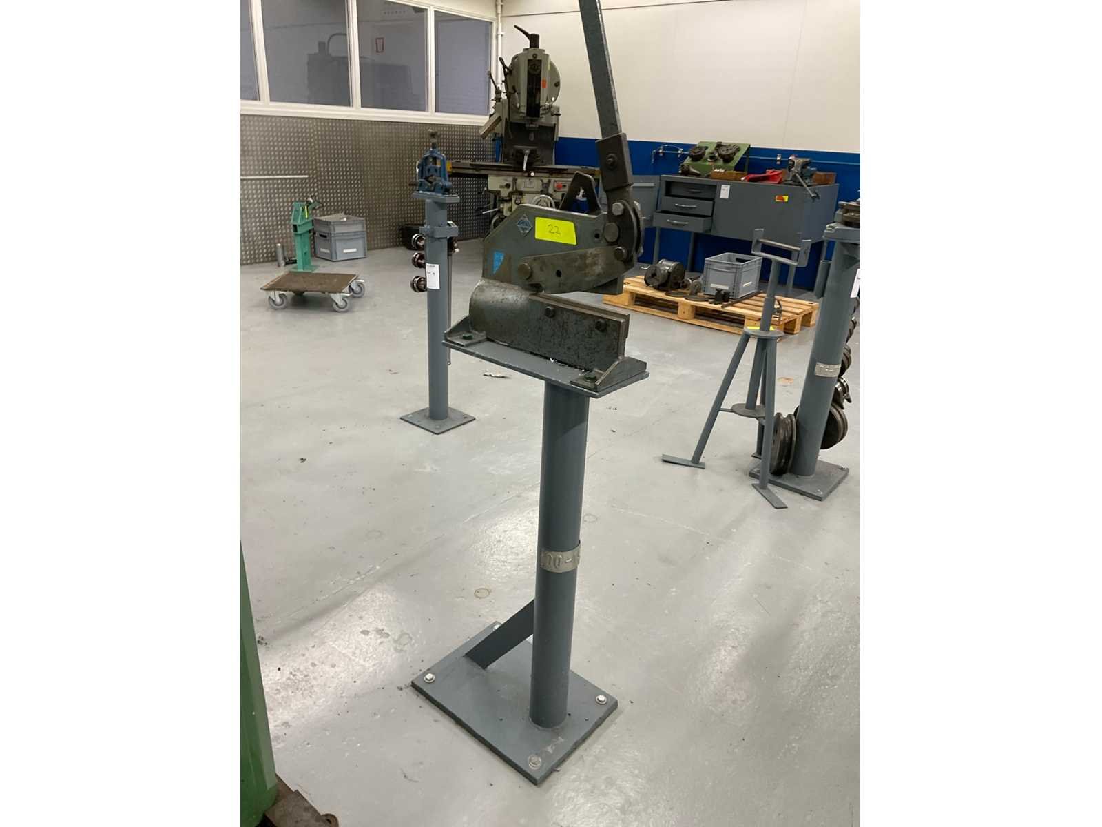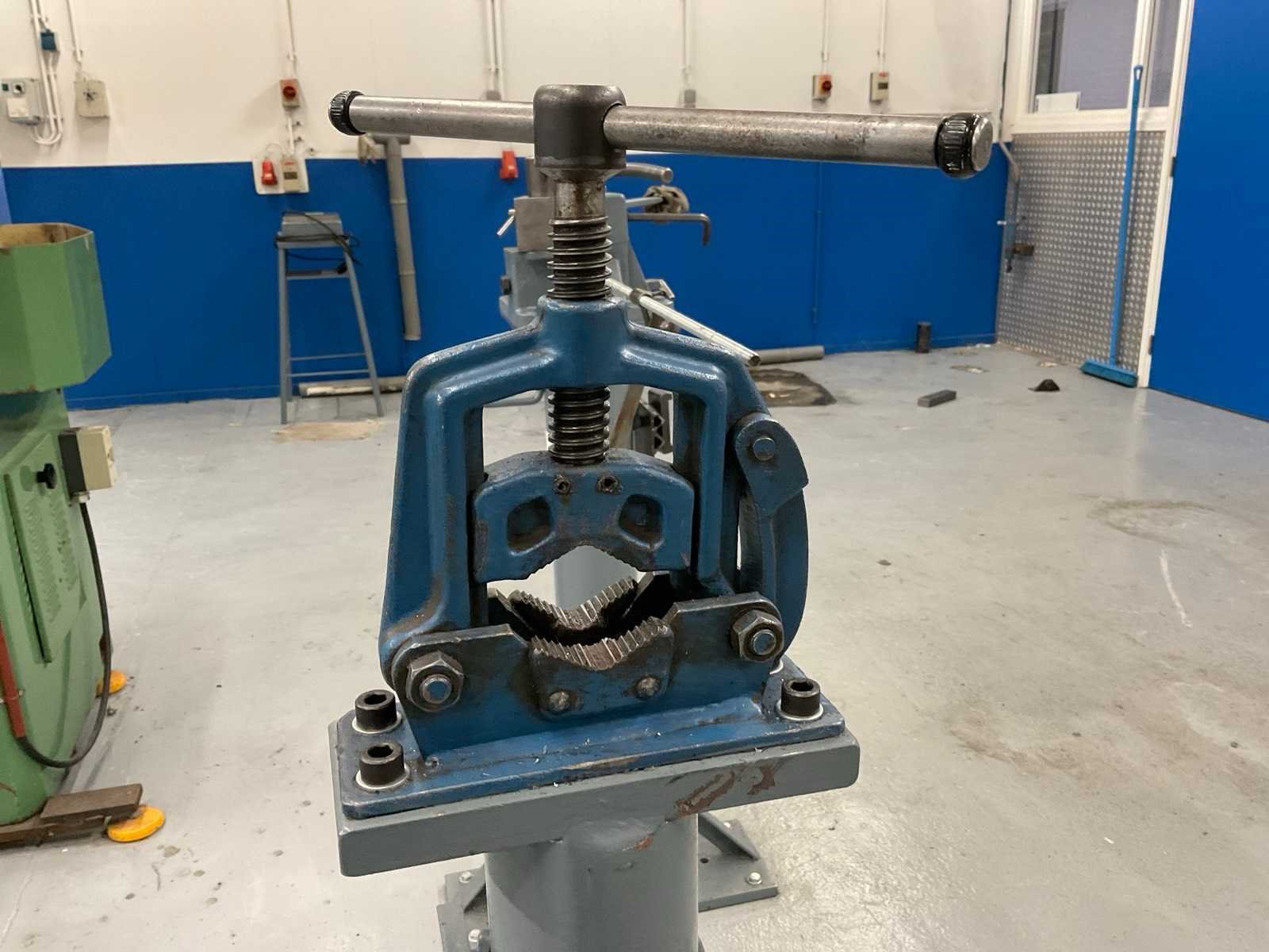 Bestaande uit: (1x) Mubea platenknipschaar op sokkel, 200mm, (1x) pijpenbuiger op sokkel met buigrollen, (1x) Pijpenklem met snij-ijzer met snijkoppen op sokkel, (1x) Buigapparaat op sokkel, (1x) dubbelsteens slijpmachine op sokkel.