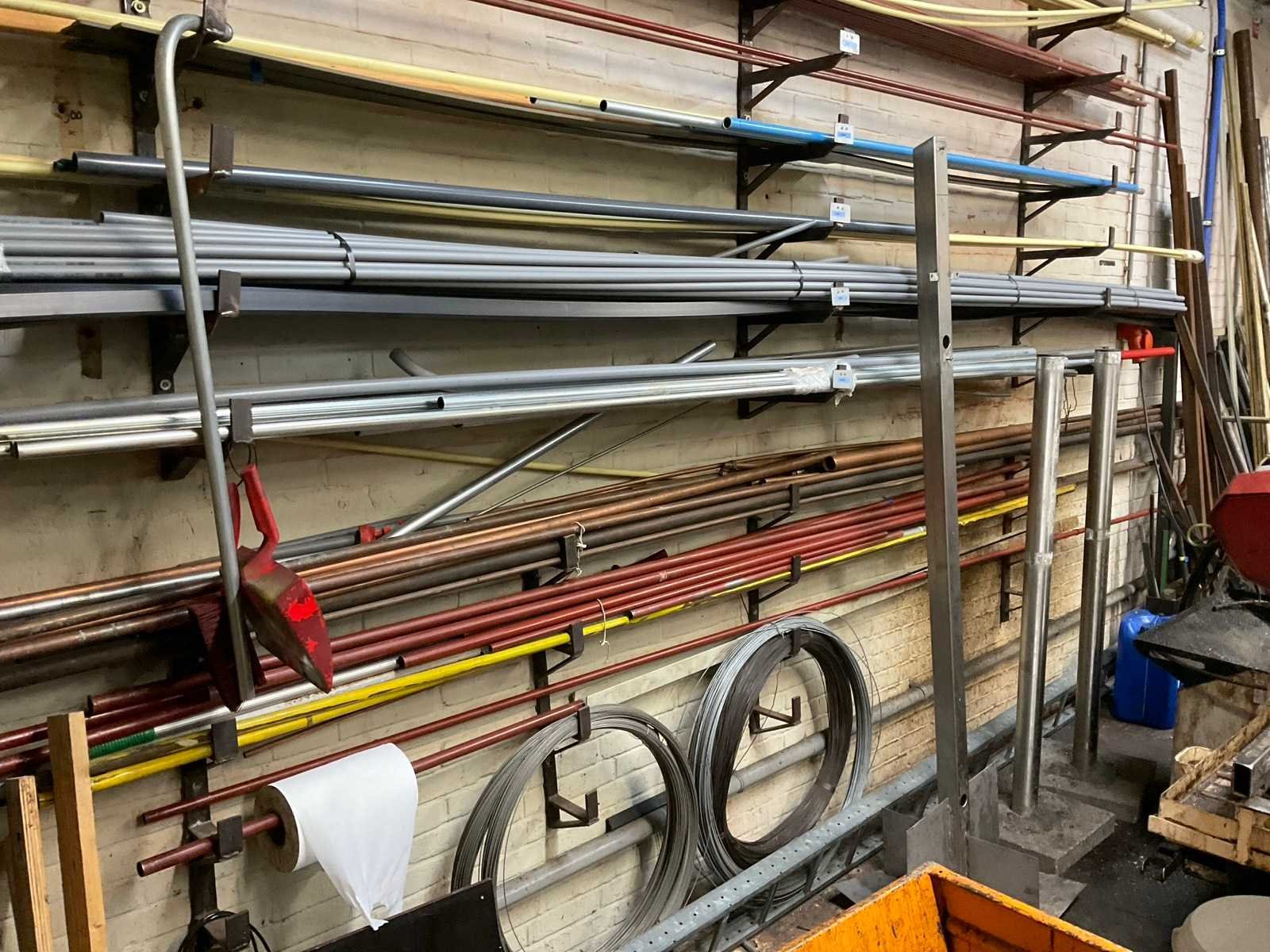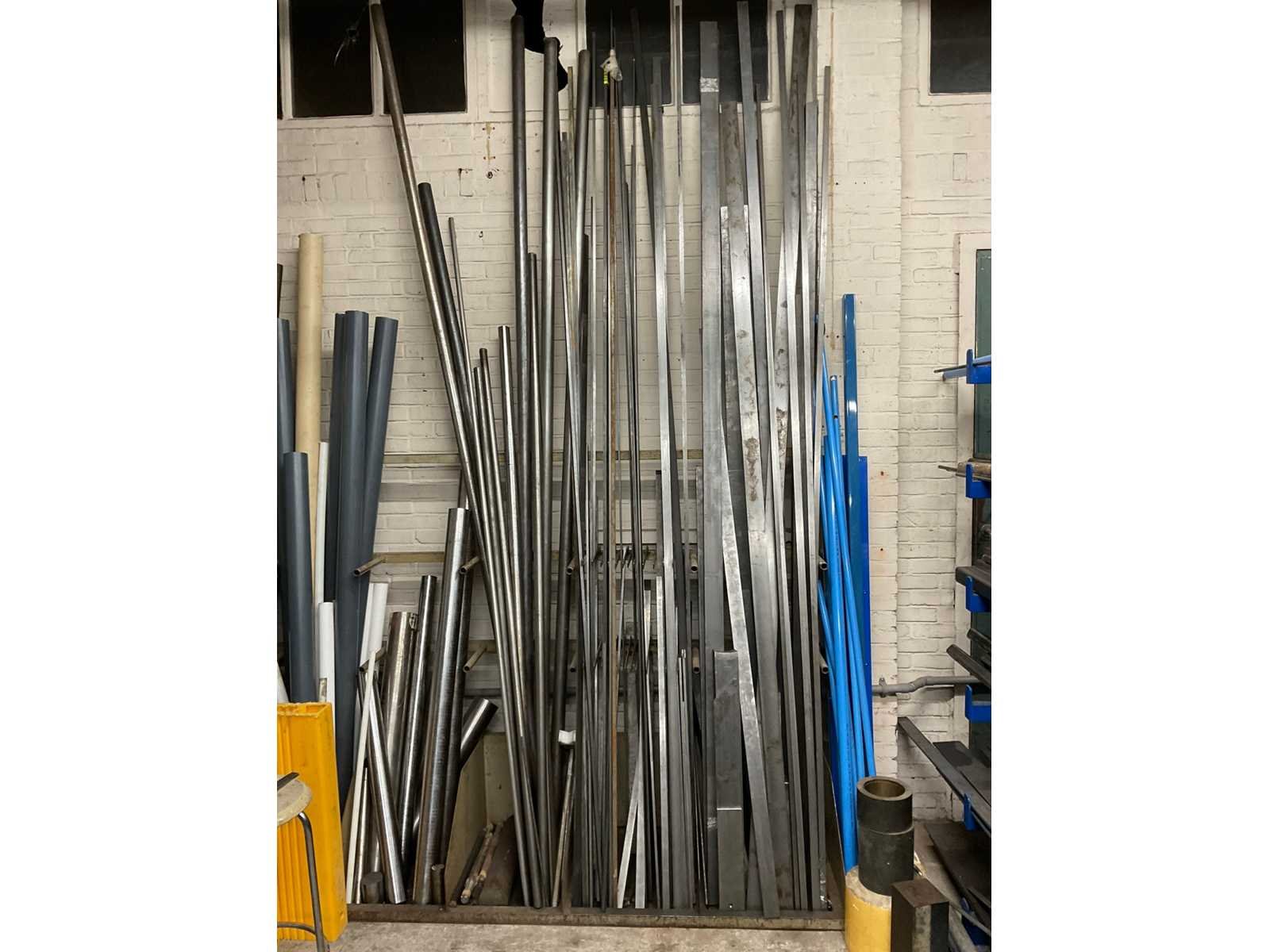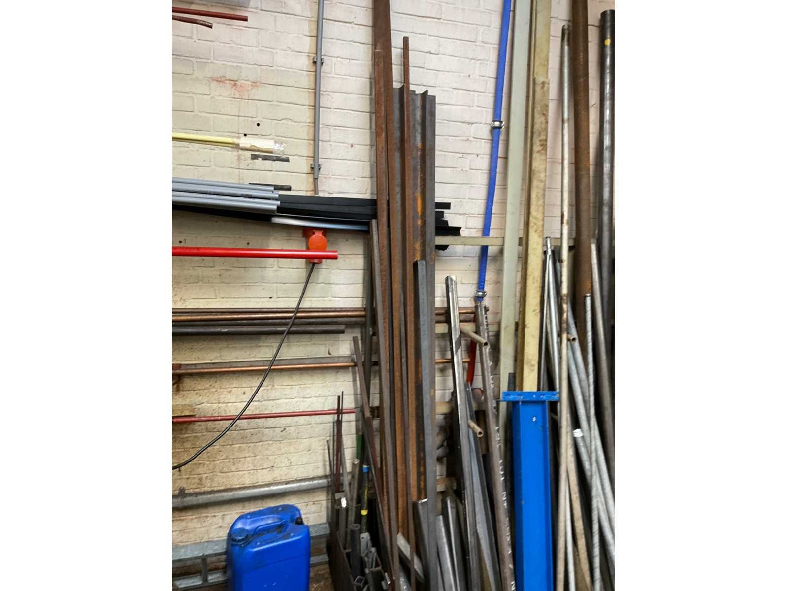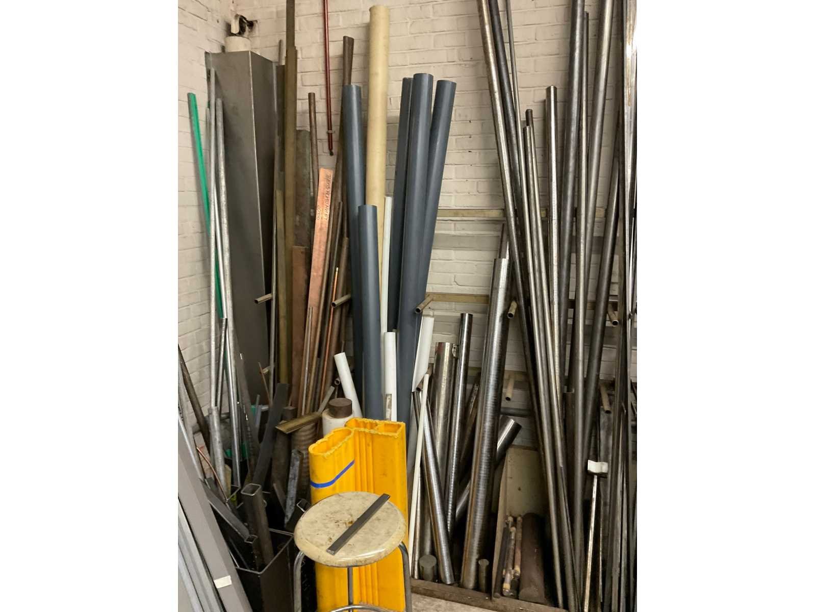 Bestaande uit: koper, RVS, aluminium en ijzer in diverse soorten en formaten waaronder kokerprofielen, stafmateriaal, platmateriaal, etc. Inclusief: (1x) enkele draagarmstelling 500x60x200cm en (2x) metaalbokken.