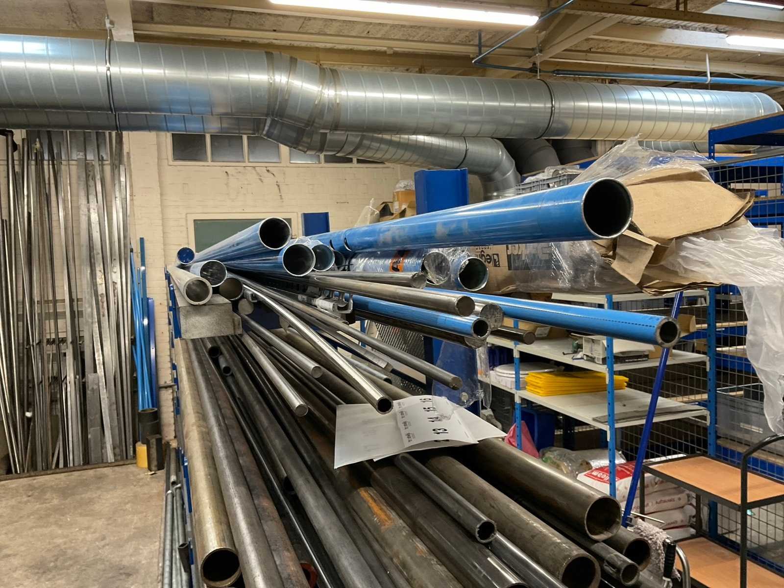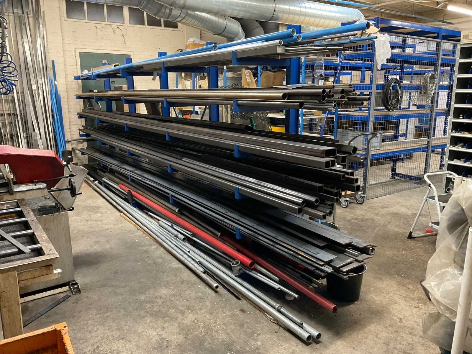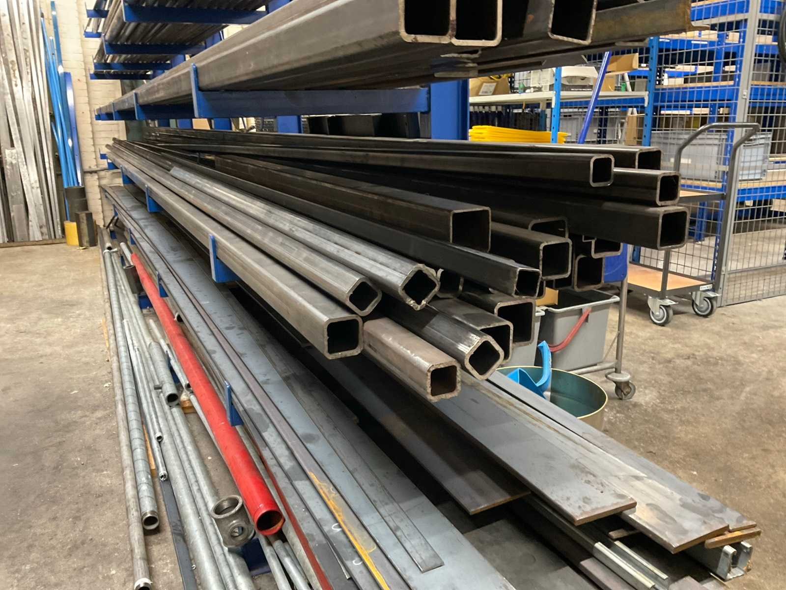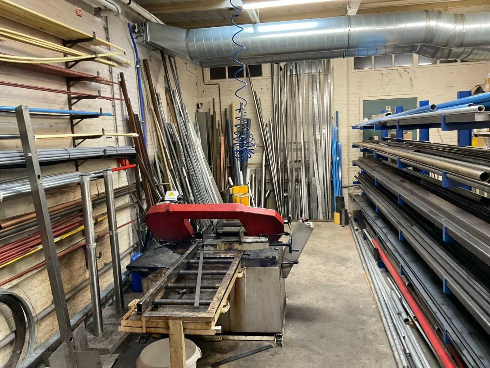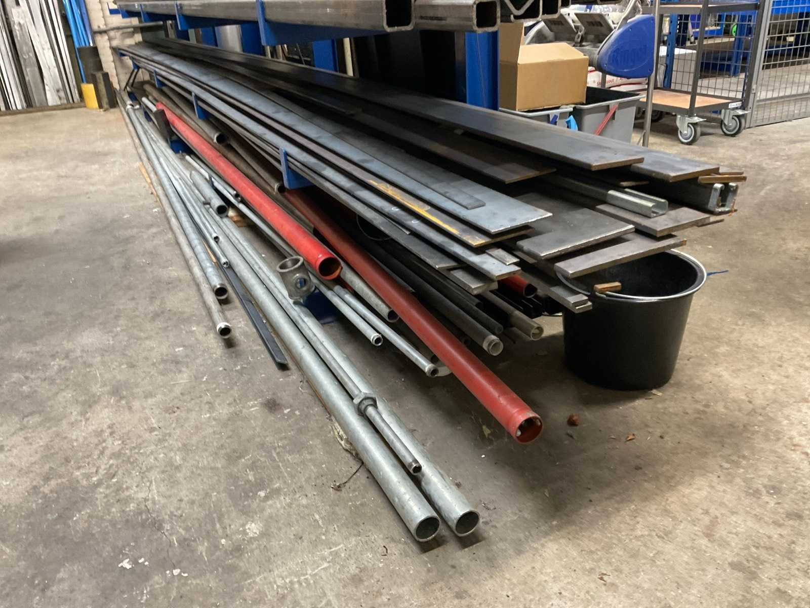 Bestaande uit: koper, RVS, aluminium en ijzer in diverse soorten en formaten waaronder kokerprofielen, stafmateriaal, platmateriaal, etc. Inclusief: (1x) enkele draagarmstelling 500x60x200cm en (2x) metaalbokken.
