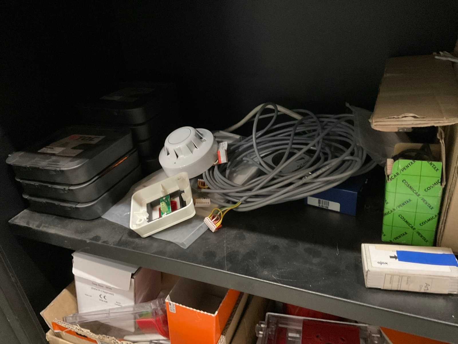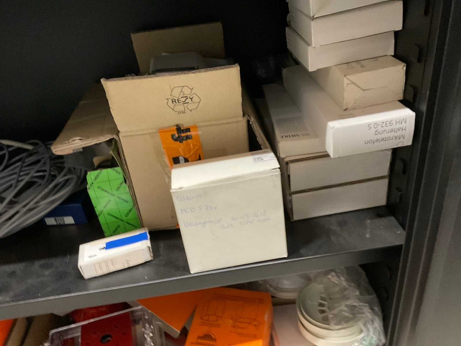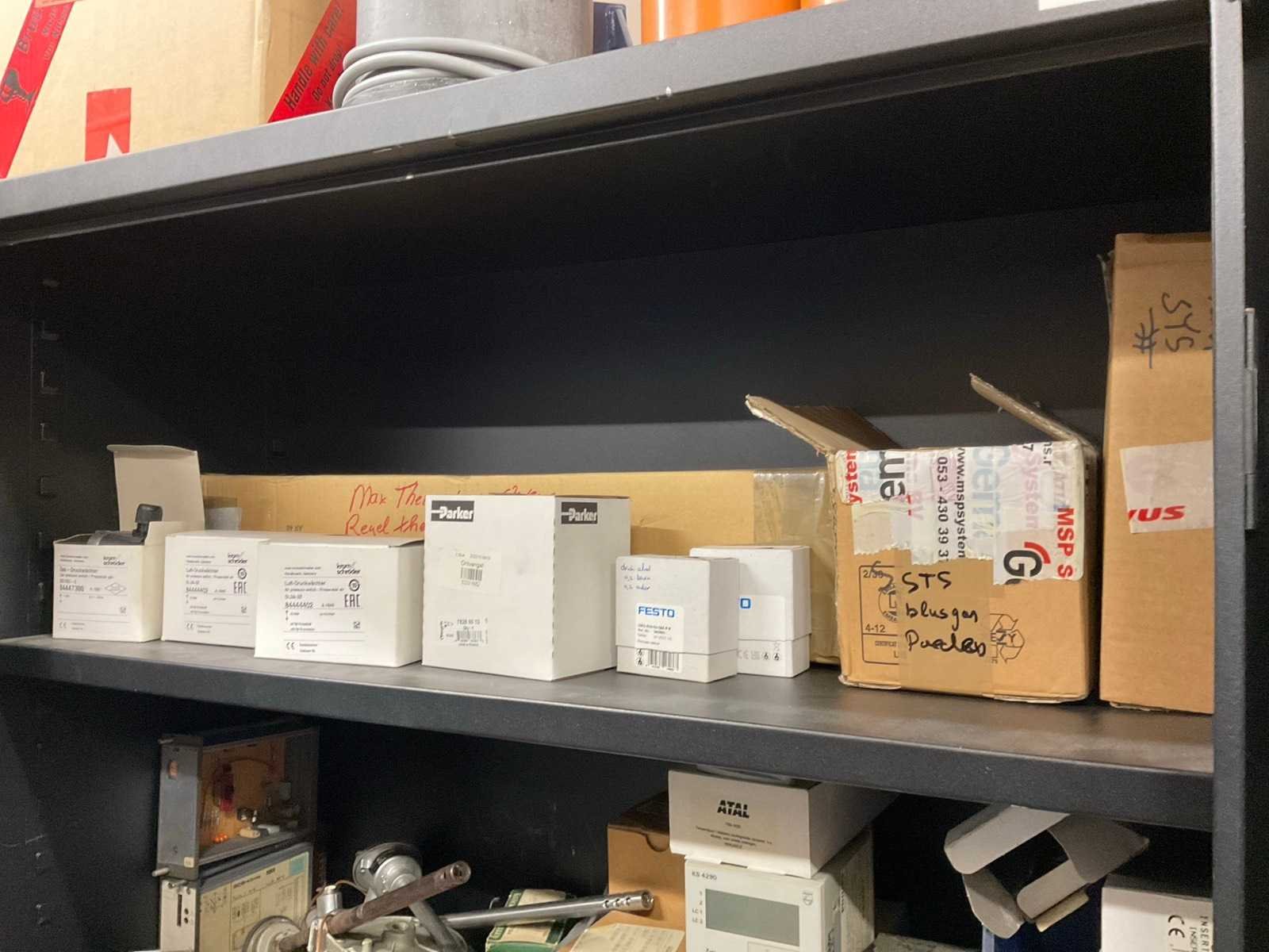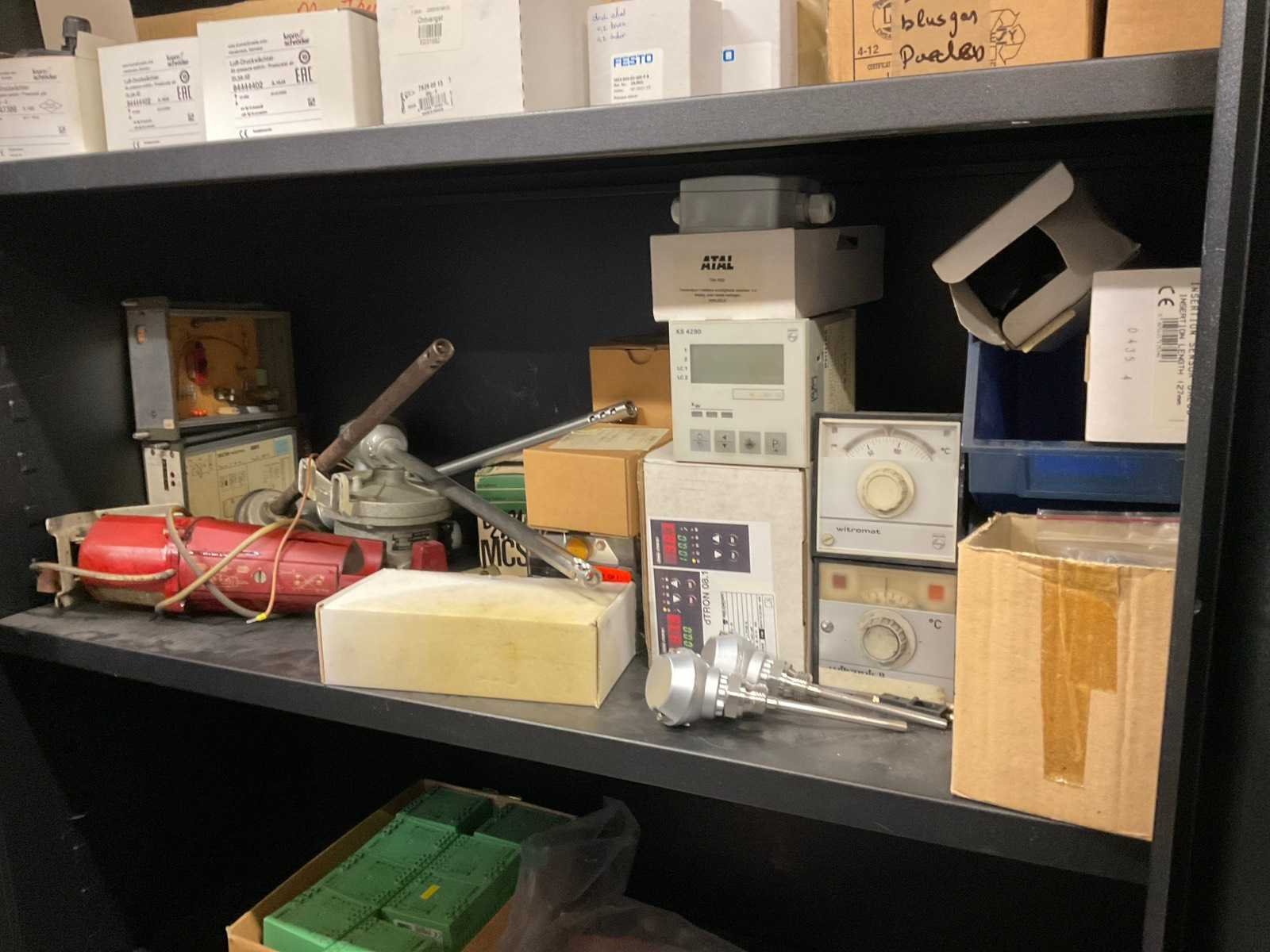 2-deurskast met diverse elektromateriaal, tellers, contacten, sensoren, etc.