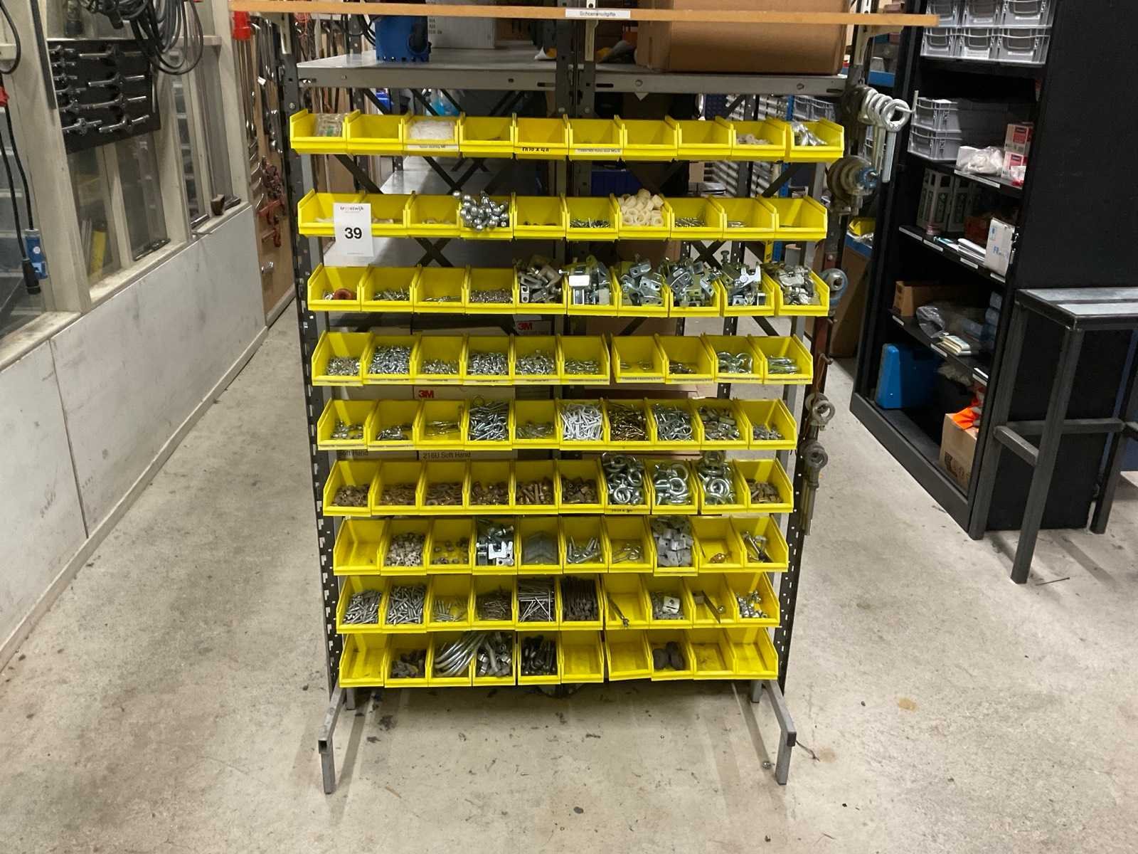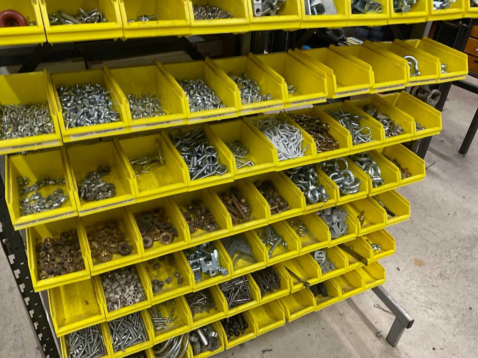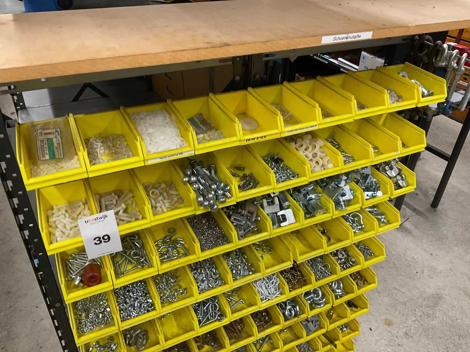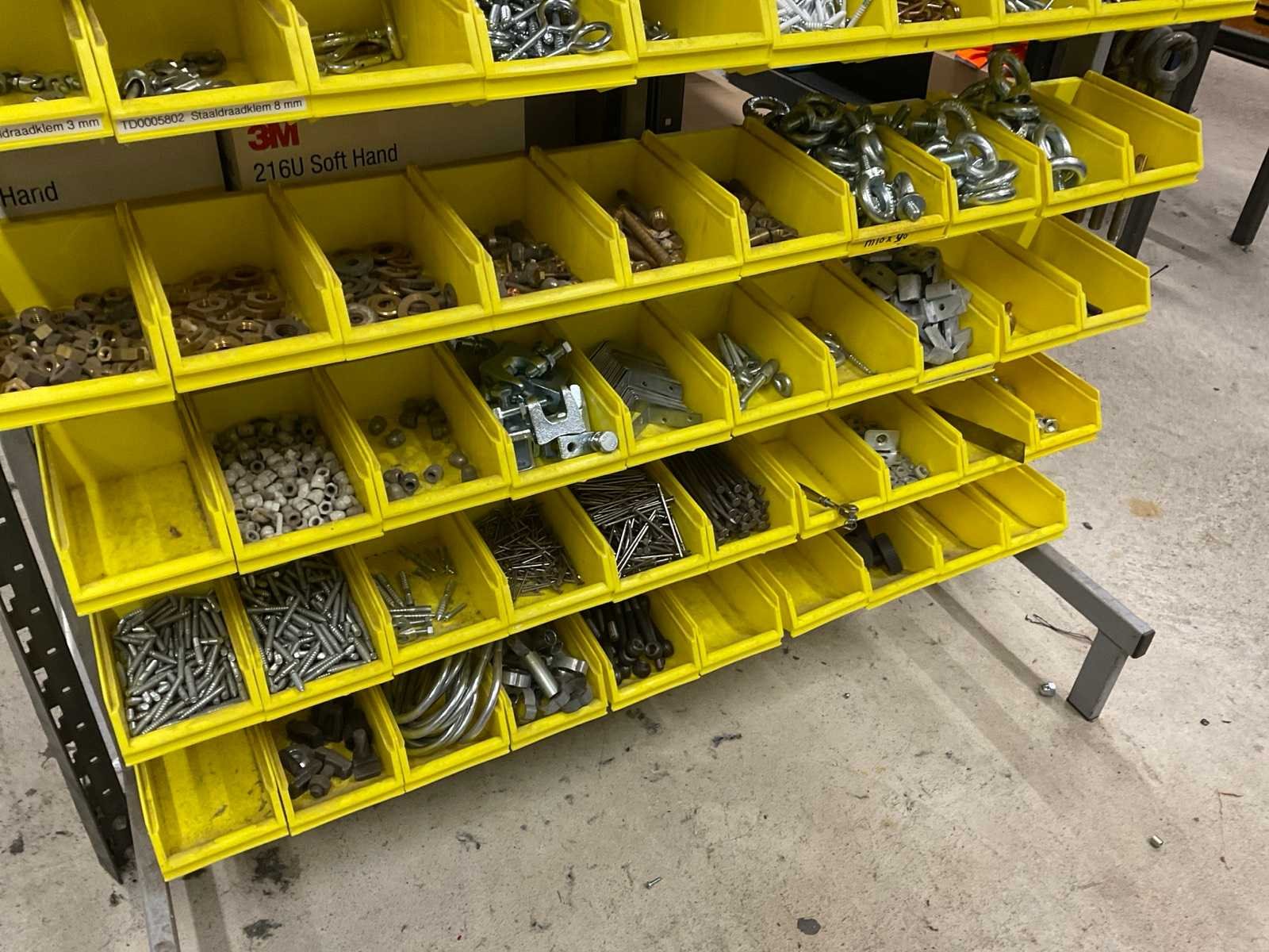 Bestaande uit: bouten, moeren, hijsogen, schroeven. Inclusief: stelling met magazijnbakken.