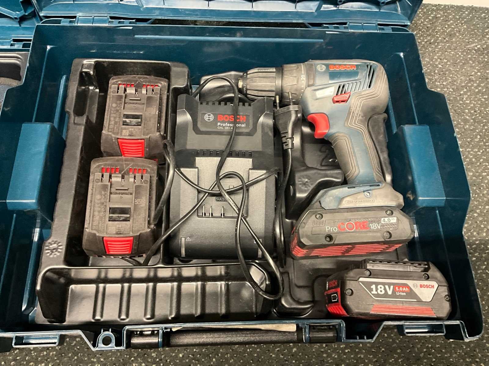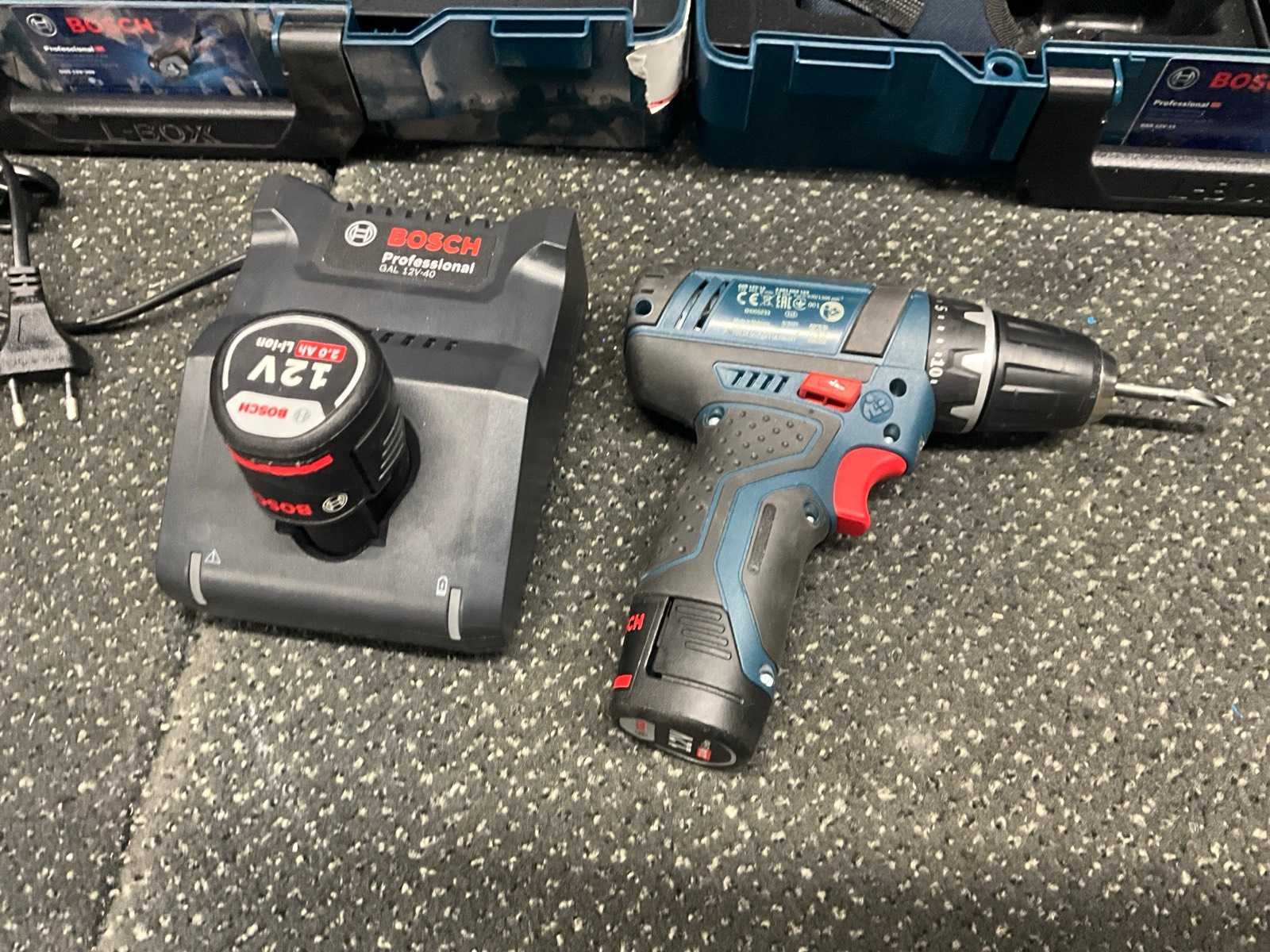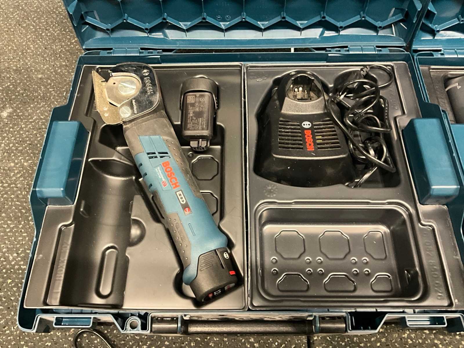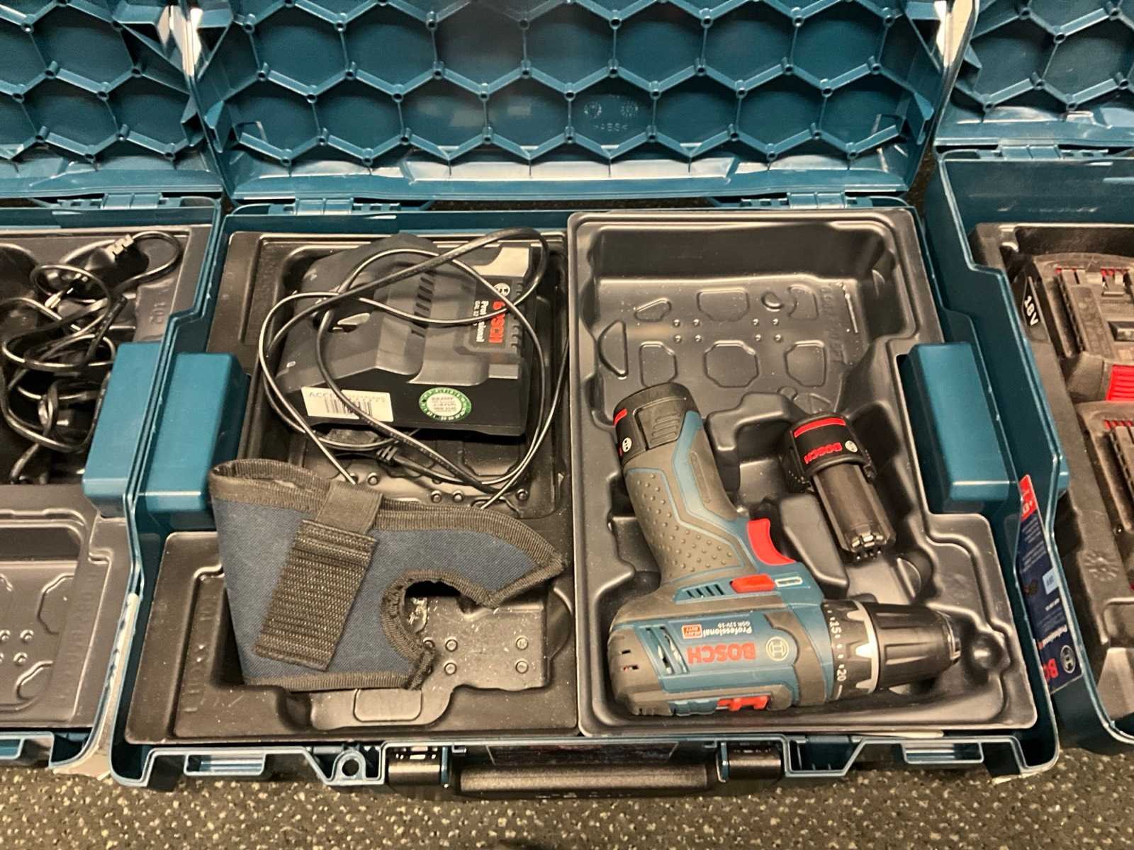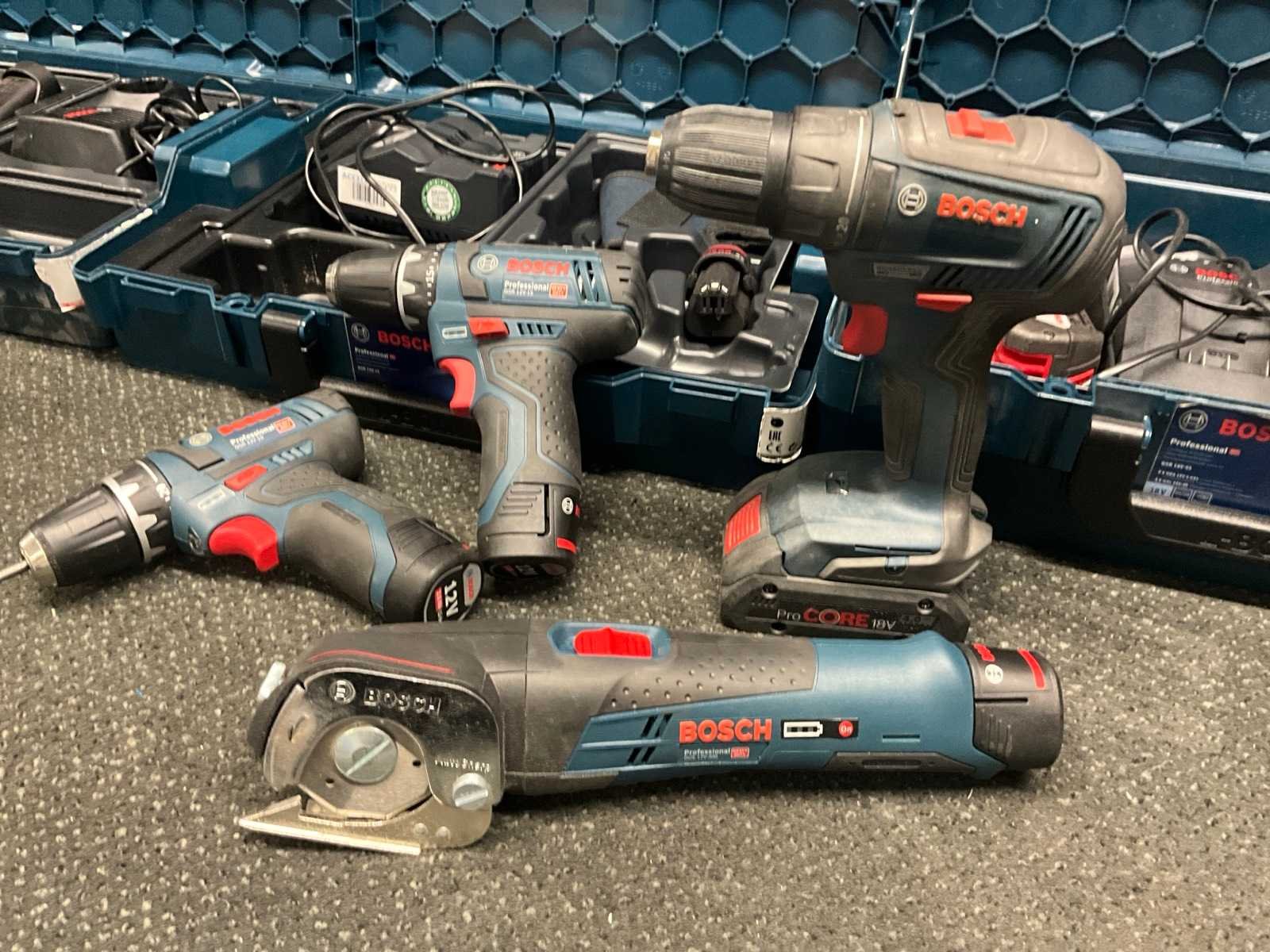 Inclusief “Bosch” accu plaatschaar, 4x lader, 6x 12 v accu, 2x 18 v accu