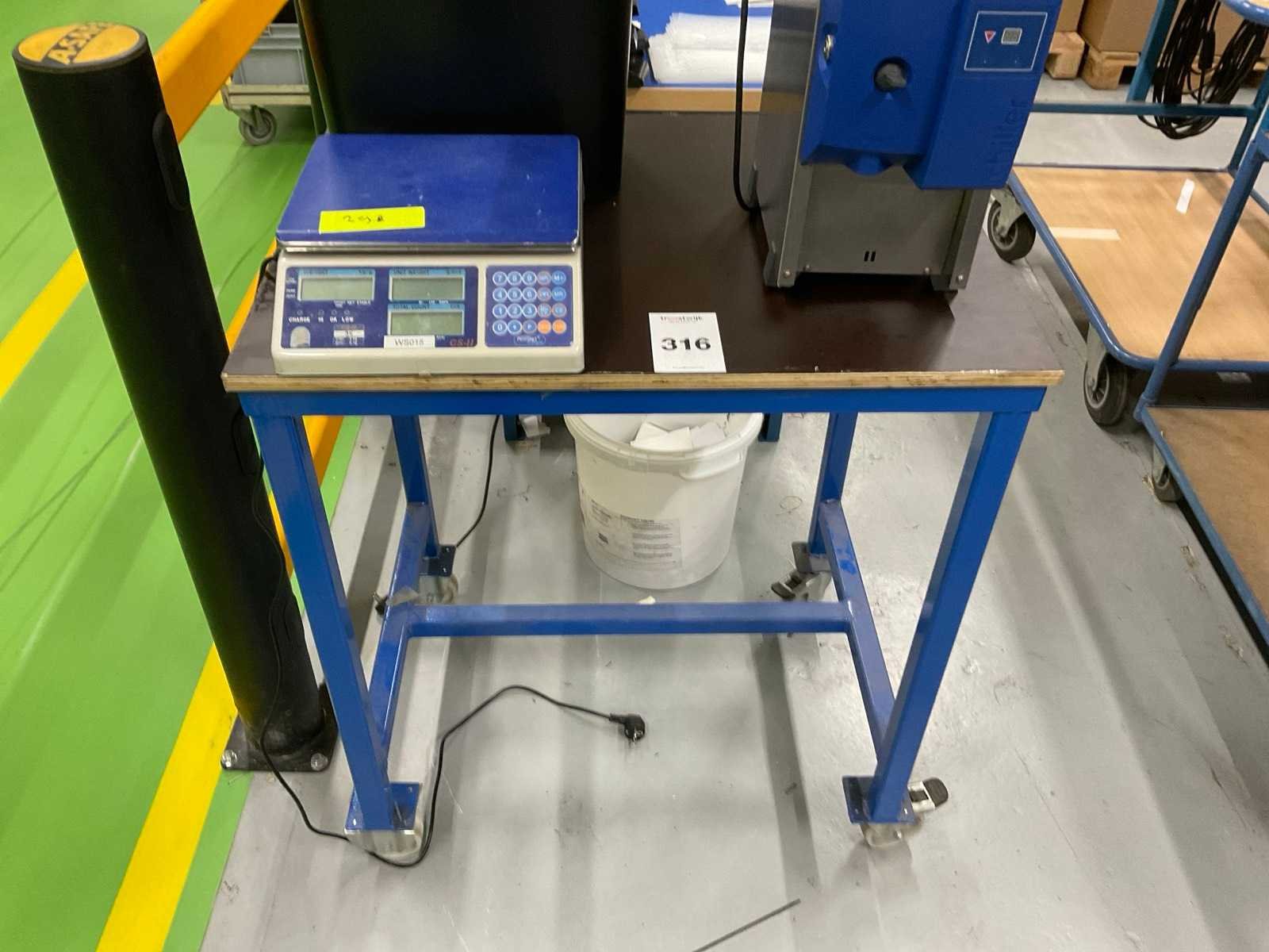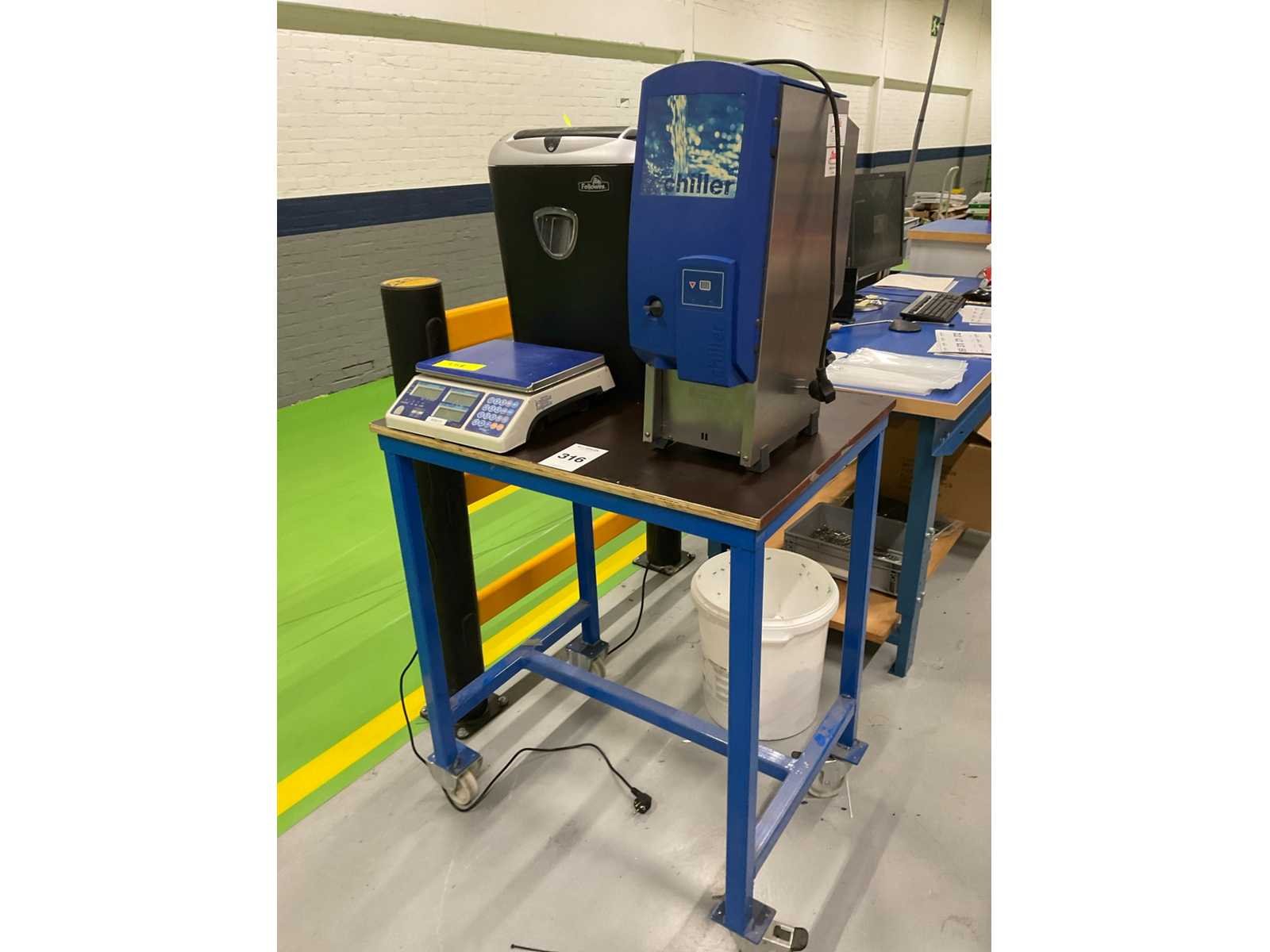 Bestaande uit: (1x) Allscales weegschaal CS-II, (1x) Chiller waterdispenser (incompleet), Fellowes papiervernietiger, (1x) mobiele werktafel 82x62x98cm