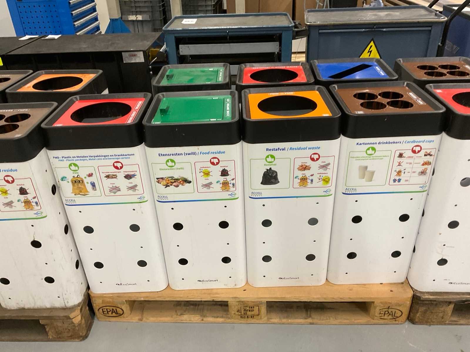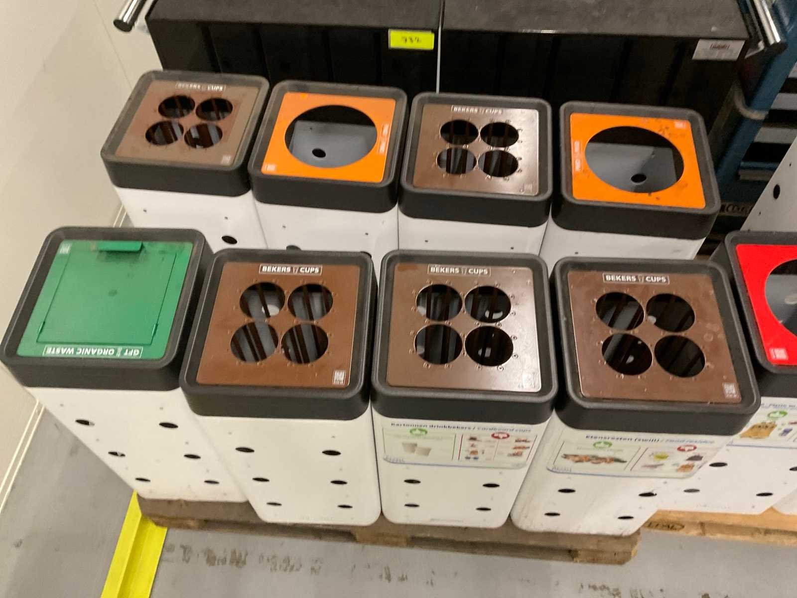 Voor: bekers, Restafval, PMD, Organisch. Op 3 pallets. Merk: EcoSmart Staal: true Kunststof: true Totale afmeting L: 290mm Totale afmeting Breedte: 290mm Totale afmeting Hoogte: 680mm
