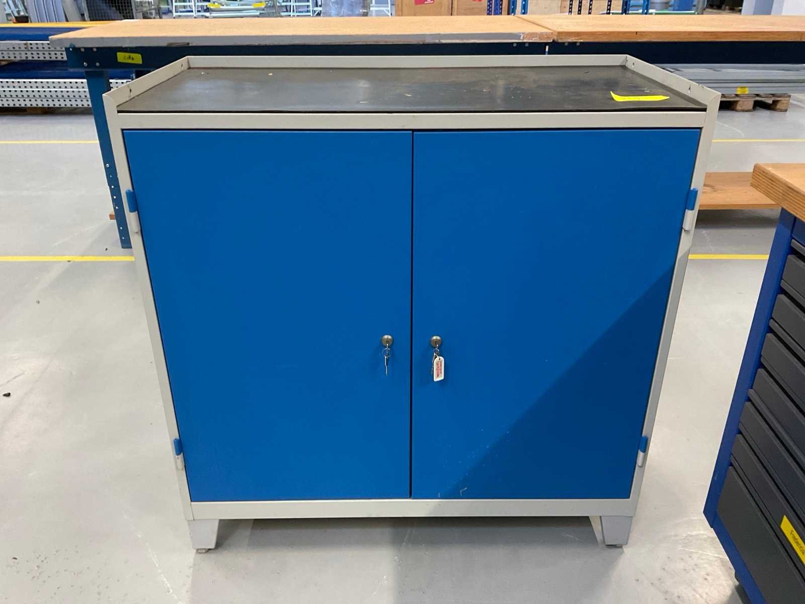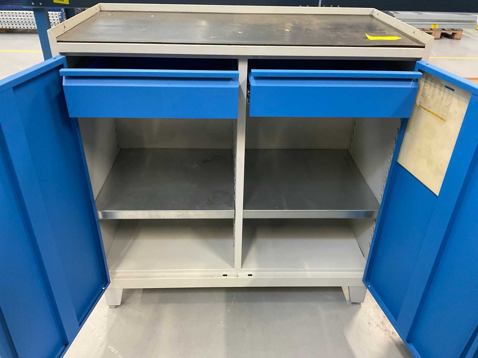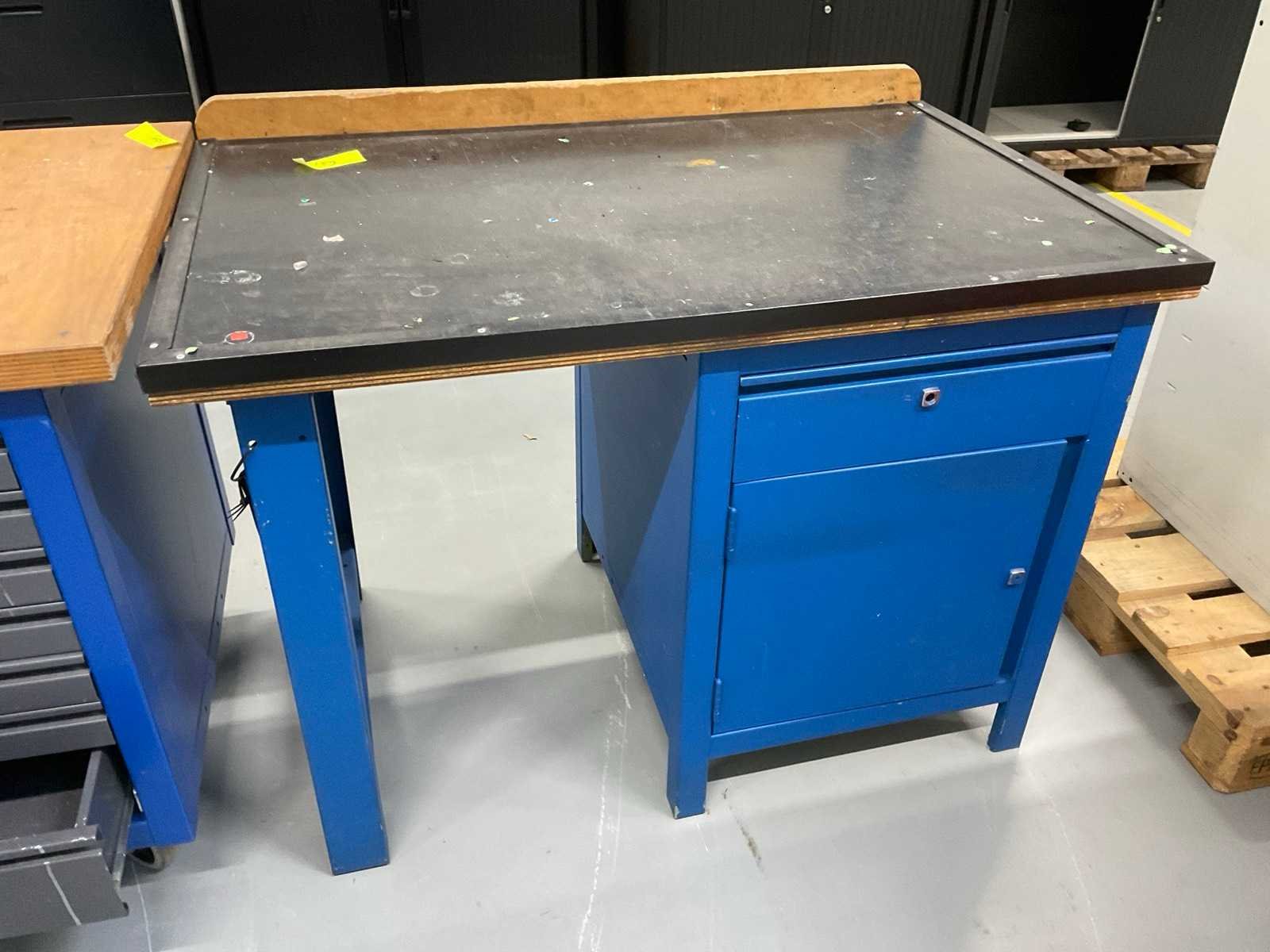 Bestaande uit: (1x) werkbank 150x70cm, (1x) werkbank 120x78cm, (1x) mobiel ladeblok 75x75x89cm, (1x) 2-deurskast 100x50x102cm, (1x) Bott werkplaatskast 75x50x157cm.