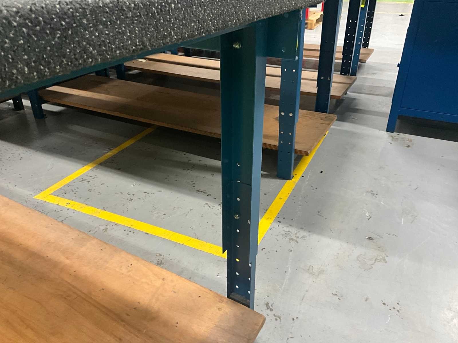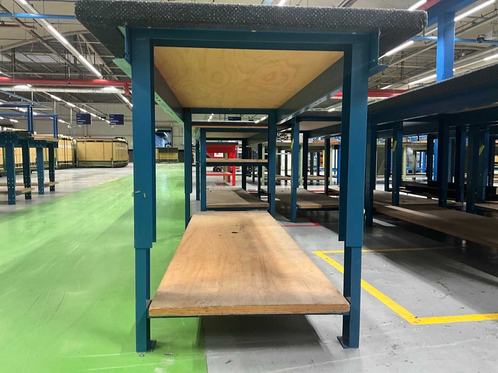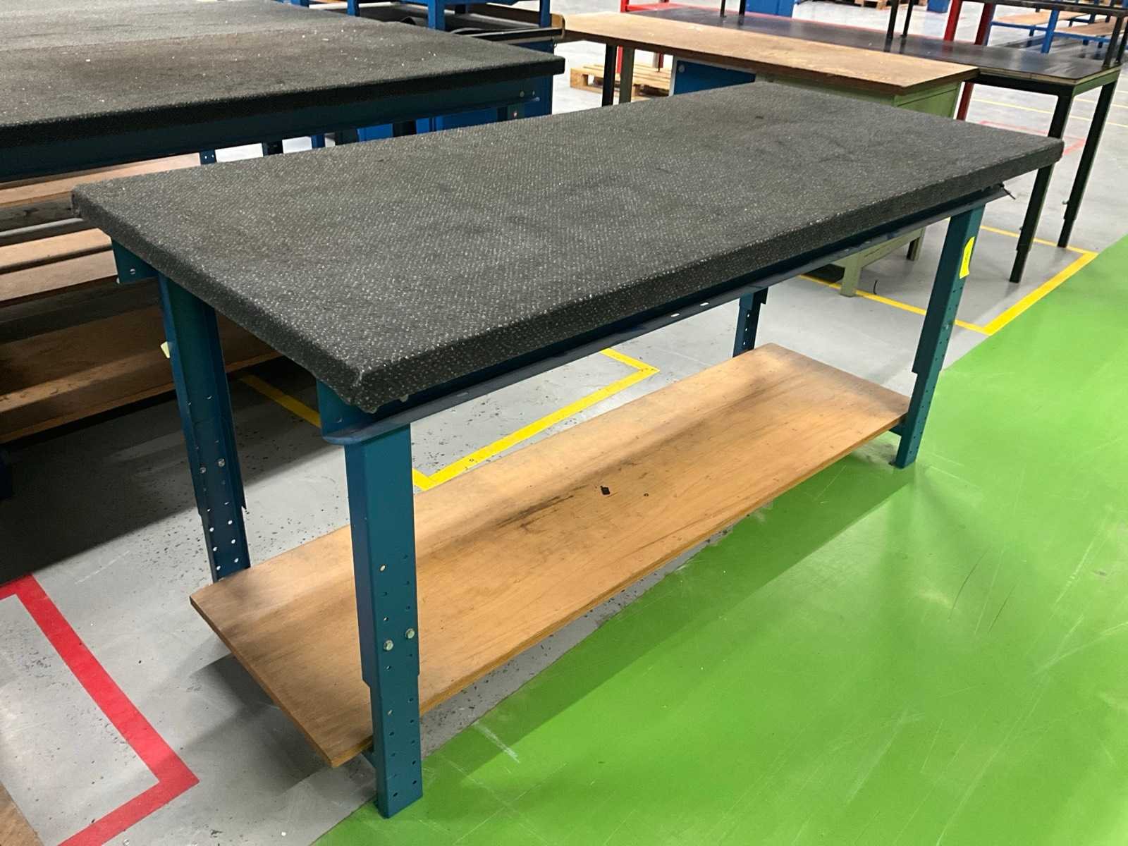 Voorzien van gestoffeerd werkblad, in hoogte verstelbaar, demontabel frame. Breedte: 2000mm Lengte: 900mm Hoogte: 950mm