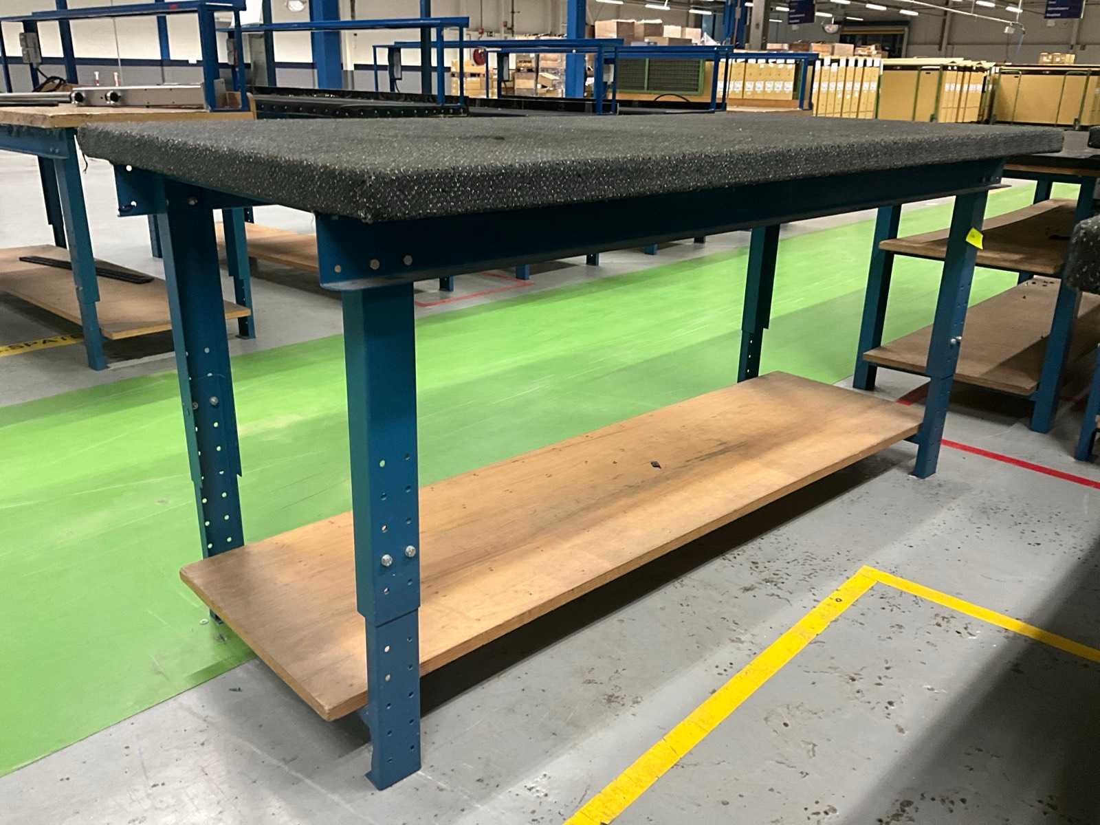 Voorzien van gestoffeerd werkblad, in hoogte verstelbaar, demontabel frame. Breedte: 2000mm Lengte: 900mm Hoogte: 950mm
