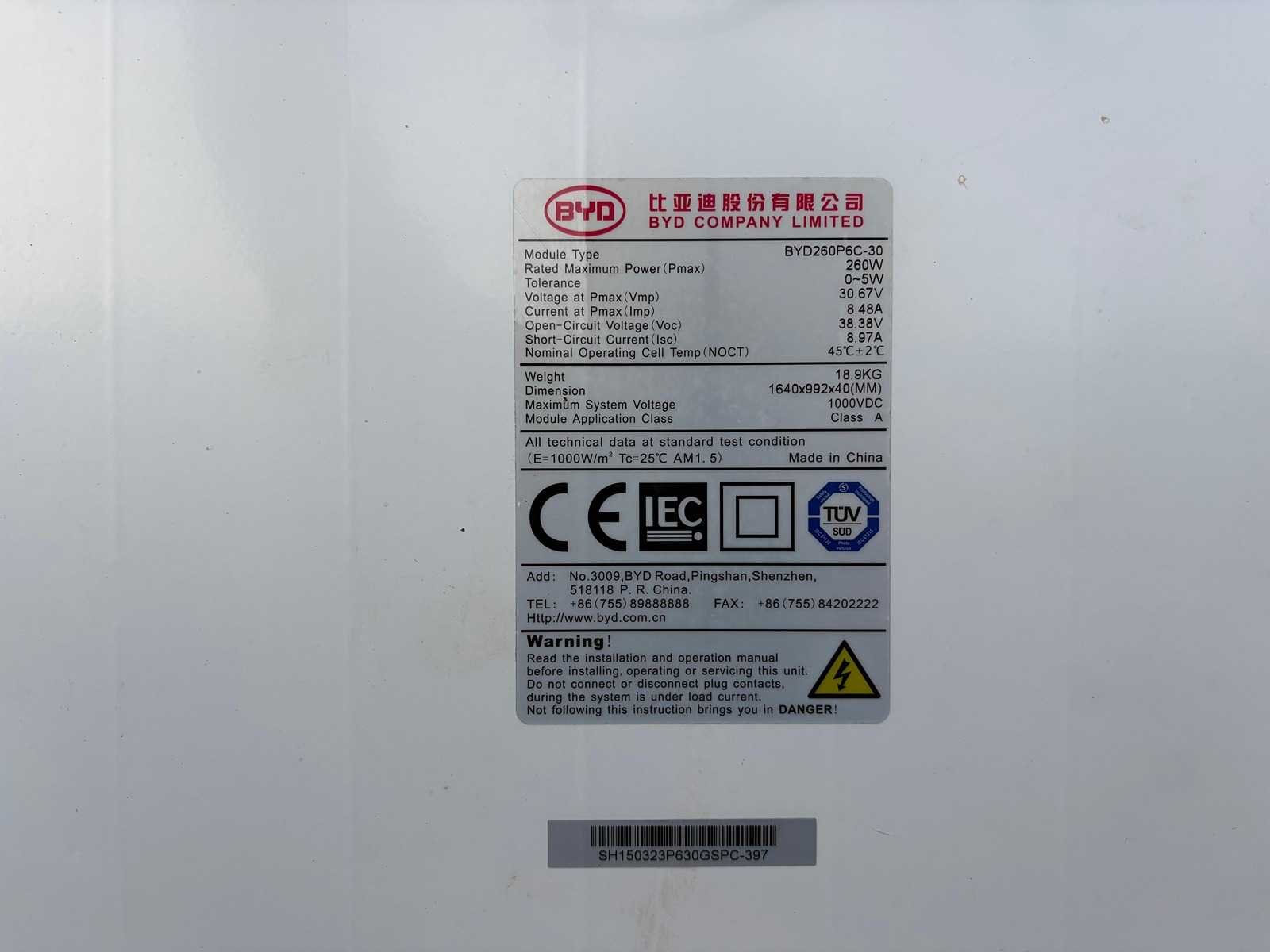 200 gebruikte BYD zonnepanelen vermogen: 260 wp per paneel totaal vermogen: 78.000 Wp De panelen zijn reeds gedemonteerd en gebundeld op 10 pallets van 170x120 cm conditie: gebruikt Merk: BYD Type: BYD260P6C-30 Max. dc power: 260W Eigen gewicht: 19kg Totale afmeting L: 1840mm Totale afmeting Breedte: 992mm Totale afmeting Hoogte: 40mm