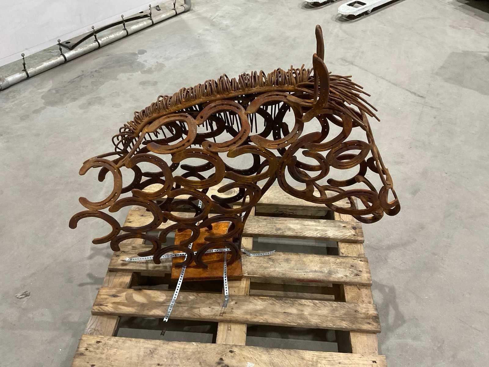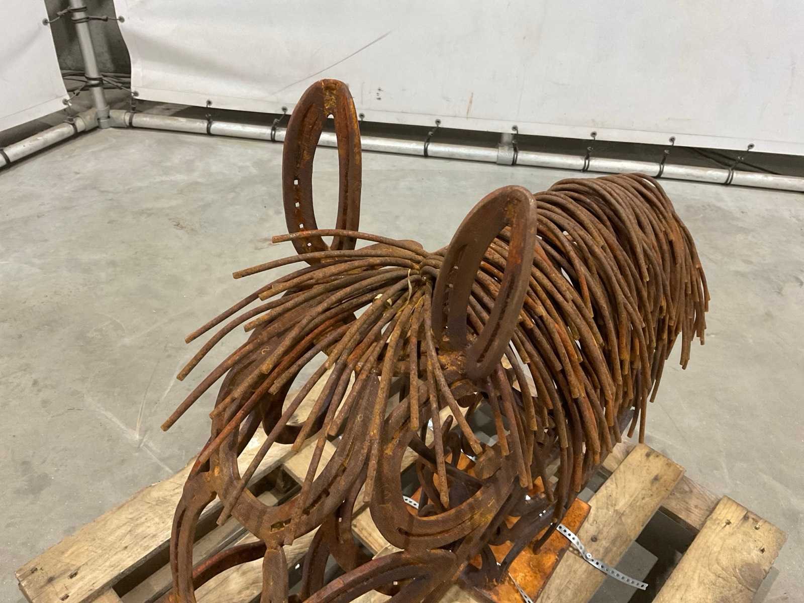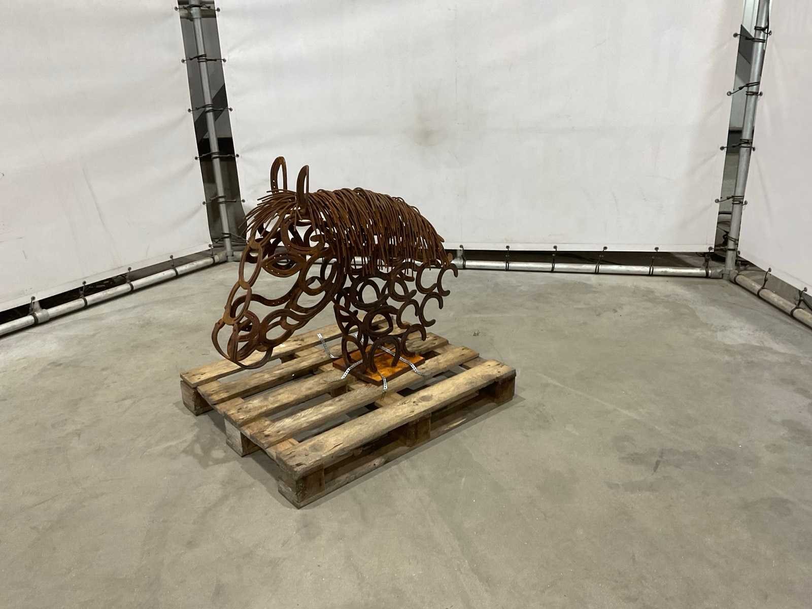 Beeld gemaakt van oude hoefijzers Lengte: 100cm Breedte: 25cm Hoogte: 82cm