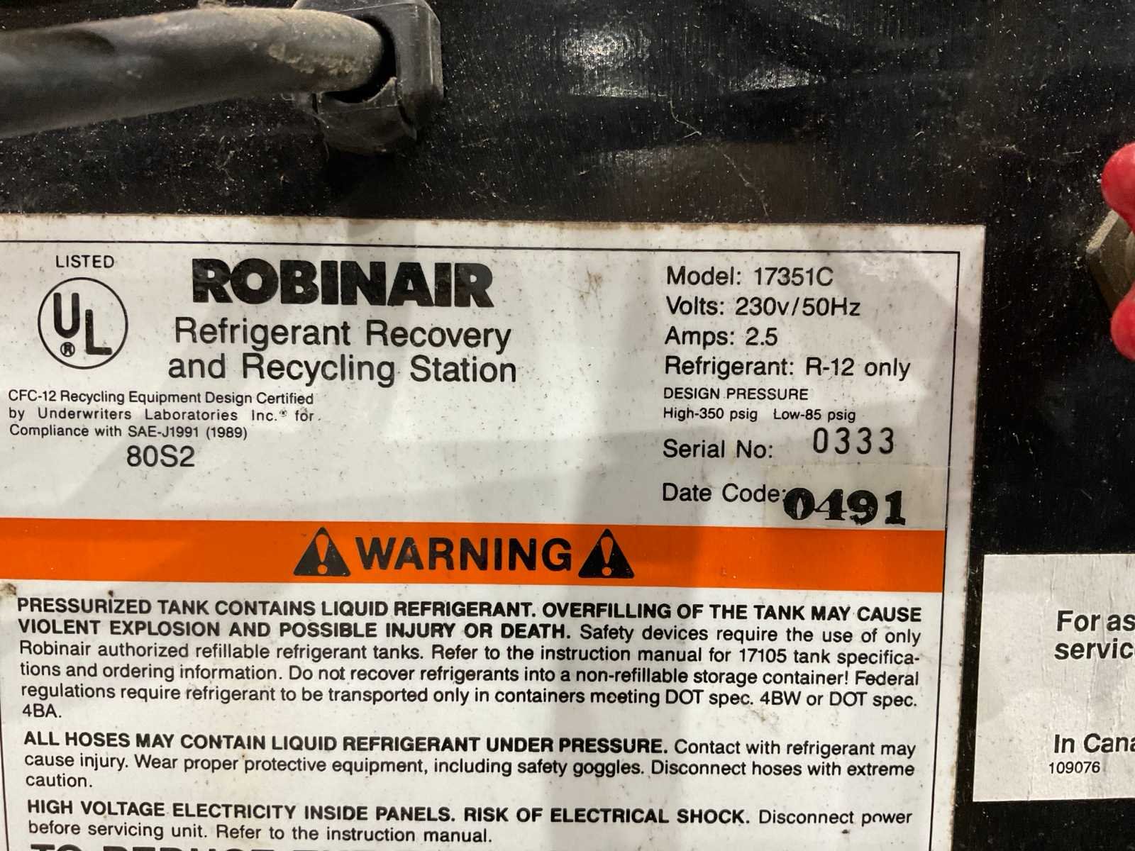 Merk: Robinair Type: 17351C Serienummer: 0333 Aansluiting: 220V Totale afmeting Breedte: 450mm Totale afmeting Hoogte: 1160mm