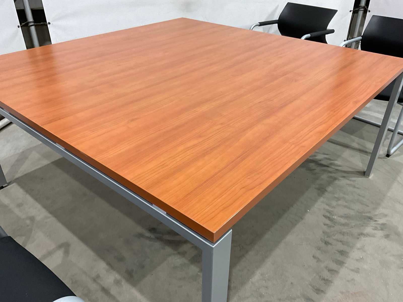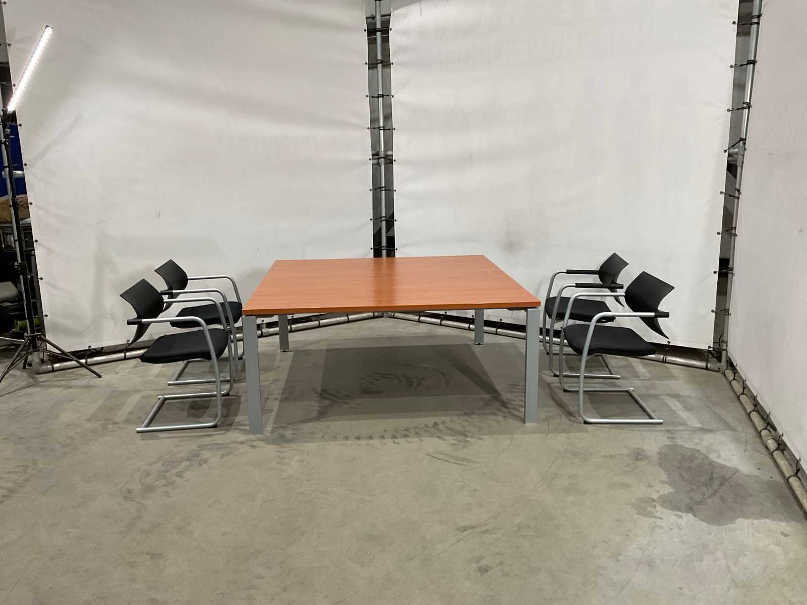 Tafel met kersen houten tafelblad; poten kleur aluminium; stoelen met armleuningen; merk air junior ; rug van kunststof Merk: Gilder Kleur: Kers Lengte: 164cm Breedte: 164cm Hoogte: 73.5cm
