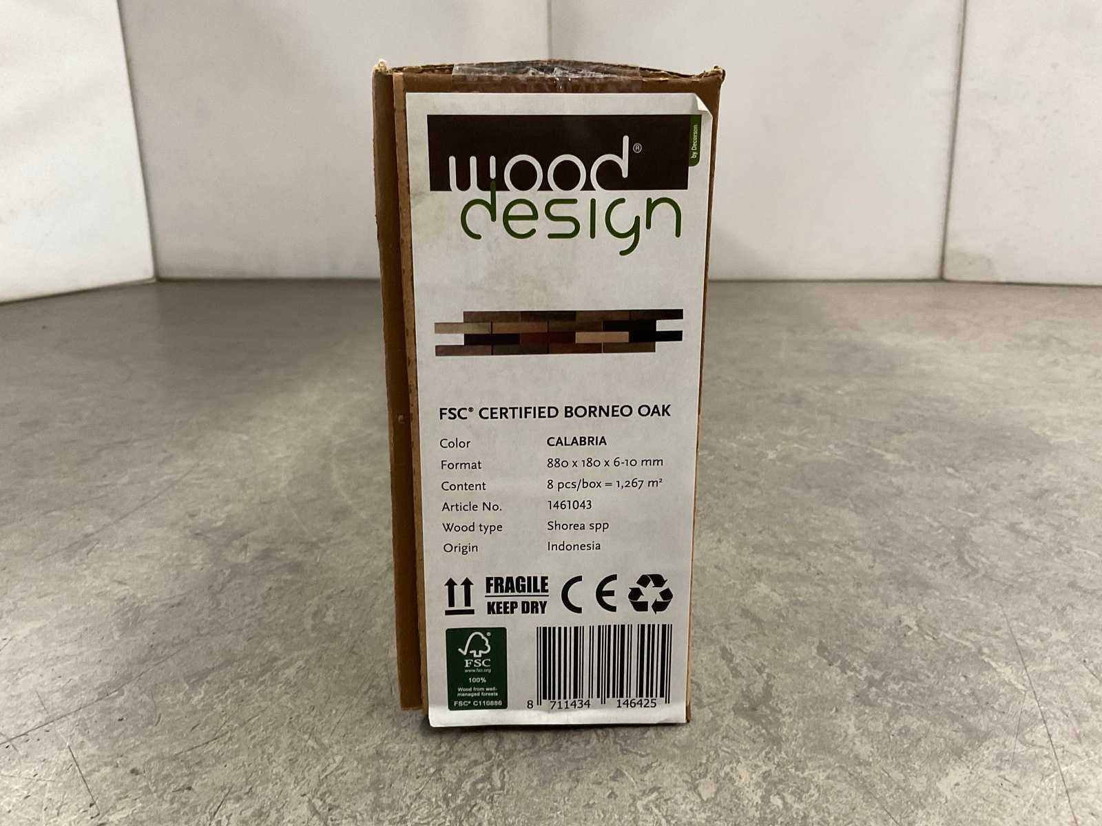 Wandpaneel Borneo Calabria shoreahout met een inhoud per doos van 1.267m². Dit product is voorzien is van het FSC keurmerk en bevat 8x 3D Houtstrips per doos. Bezorgtermijn 7 dagen Merk: Decor Model: Borneo Kleur: Calabria Lengte: 18cm Breedte: 88cm Hoogte: 0,6-1cm Materiaal: Shoreahout (eiken)