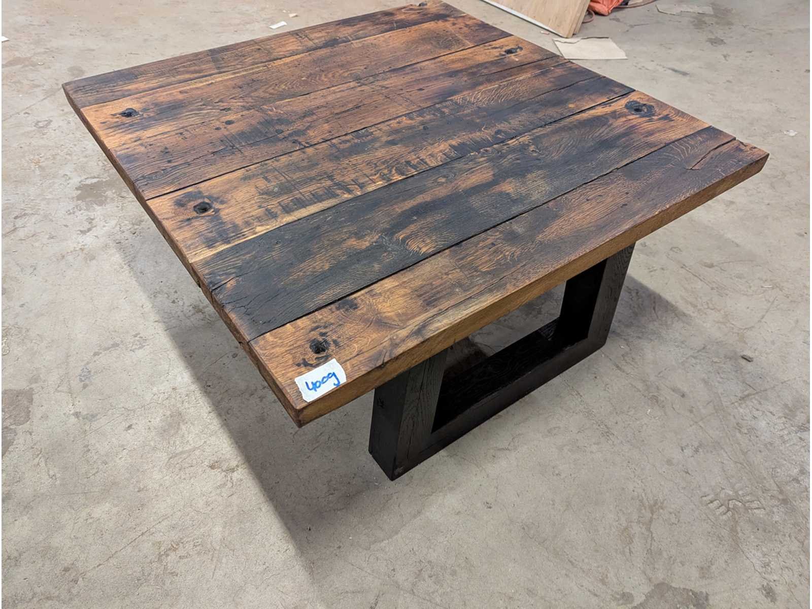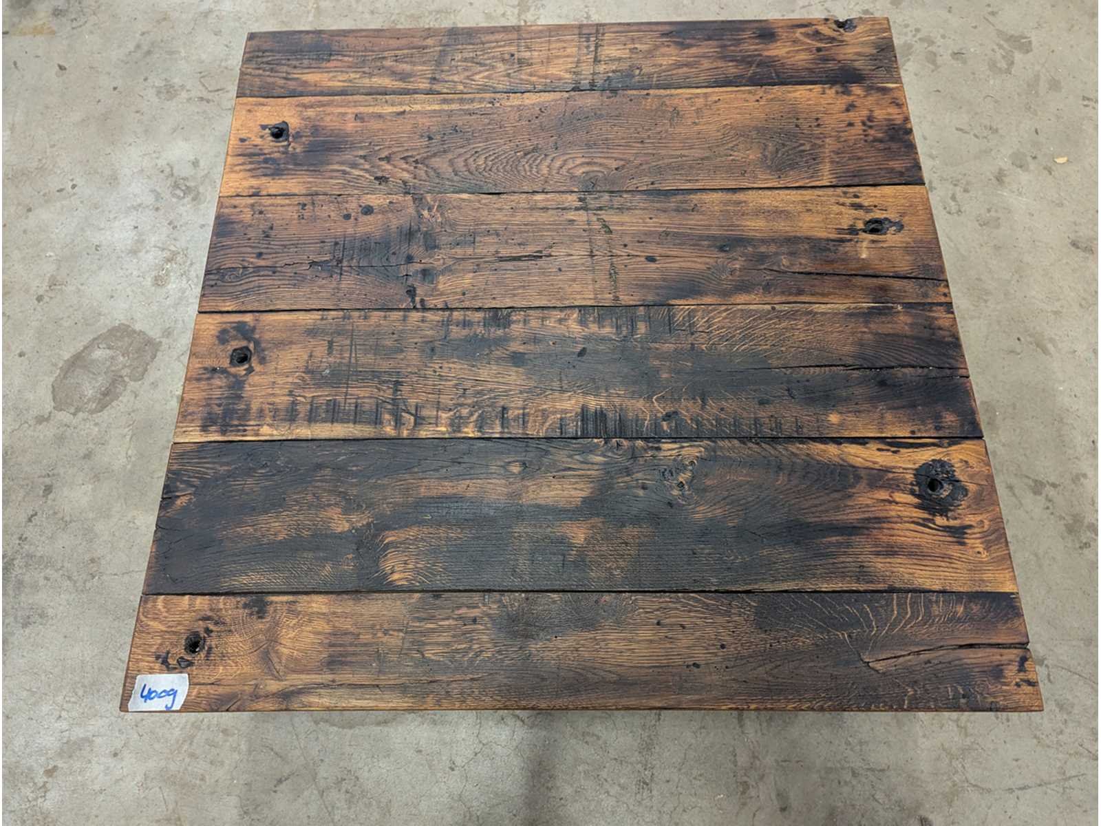 Salontafel oud eiken met zwart onderstel Materiaal: Eiken Lengte: 95cm Breedte: 95cm Hoogte: 45cm