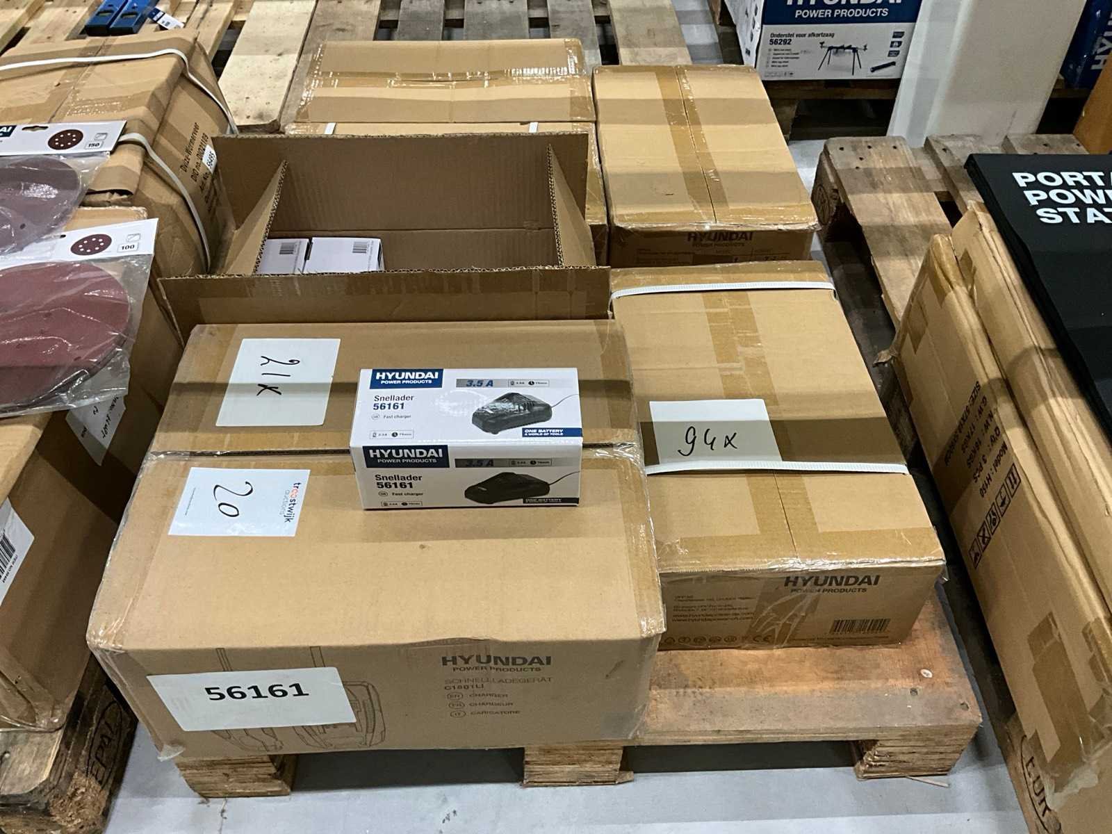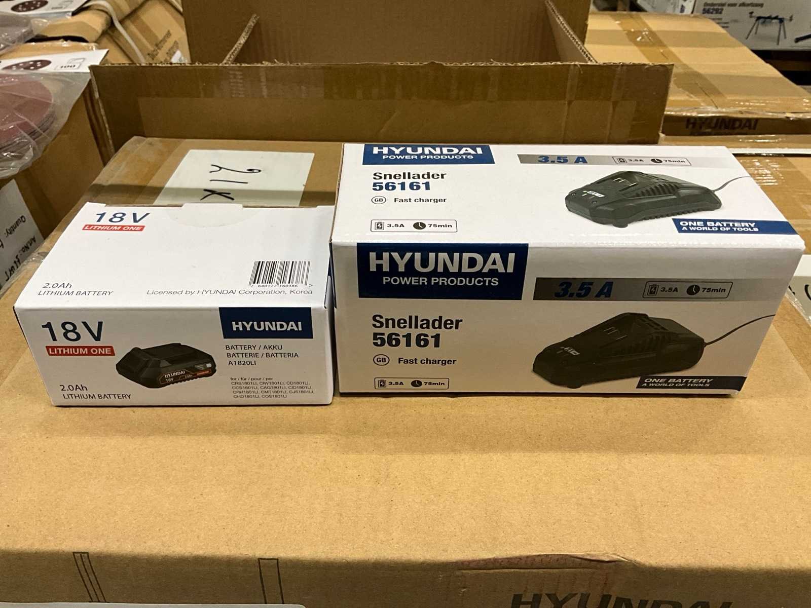 Bestaande uit: 94x Hyundai 56163 18V 2.0Ah accu en 21x Hyundai 56161 20V 3.5A snellader Merk: Hyundai Type: 56161/56163
