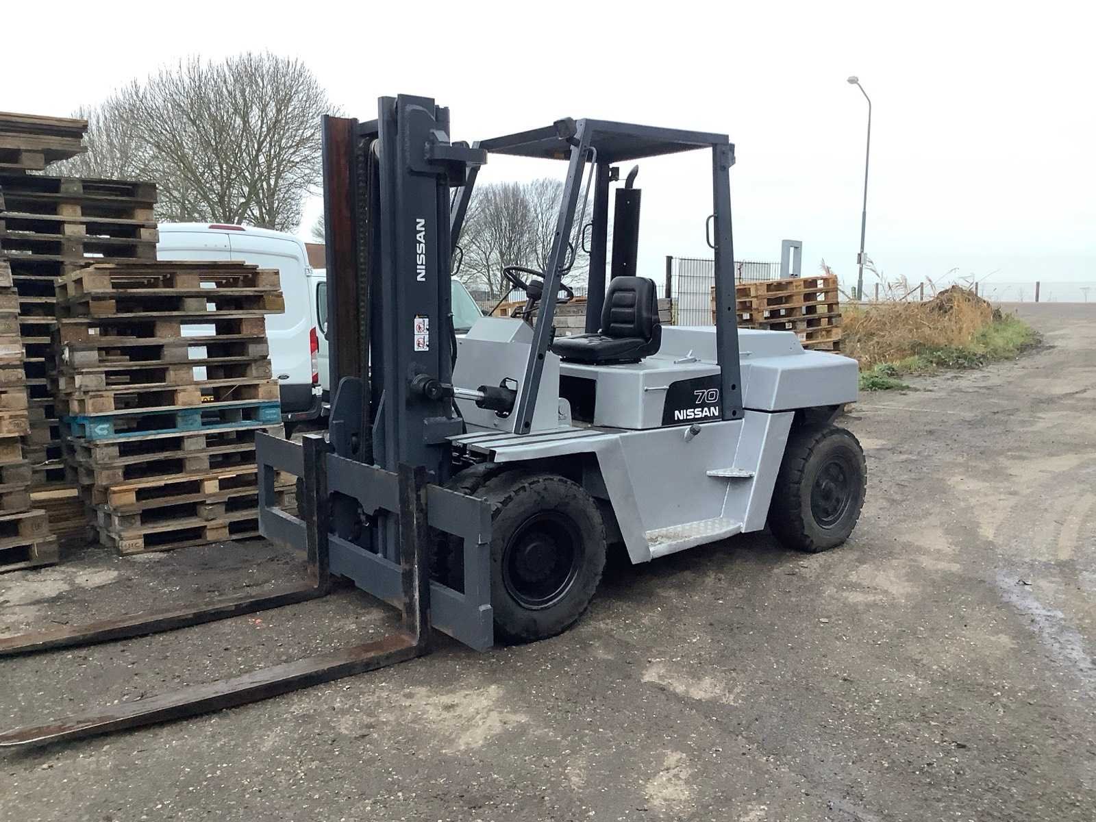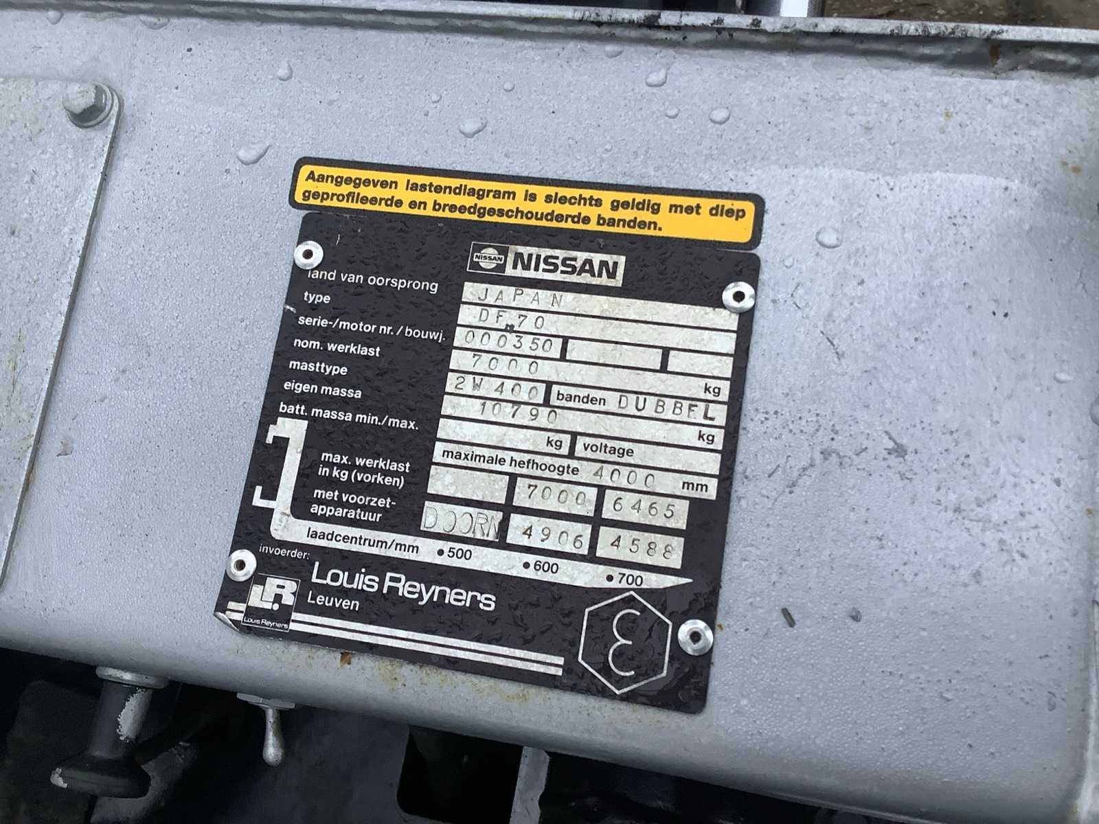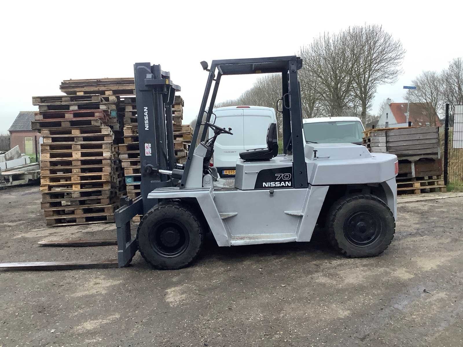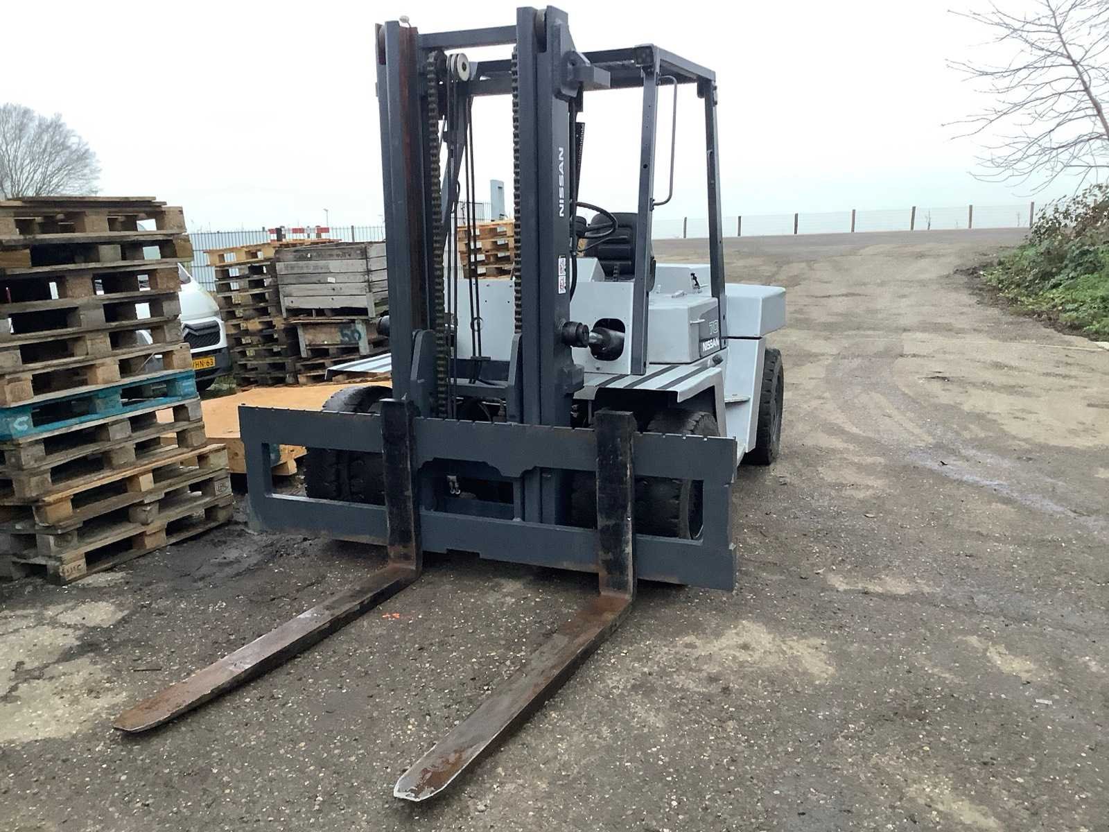 Op werking getest voert alle alles uit Merk: Nissan Type: df70 Brandstof: Diesel Mast: Duplex Soort band: Luchtbanden Aantal wielen: 4 Afgelezen urenstand: 1733 Duplex mast: true Eigen gewicht: 10750kg Hefvermogen: 7000kg Lepellengte: 1500mm Max. hefhoogte: 4000mm Luchtbanden: true Minimale doorrijhoogte: 2600mm