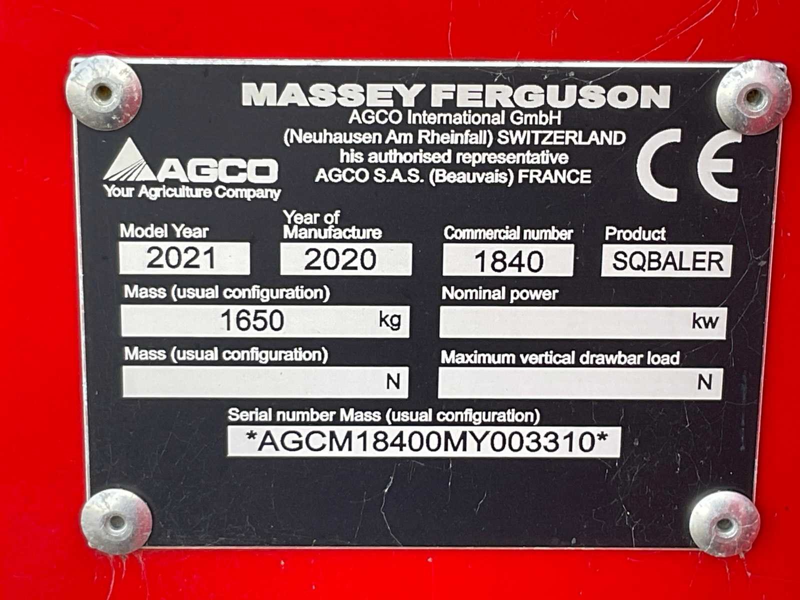 Chassisnummer: AGCM18400MY003310. Baal grootte: 356x457 mm. Inclusief aftakas. Merk: Massey ferguson Type: 1840 Bouwjaar: 2020 Serienummer: AGCM18400MY003310 Kenteken: LNP-38-L Werkbreedte pick-up: 1900mm Eigen gewicht: 1650kg Totale afmeting L: 6000mm Totale afmeting Breedte: 2350mm Totale afmeting Hoogte: 1750mm